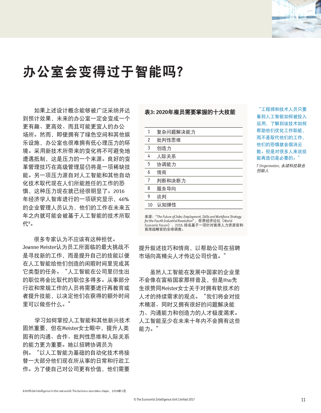 不过,报告同时指出,相比抢走人类“饭碗”,人工智能更有可能将一些日常和行政工作自动化,从而允许员工更多专注于增进效益的活动,提升“软技能”。在此情况下,未来职场岗位将更强调交流、互动和创造性思考能力等人类特有的能力。
