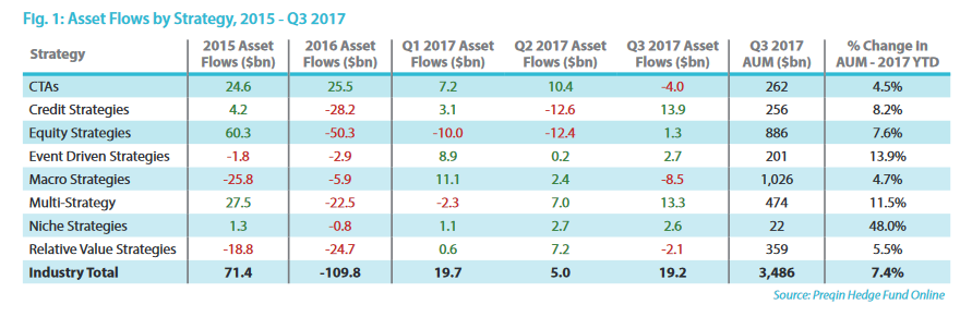 Preqin发布了2017年第3季度对冲基金资产流动数据。