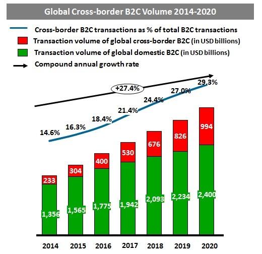 埃森哲-阿里研究(Accenture-AliResearch)表示,到2020年中国将成为中国最大的跨境B2C市场,网上进口商品的交易量达2450亿美元。报告预测,五年内将有超过两亿中国消费者进行跨境购物消费。