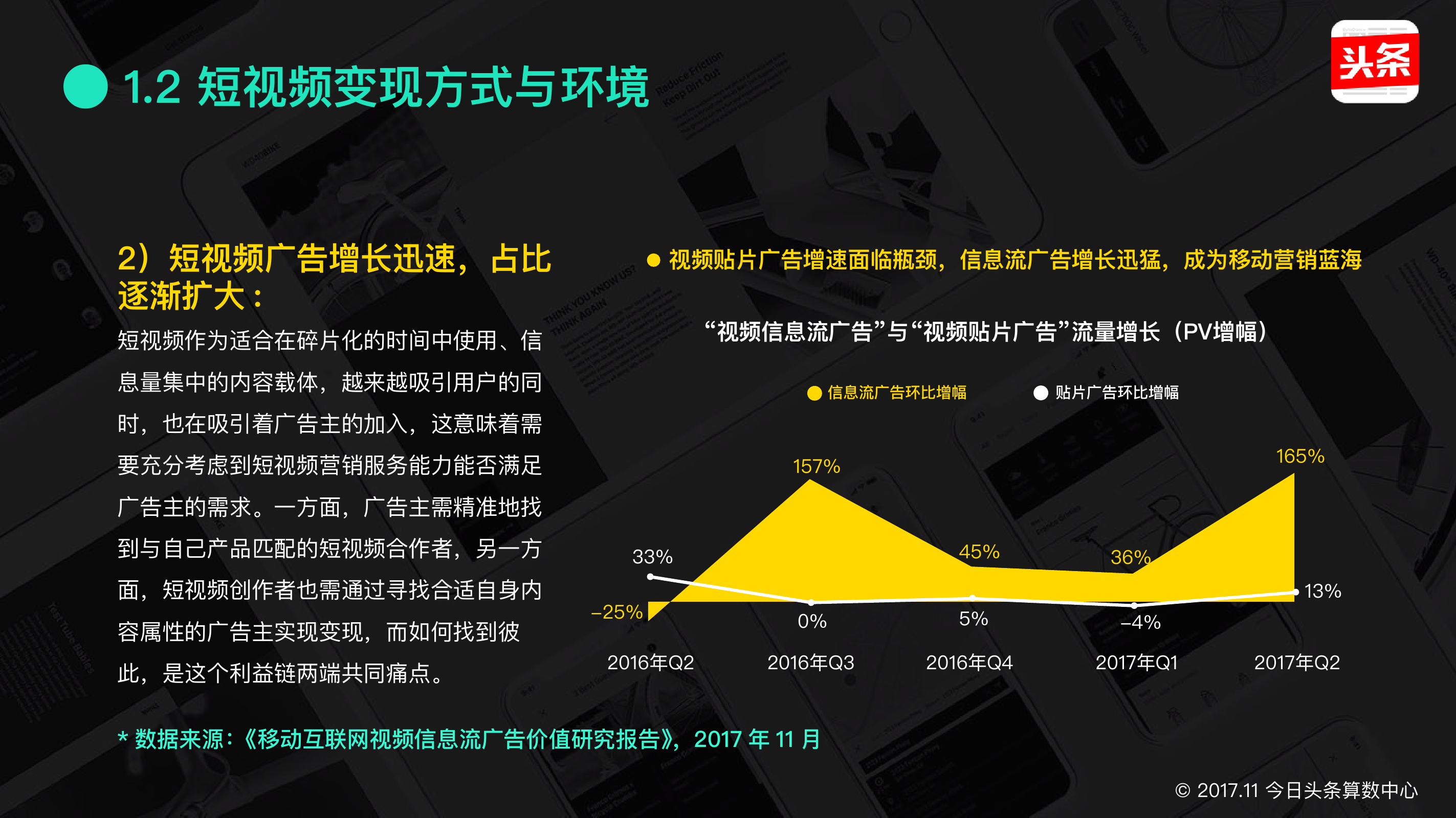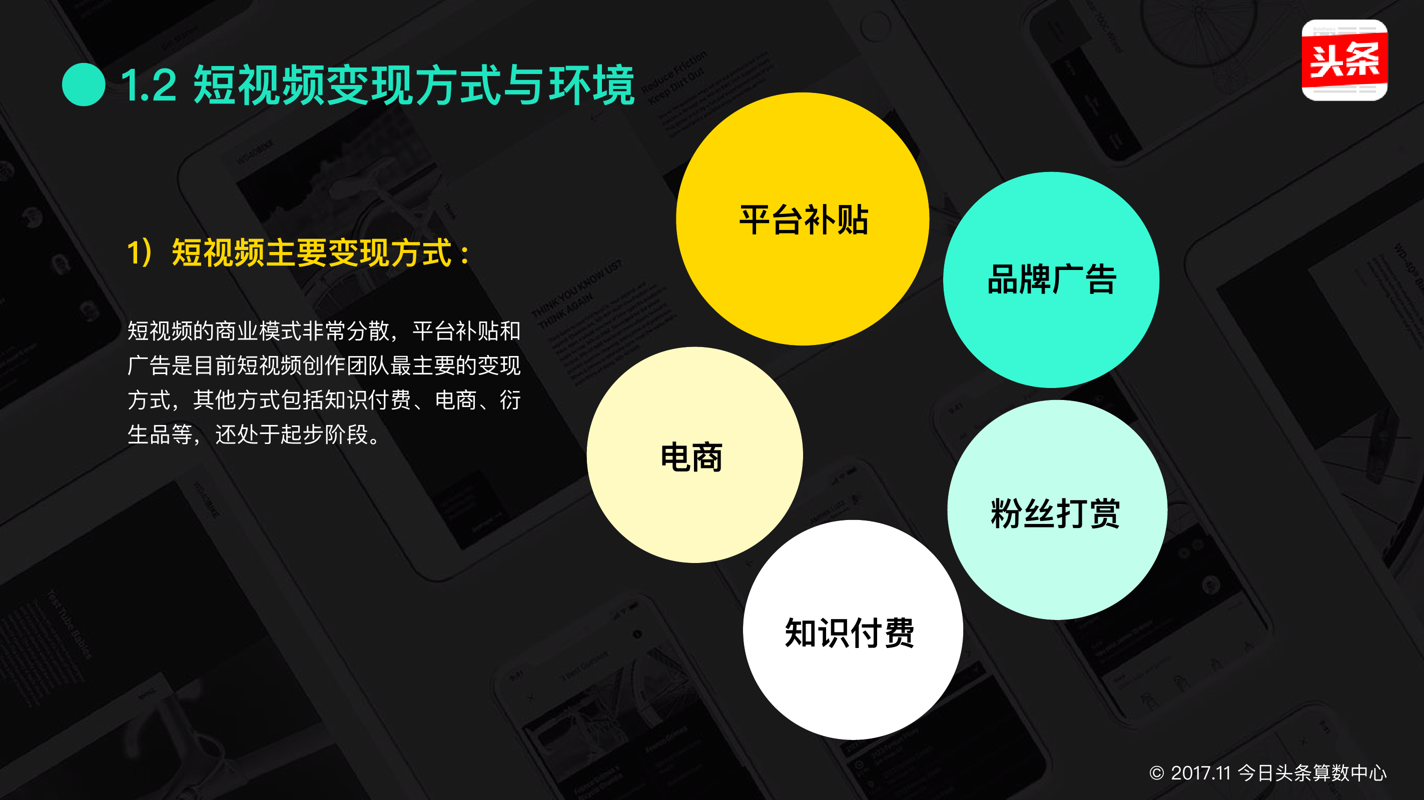 如何在诱人的红利和变现难的迷雾中,闯出一片天地?今日头条算数中心推出《短视频创作者商业变现报告》,帮短视频创作者探索一条适合自己的商业变现道路。