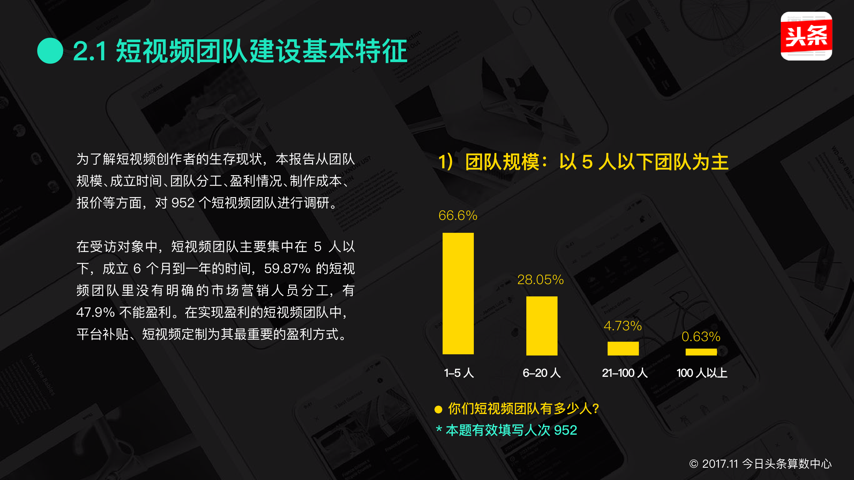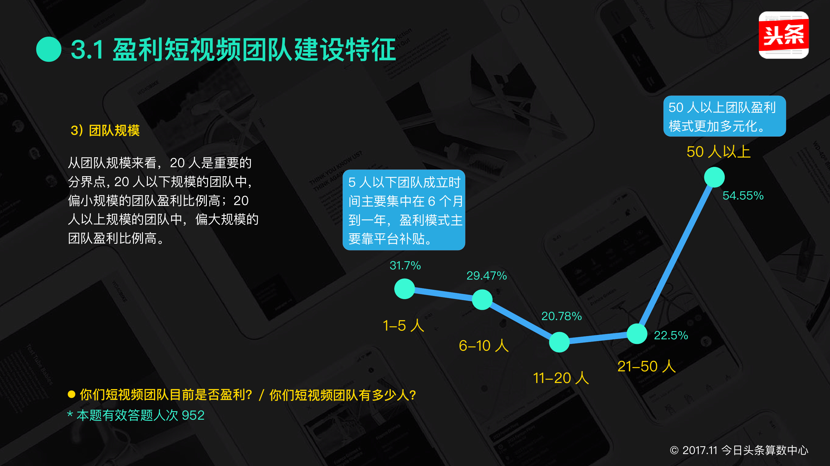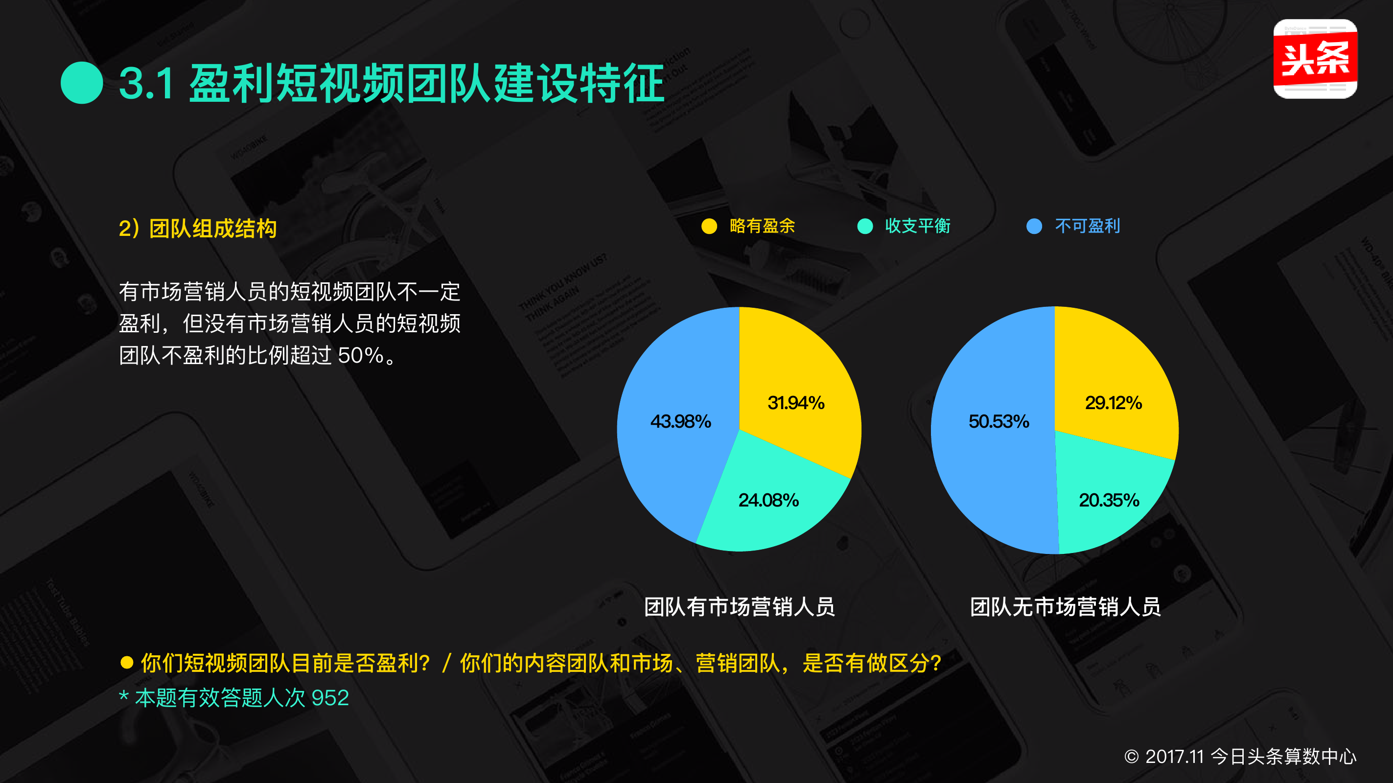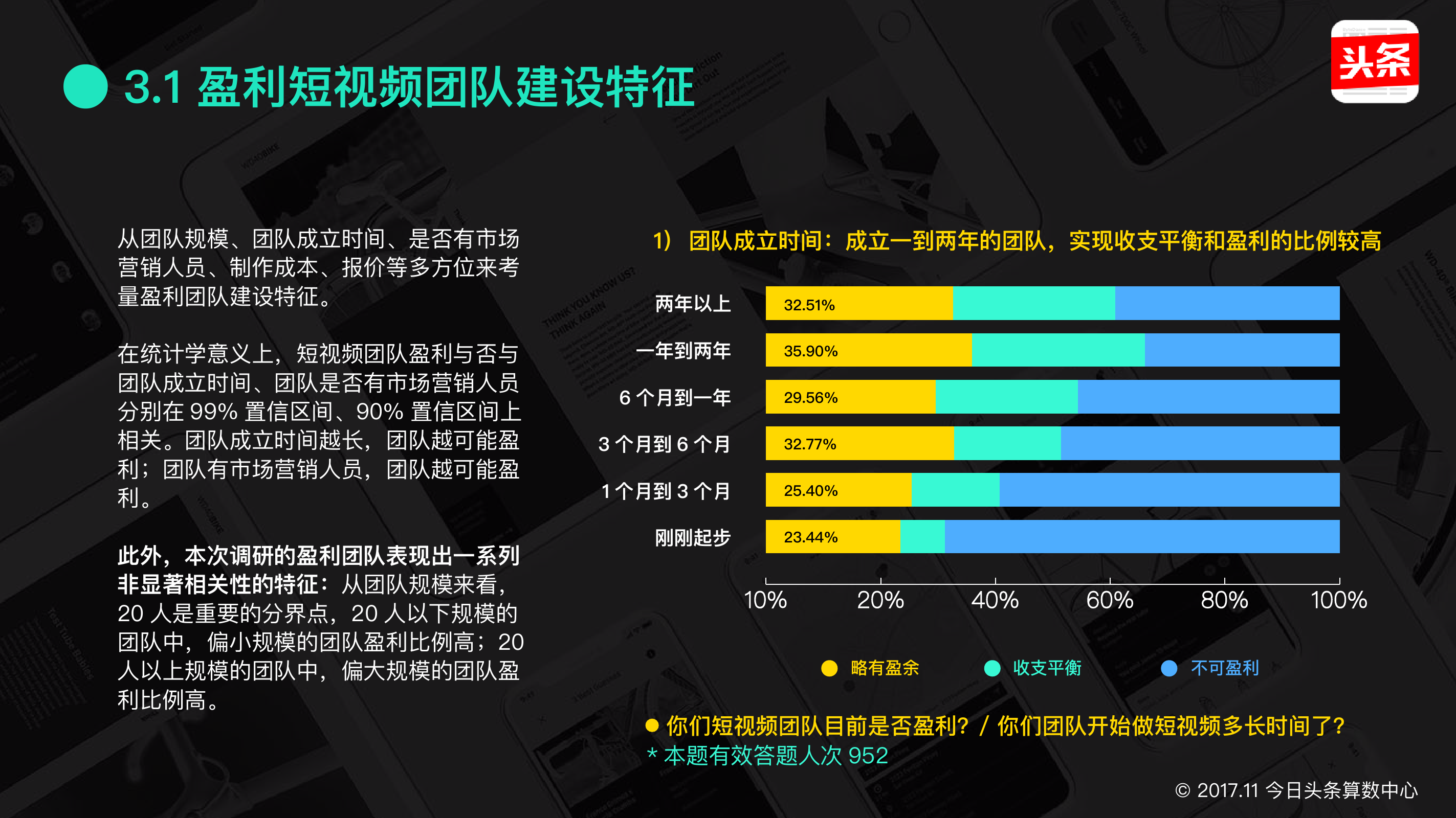 虽然这个行业里不乏办公室小野、陈翔六点半,但这份报告指出,在调研的952个优质短视频团队中,47.9%的团队还不能盈利。