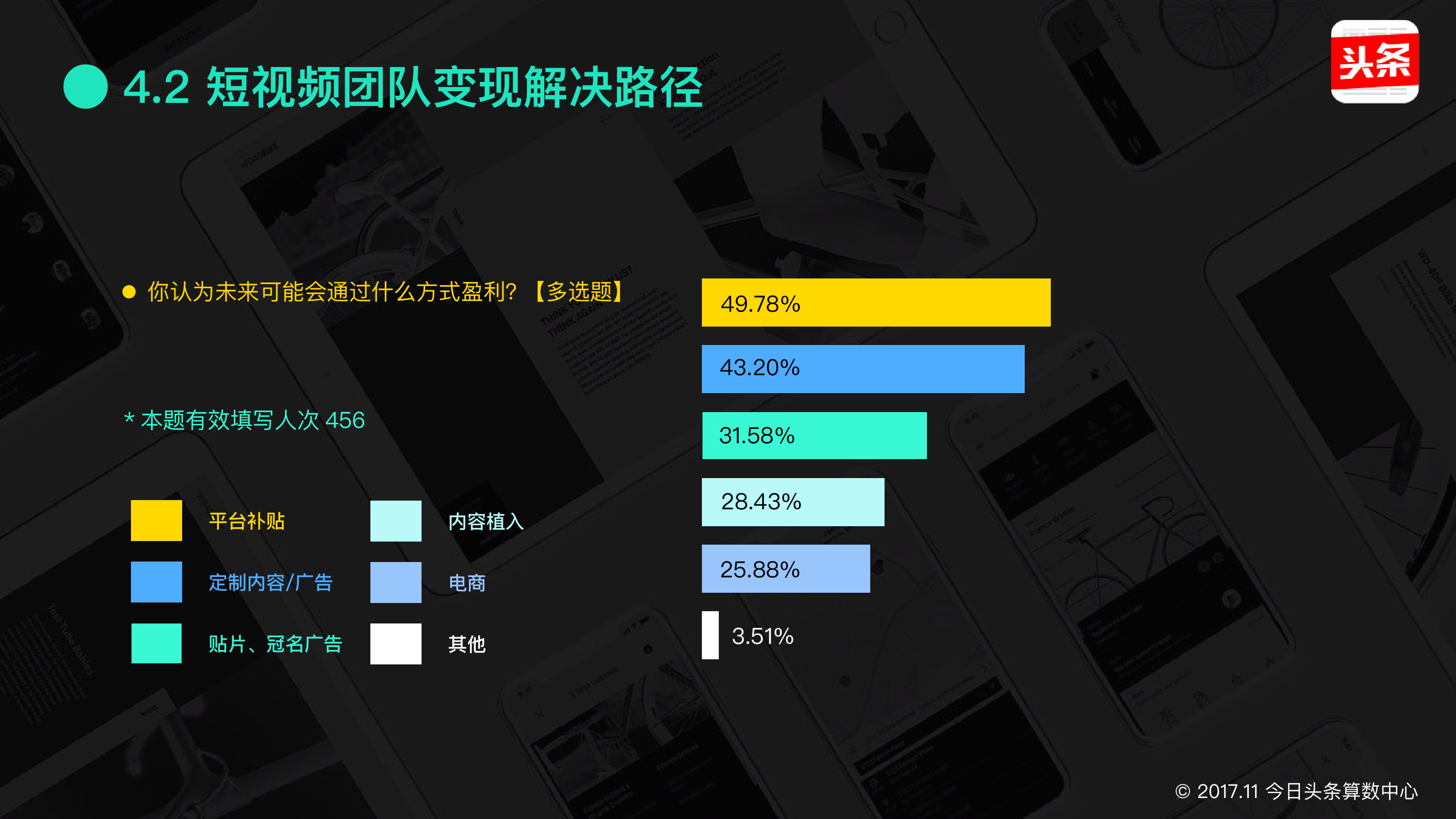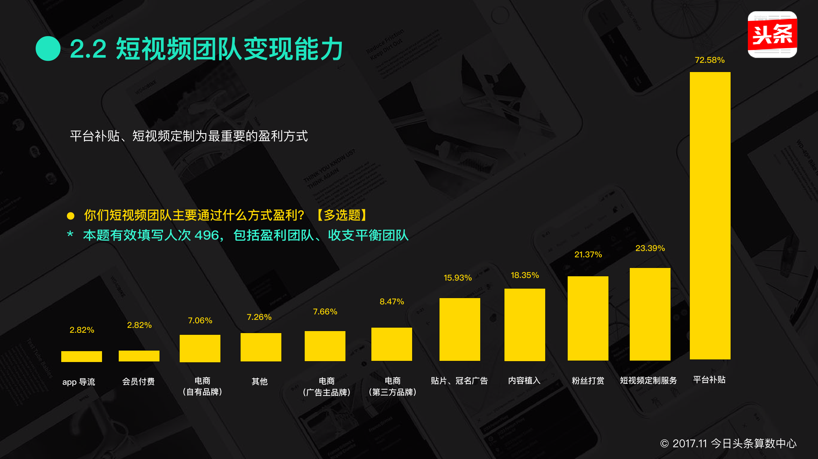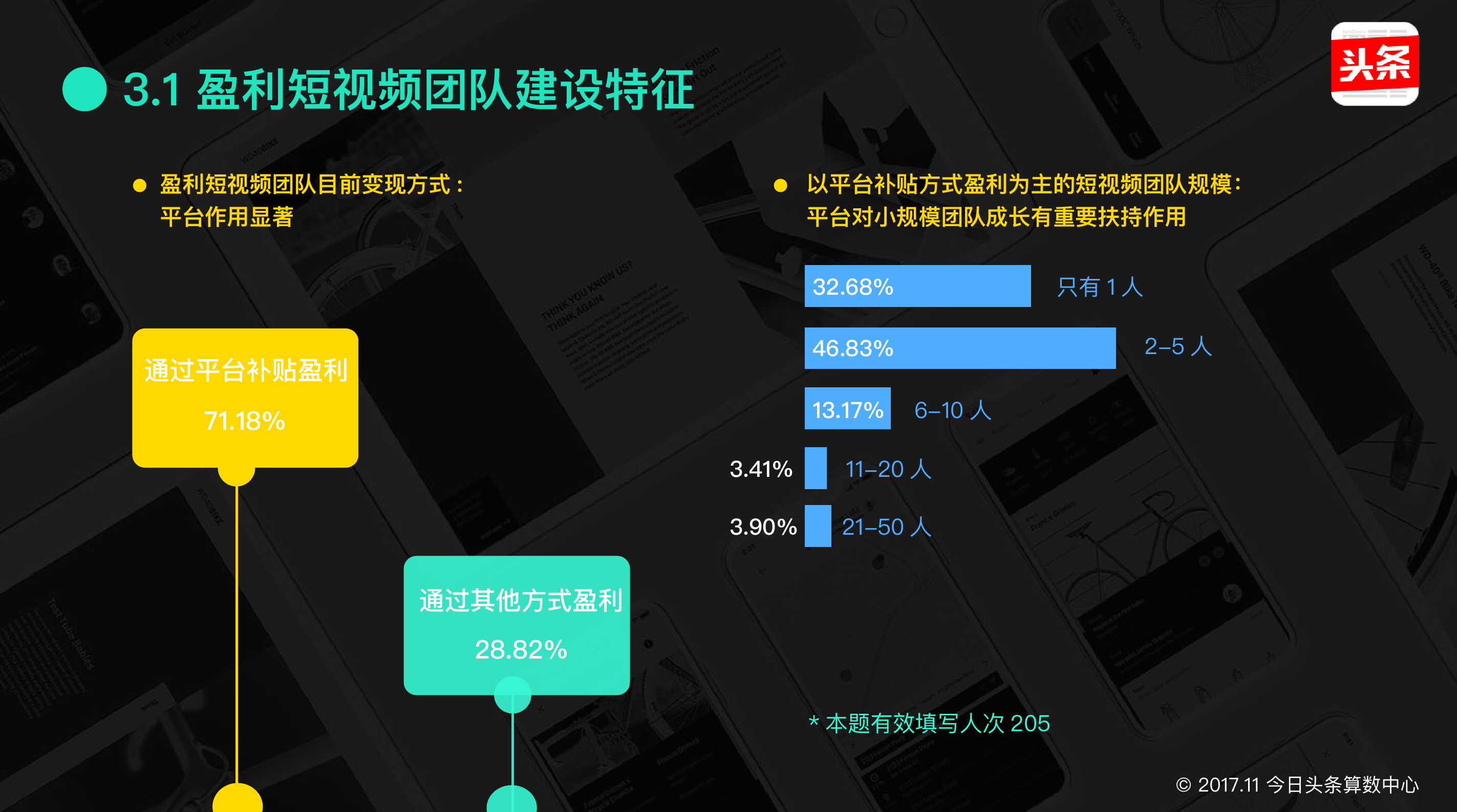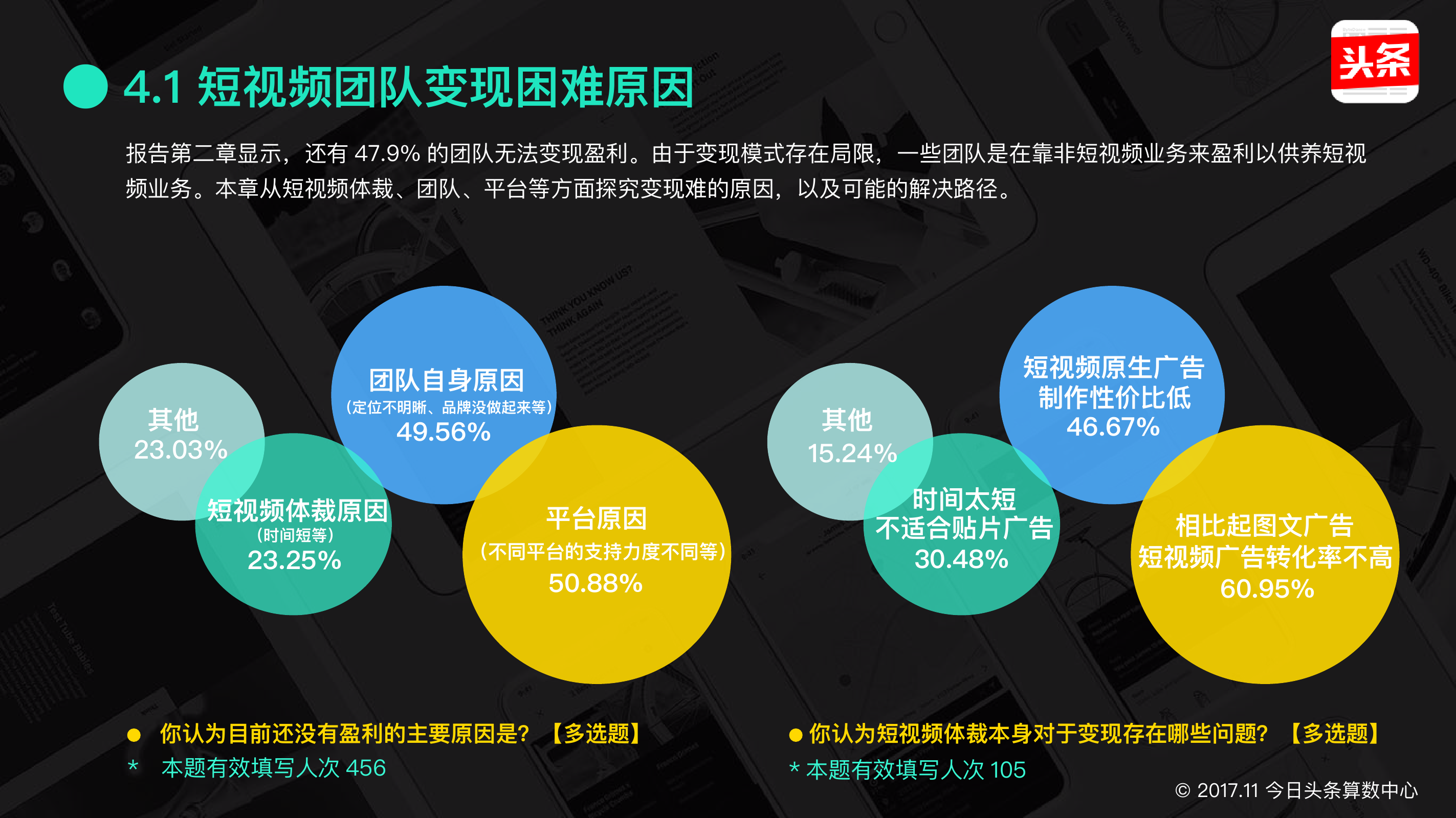 虽然这个行业里不乏办公室小野、陈翔六点半,但这份报告指出,在调研的952个优质短视频团队中,47.9%的团队还不能盈利。