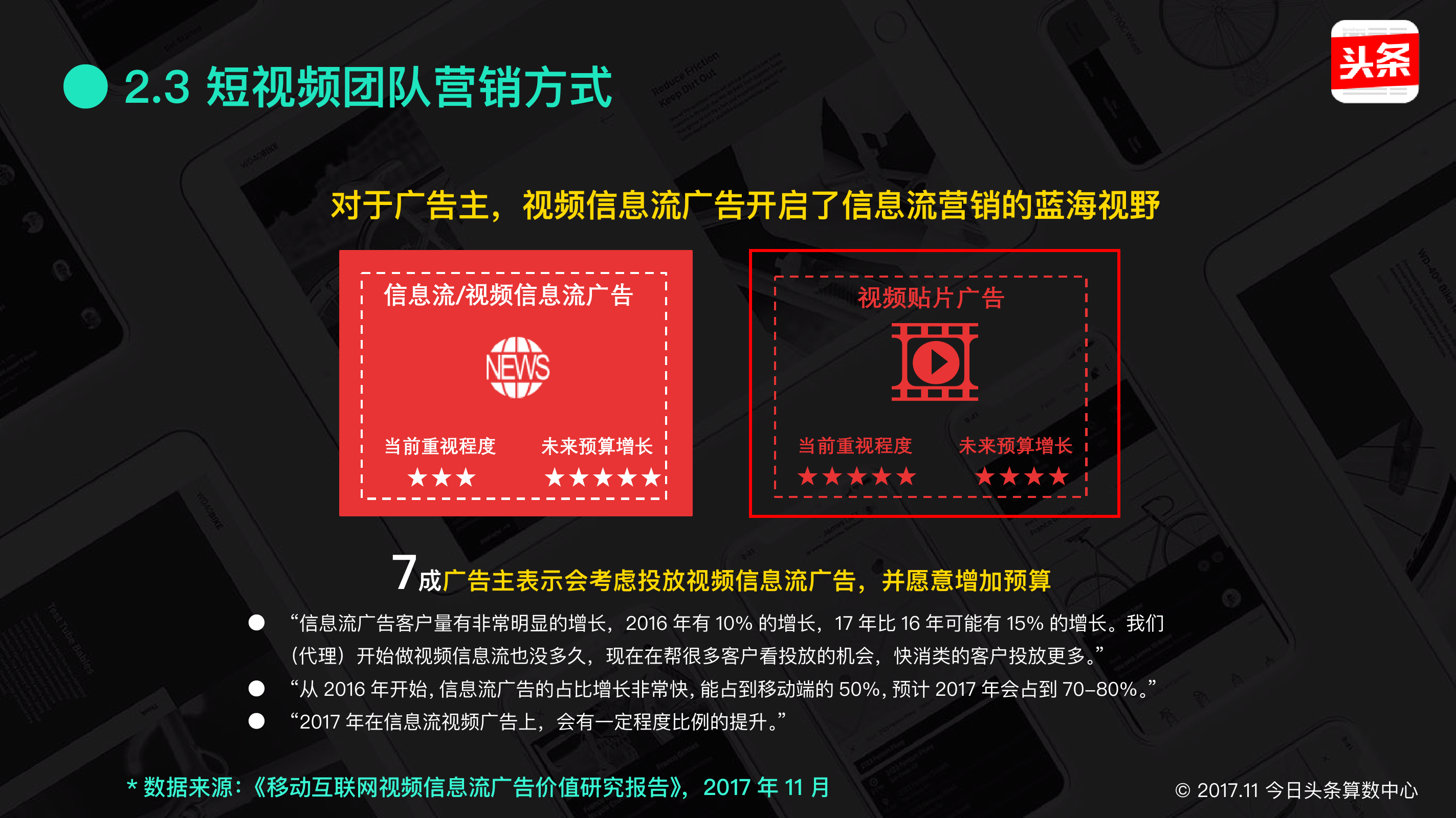 不过,报告透露了更为重要的信息是,“7成广告主愿意增加短视频上的投放支出”,可见广告商们对短视频领域报以巨大兴趣。