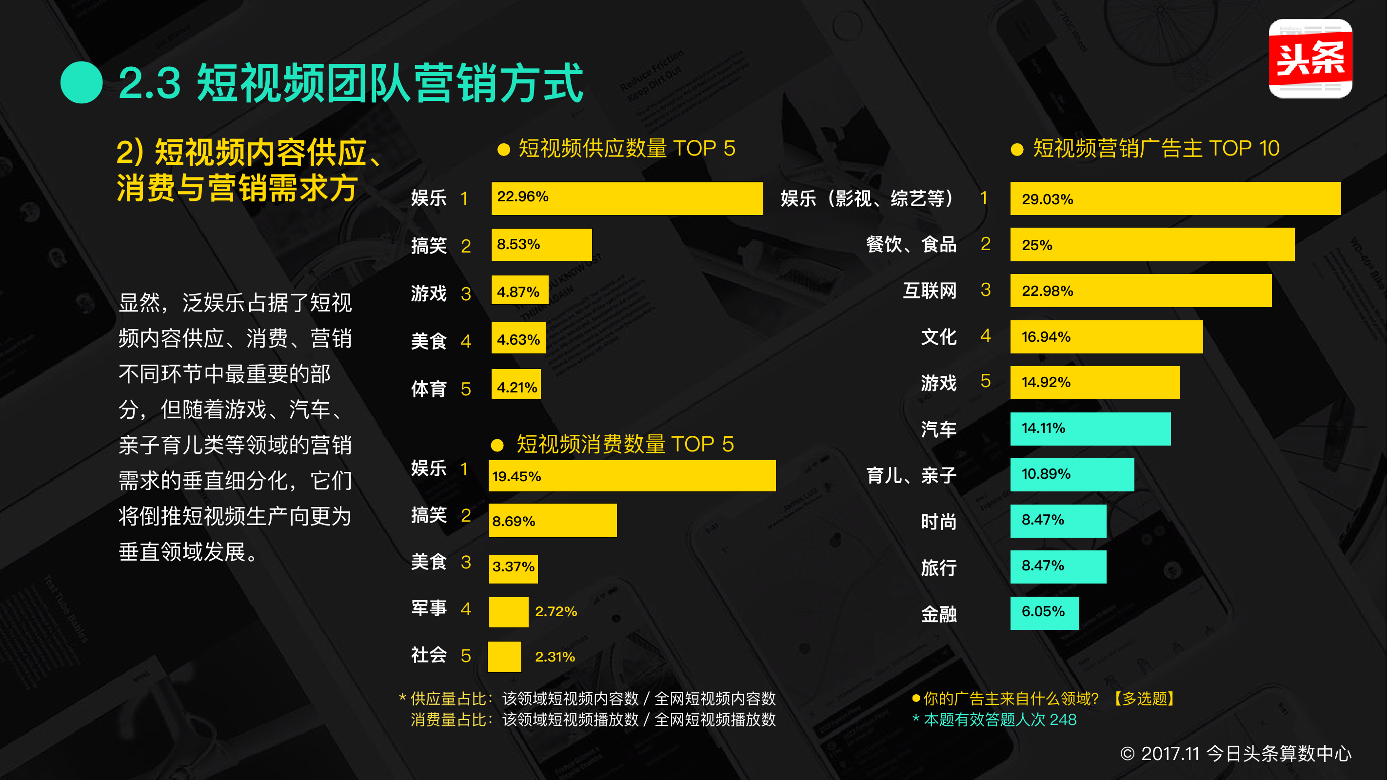 数据显示,泛娱乐占据了短视频内容供应、消费、营销不同环节中最重要的部分,但随着游戏、汽车、亲子育儿类等领域的营销需求的垂直细分化,将倒推短视频生产向更为垂直领域发展。