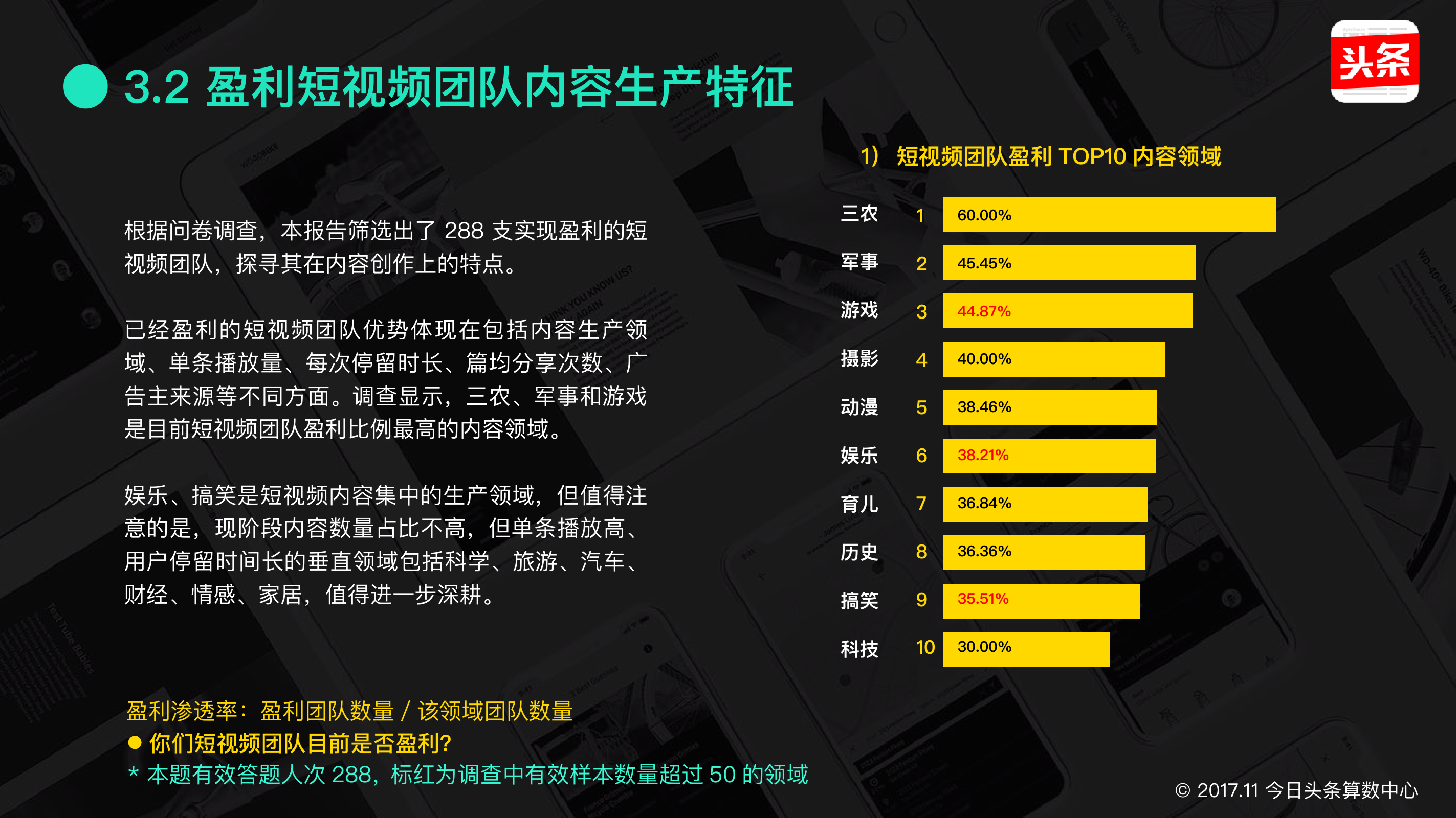 报告指出,三农、军事、游戏是盈利数量占比最高的内容领域。