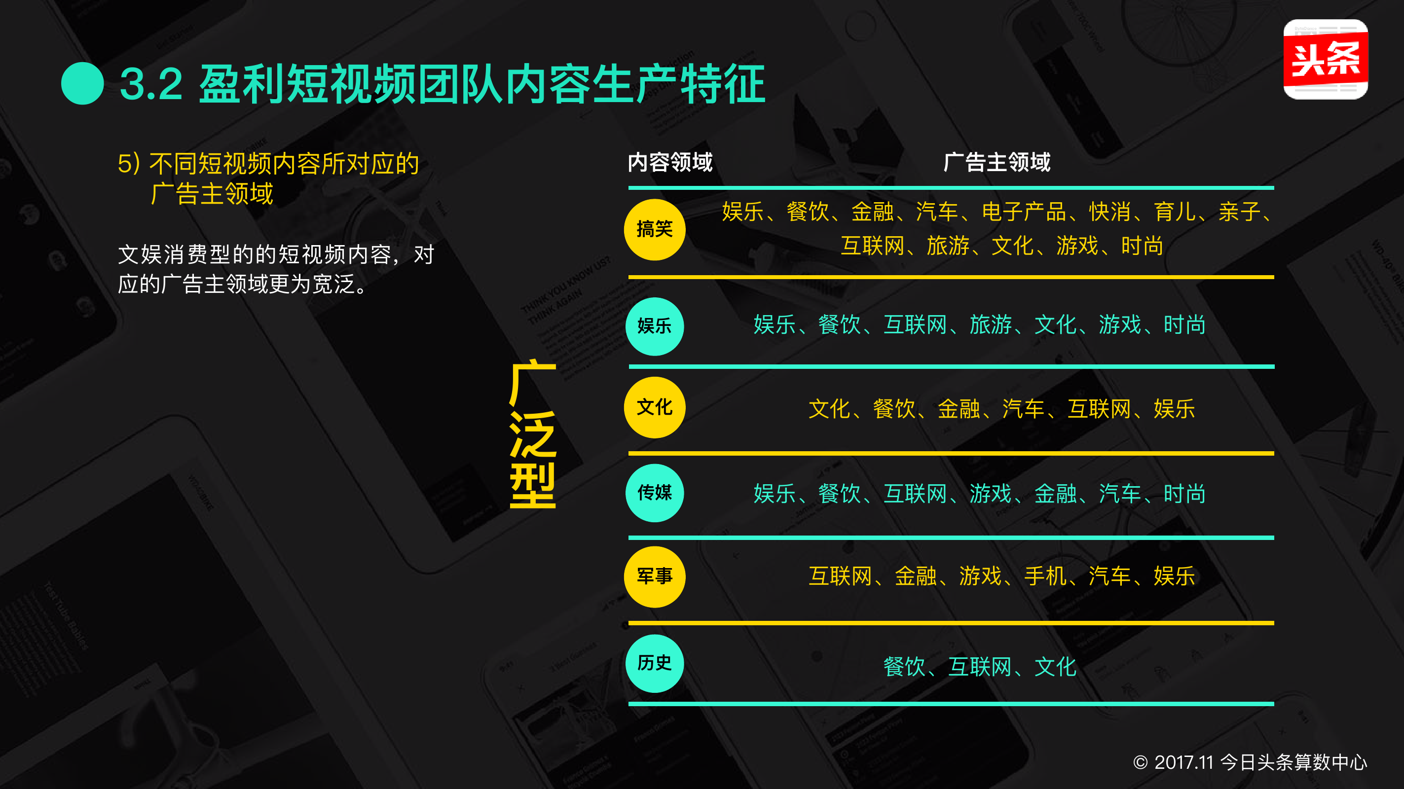 谈到供需关系,除了考虑内容领域,还得兼顾广告主的投放诉求。不同的短视频内容所对应的广告主领域也不尽相同,可以区分为:内容可以兼顾各色广告主的广泛型和针对主打广告主领域的垂直型。