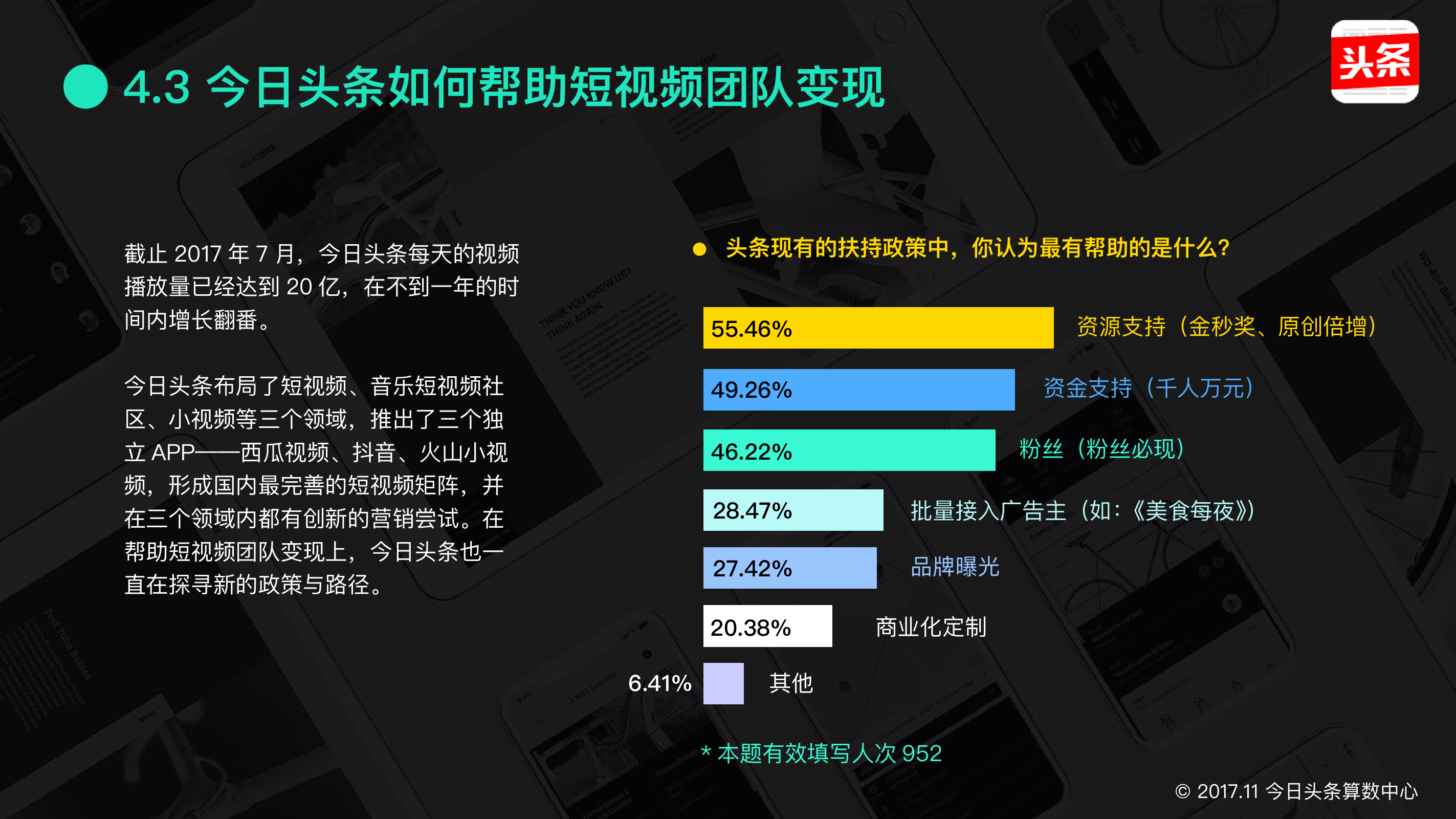 作为全球最大的视频创作平台,今日头条针对变现困境以及不同成长阶段的需求,推出了相应的扶持政策,其中最受创作者欢迎的就是资源和资金的支持。