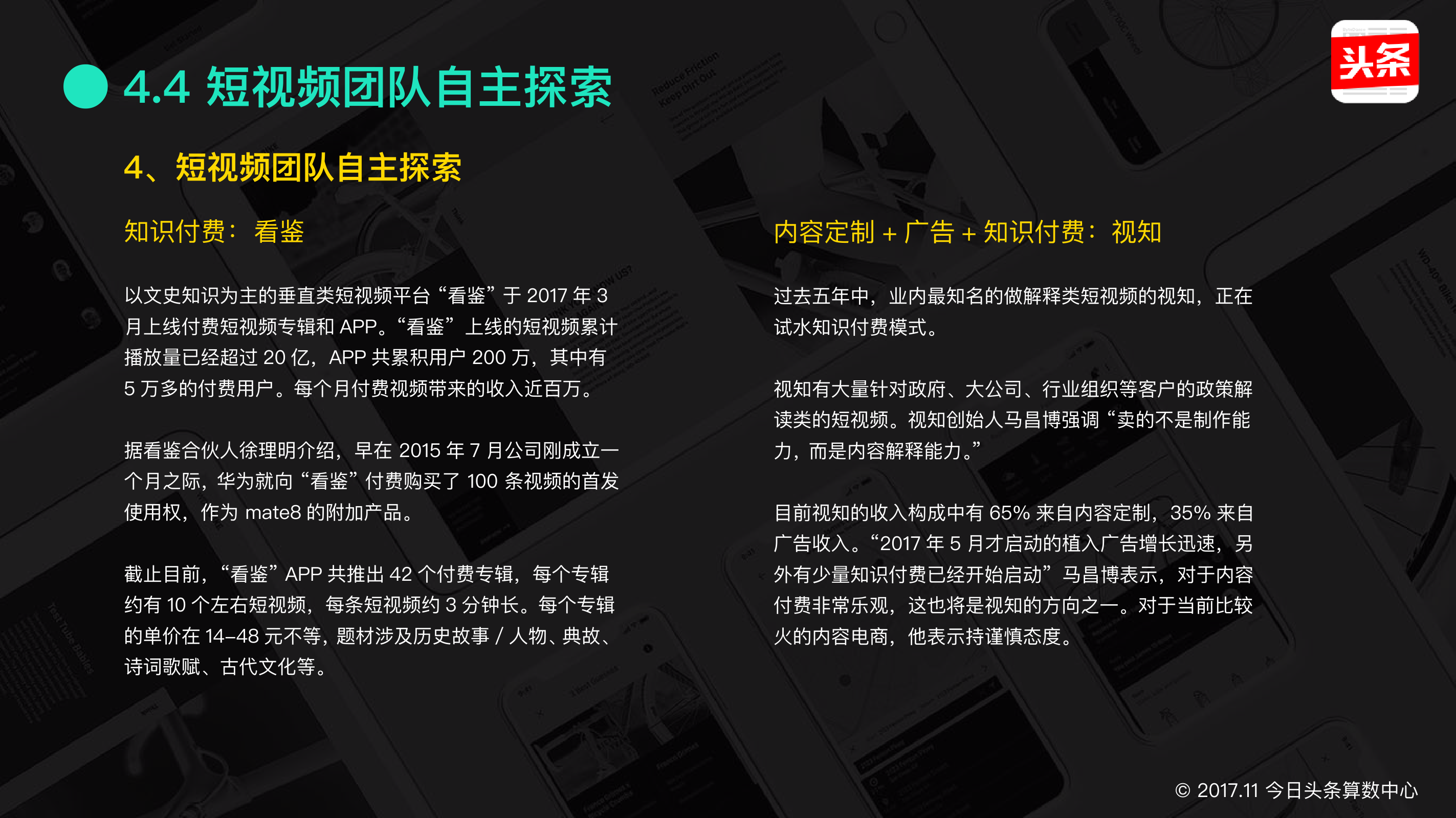 此外,这份报告还提醒大家需要时刻关注业界领军者的新动作,比如做解释类短视频的视知,正在试水知识付费模式。