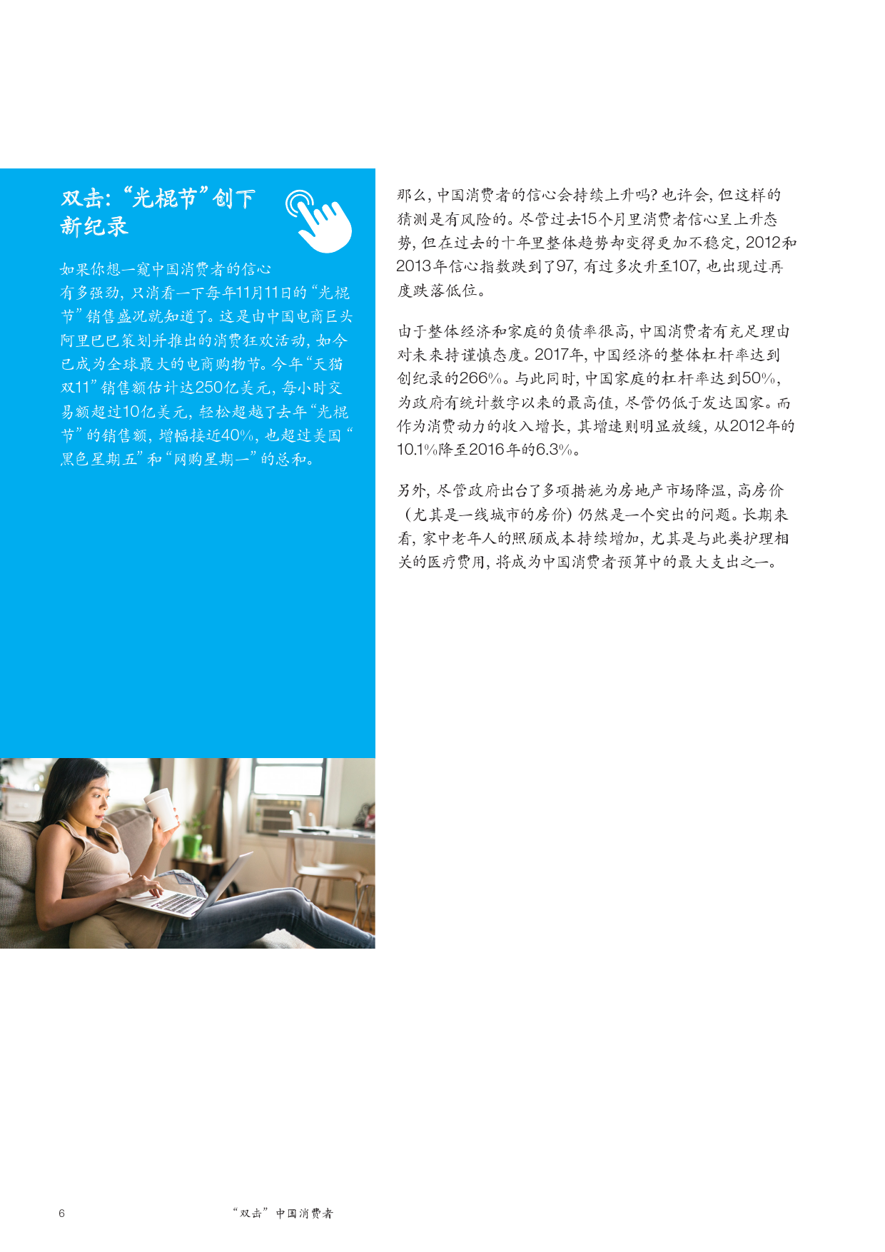 中国消费者信心指数从2016年春季的低点100上升到2017年8月的115,为2007年全球金融危机前夕以来的最高值(见下图)。但由于整体经济和家庭的负债率很高,中国消费者有充足理由对未来持谨慎态度。一边是居高不下的房价、大笔的子女教育费用以及老龄化社会日渐沉重的照顾老人的负担,另一边则是收入增长的缓慢和物价的上涨,这些给中国消费者原本光明的前景蒙上了阴影。