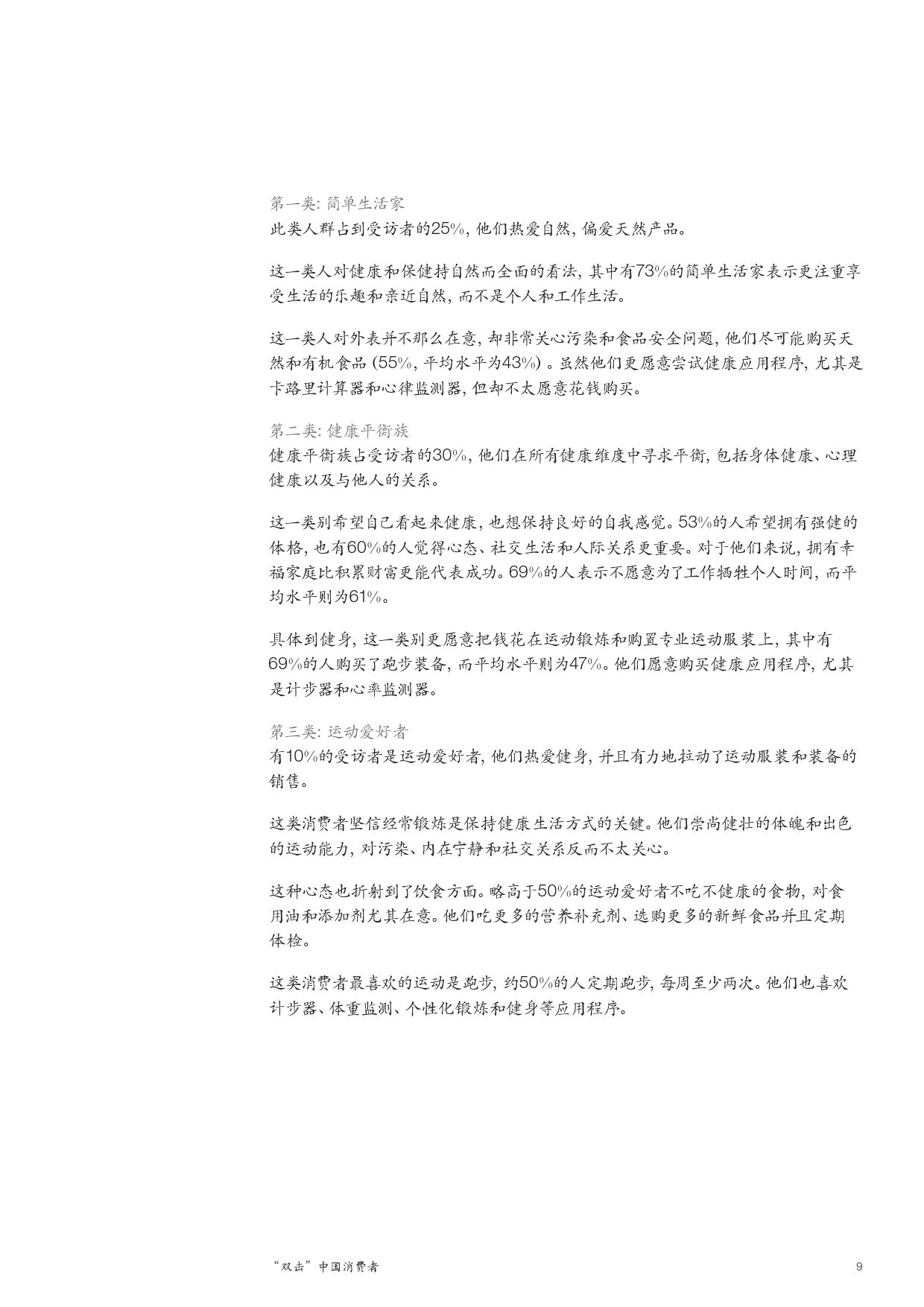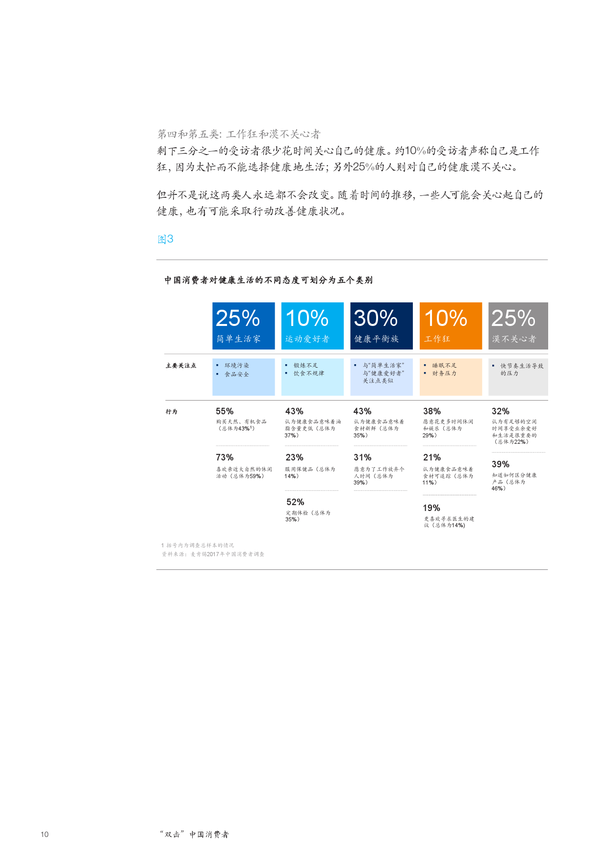我们的调查显示,过去几年重视健康以及饮食、运动和环境对生活质量的影响的中国人大幅增加。65%的中国消费者追求更健康的生活方式。当然,中国消费者对健康的看法也并不一致,我们据此划分出了五个类别:简单生活家(25%)、健康平衡族(30%)、运动爱好者(10%)、工作狂(10%)和漠不关心者(25%)。