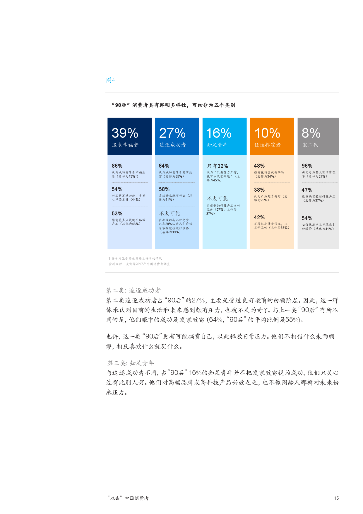 “90后”消费群体占中国总人口的16%,从现在起到2030年,他们将贡献中国总消费增长的20%以上,高于其他任何人口类别。这是一个具有鲜明多样性的群体,我们尝试着将其细分为五类,即追求幸福者(39%)、追逐成功者(27%)、知足青年(16%)、任性挥霍者(10%)和宠二代(8%)(见下图)。“90后”作为一个很有前景的消费者群体将对品牌在中国市场的表现产生显著影响。