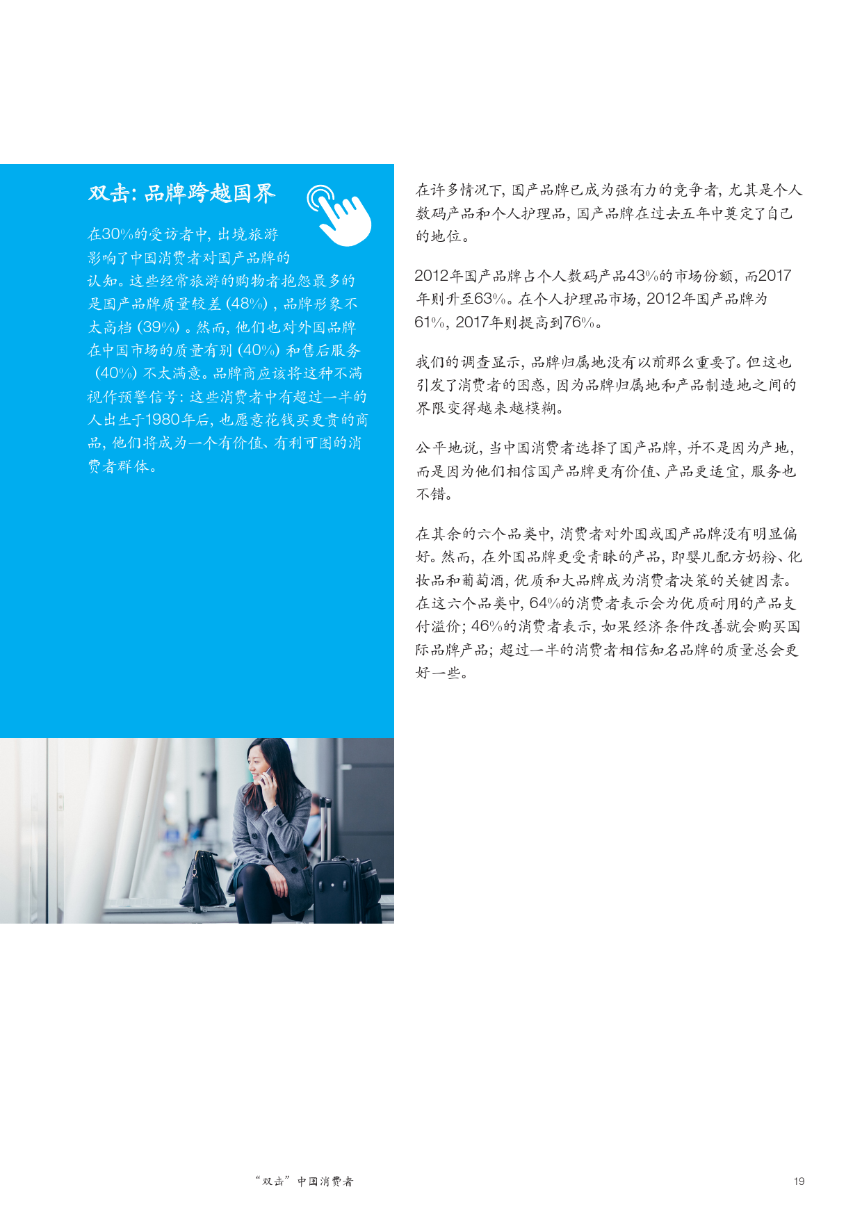 在往年的调查中,我们看到中国消费者对外国品牌兴趣浓厚。渐渐地,人们的视线转向了本土品牌。近年来,中国消费者开始密切关注那些主打性价比的品牌。在本次调查中,我们观察到中国消费者对品牌选择有了更细致的认知。在大多数所调查的品类中,品牌归属地没有以前那么重要了。现今消费者对自己想要什么非常明确,无论是本土品牌,还是外国品牌,要求都是一样的。首先,要物有所值。其次,产品品质要好,而且能满足个人偏好。最后,售后服务要到位。