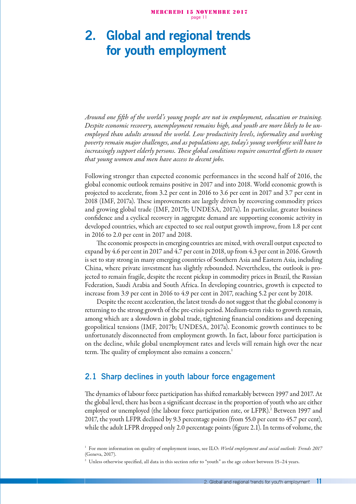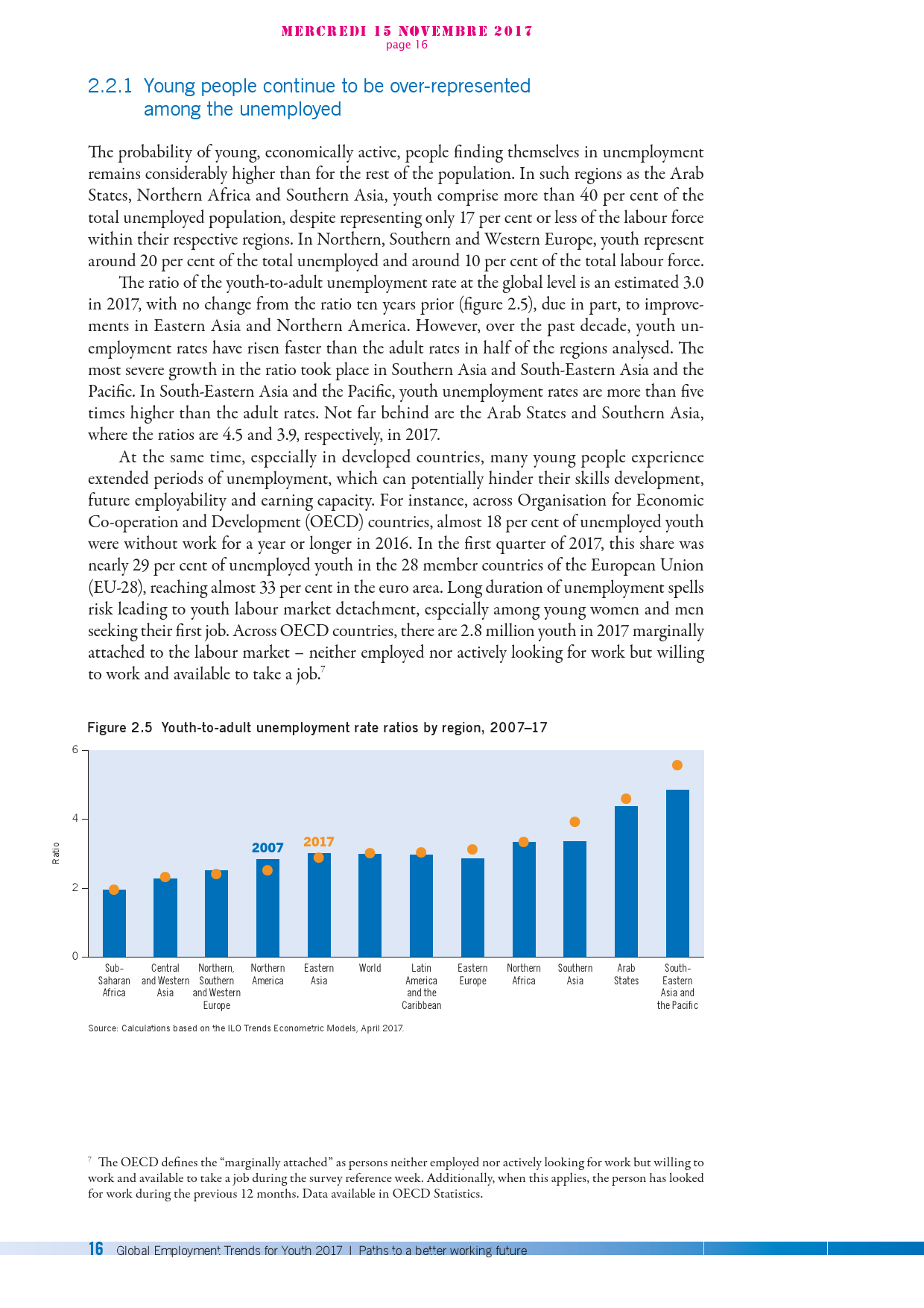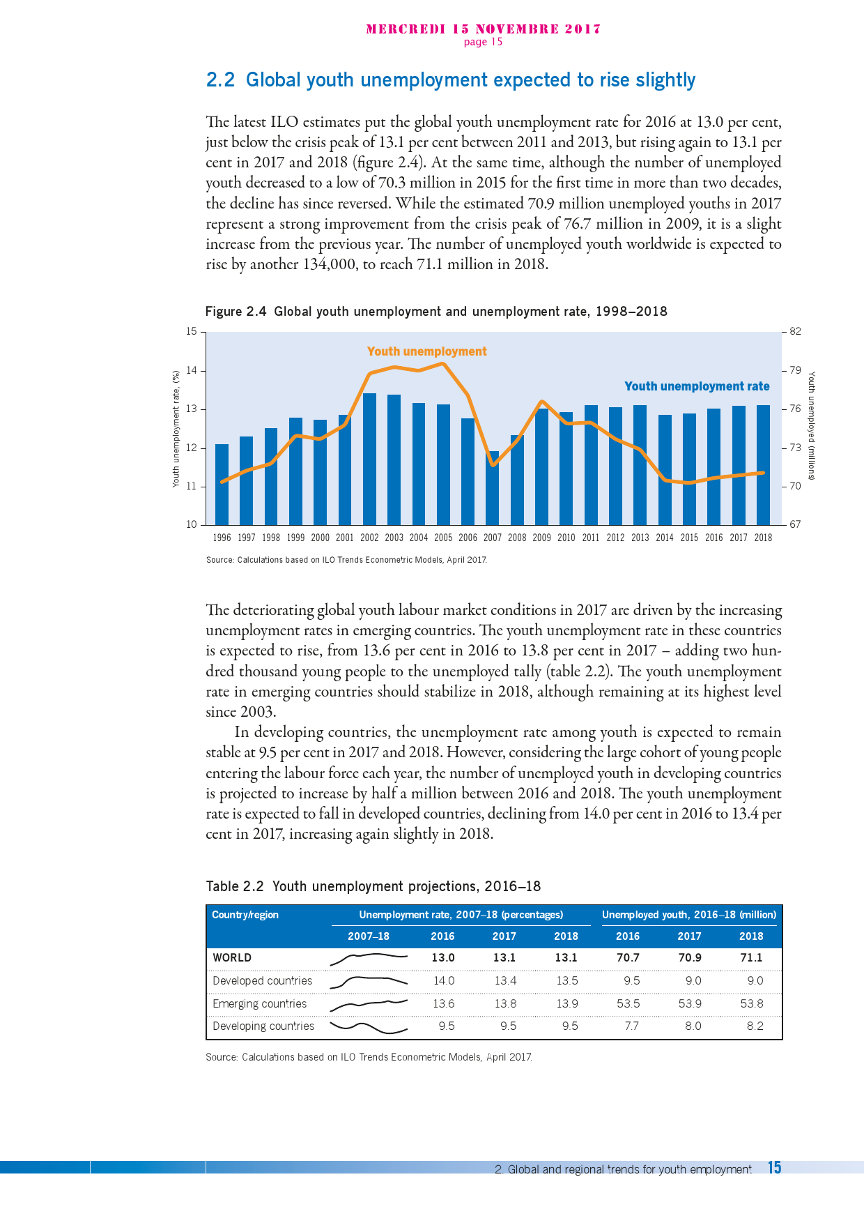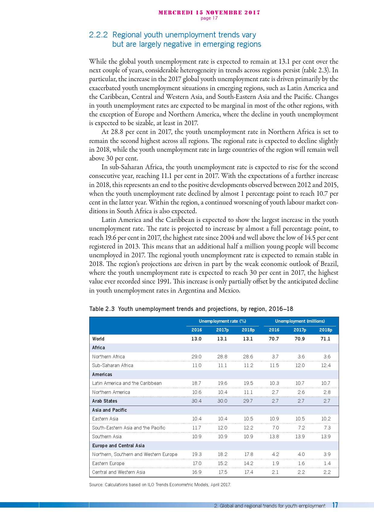在全球范围内,北非、阿拉伯国家和拉丁美洲和加勒比地区在2010年至2016年期间青年失业率大幅增加。总体经济增长并未带来相应地就业增长,经济不稳定性有可能扭转青年就业方面表现出的增长。青年与成人失业人口的比率在过去十年几乎没有变化,说明了年轻人在劳动力市场上所处的劣势仍然存在。