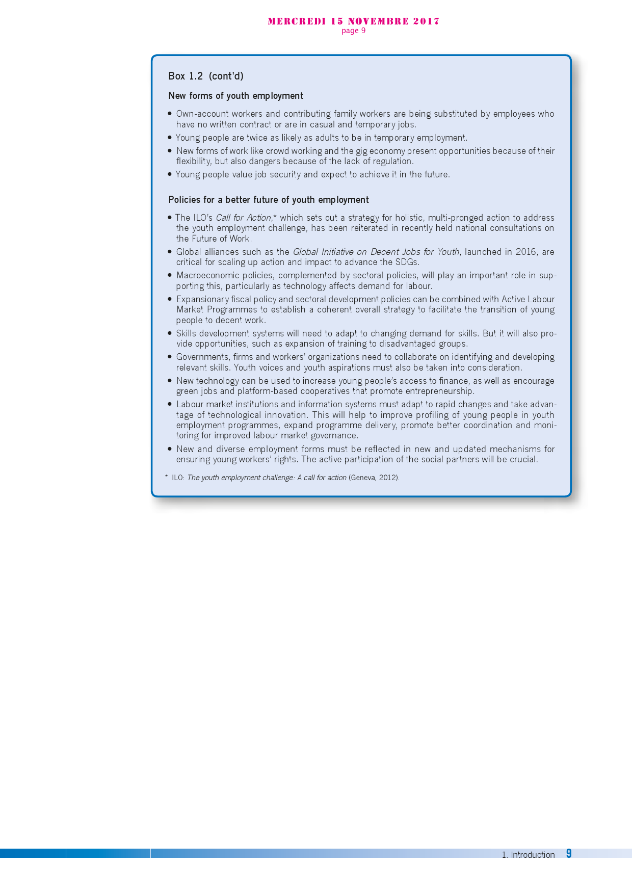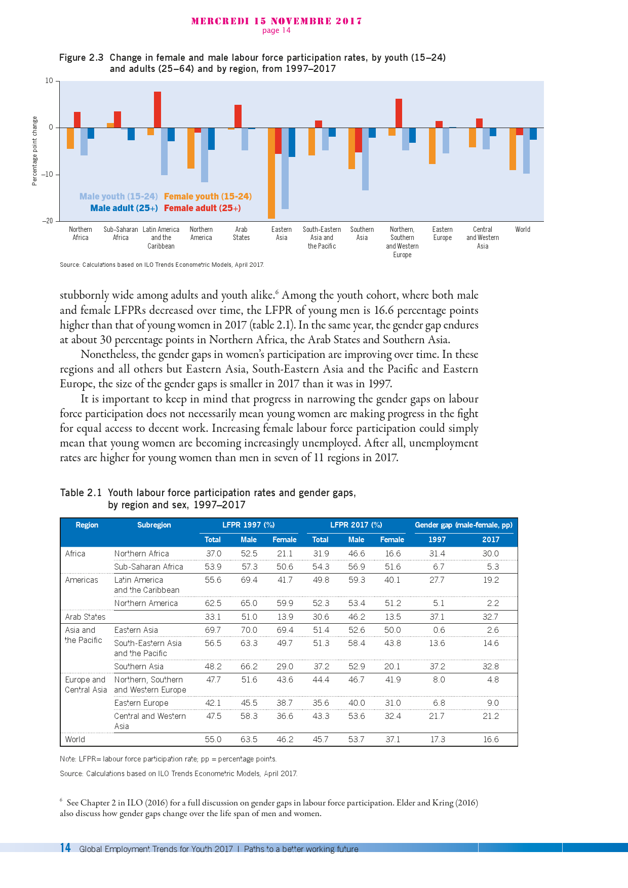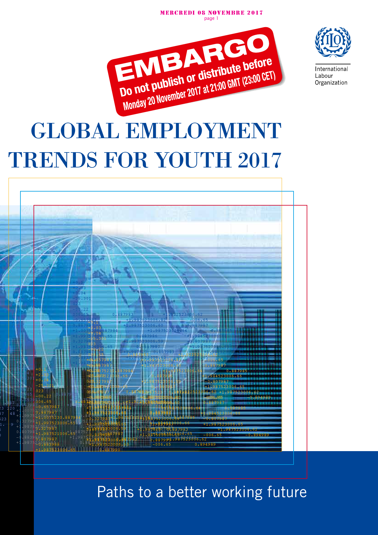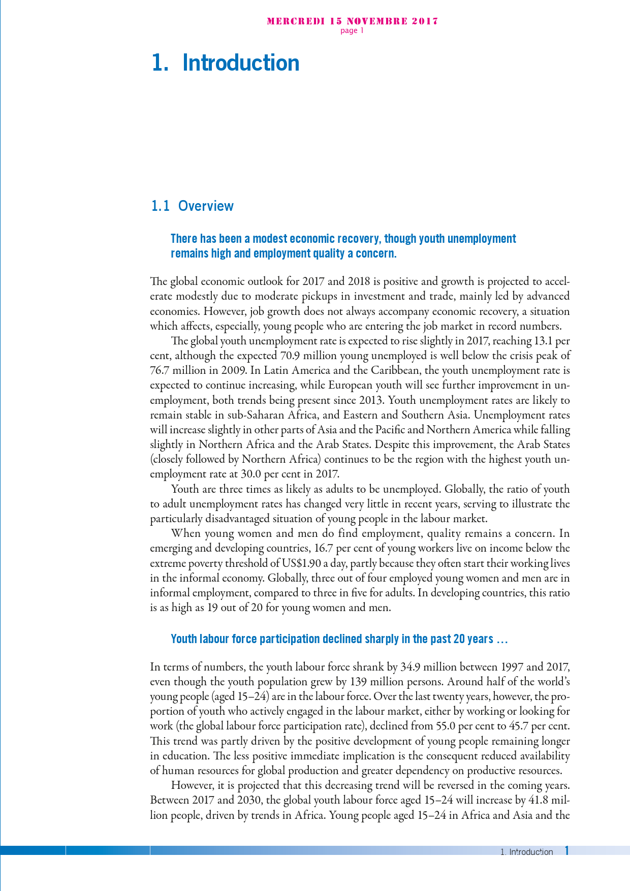 在全球范围内,北非、阿拉伯国家和拉丁美洲和加勒比地区在2010年至2016年期间青年失业率大幅增加。总体经济增长并未带来相应地就业增长,经济不稳定性有可能扭转青年就业方面表现出的增长。青年与成人失业人口的比率在过去十年几乎没有变化,说明了年轻人在劳动力市场上所处的劣势仍然存在。