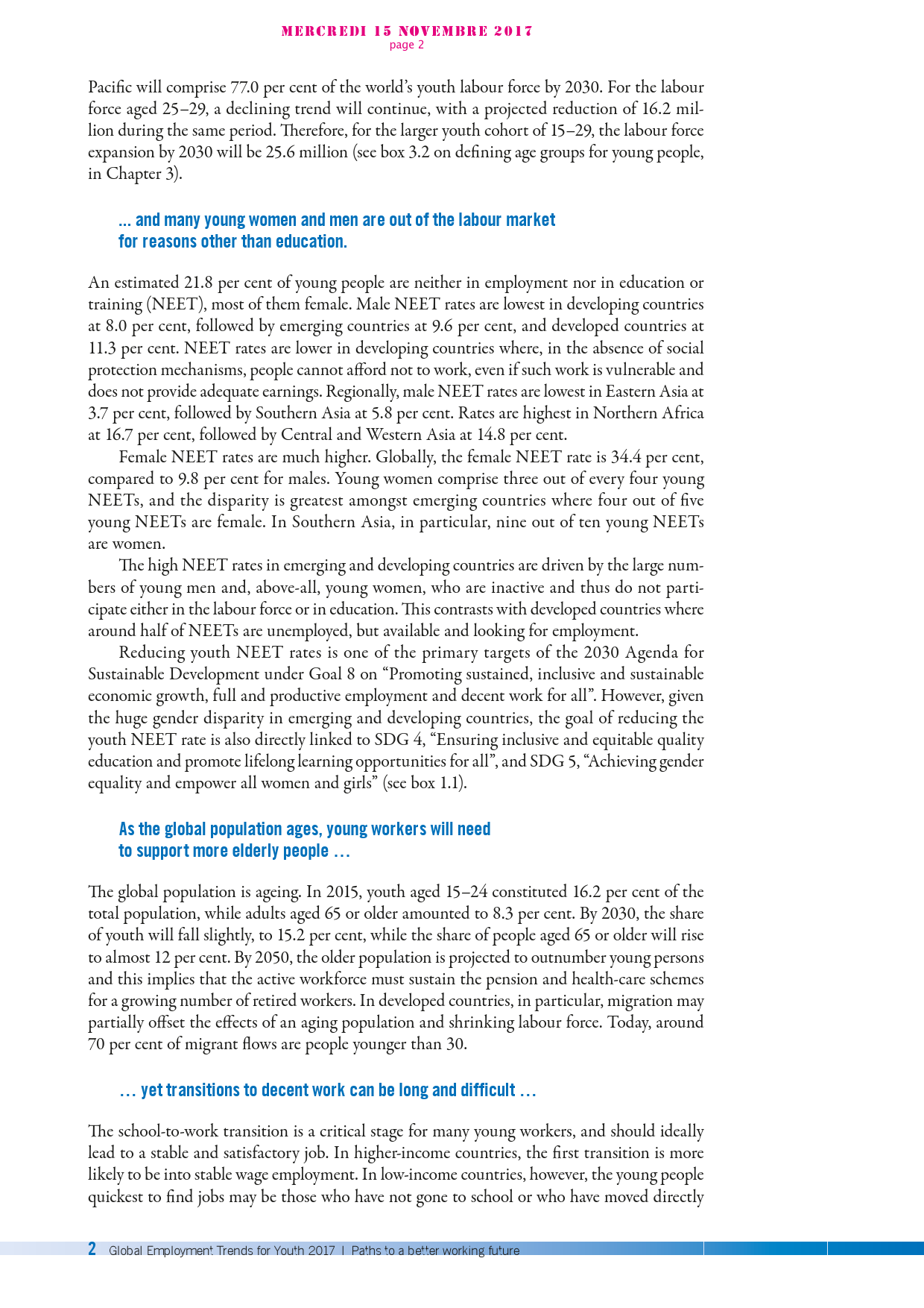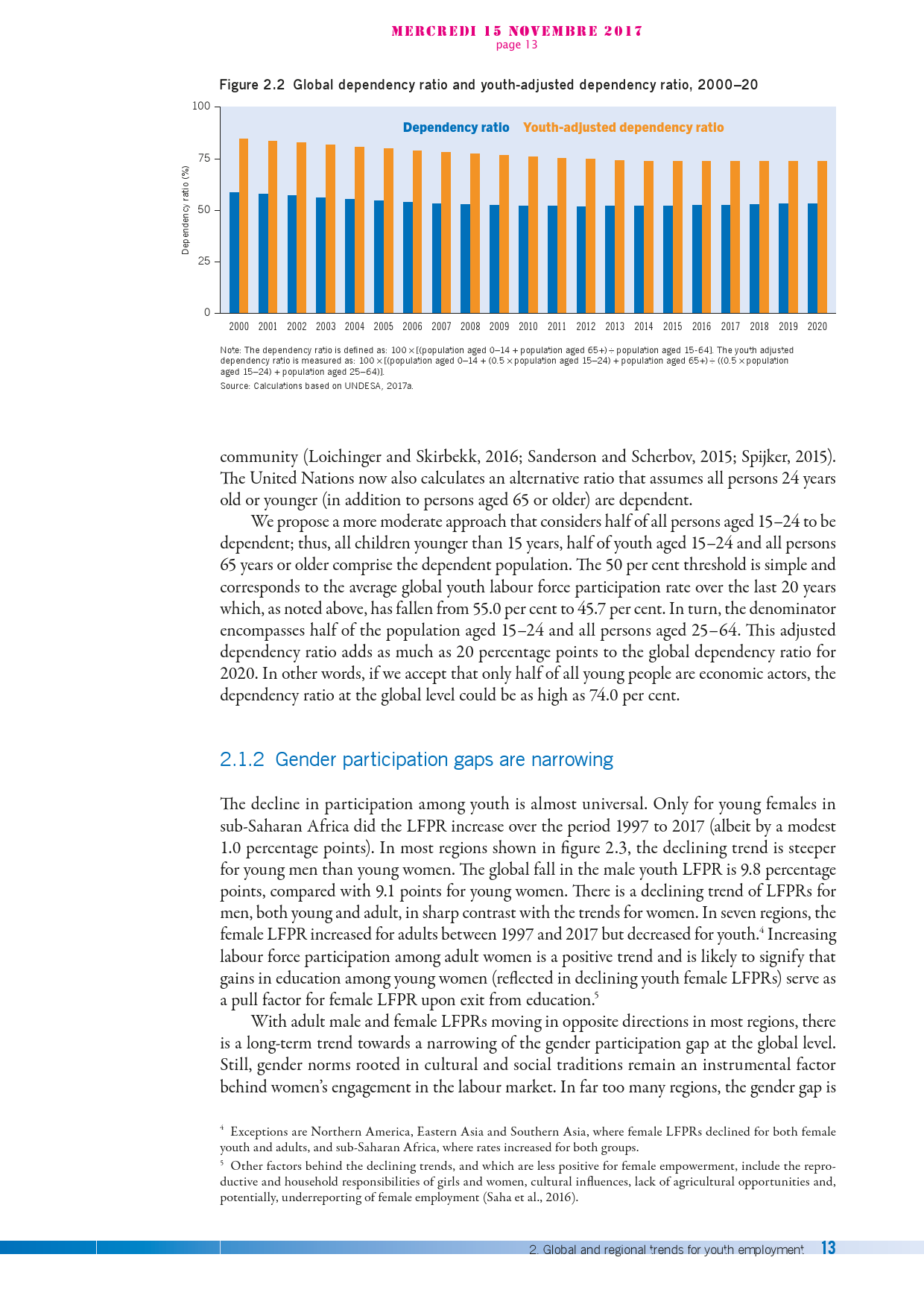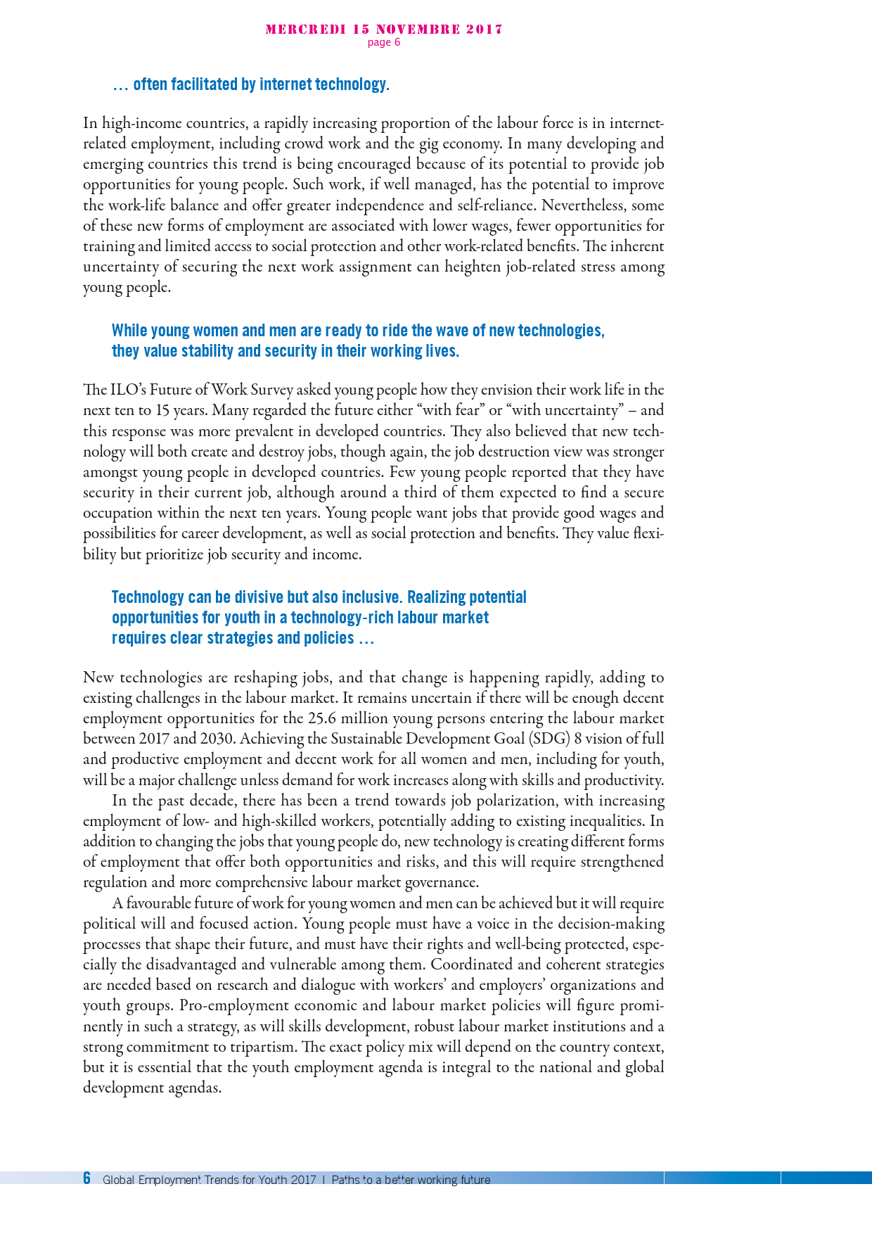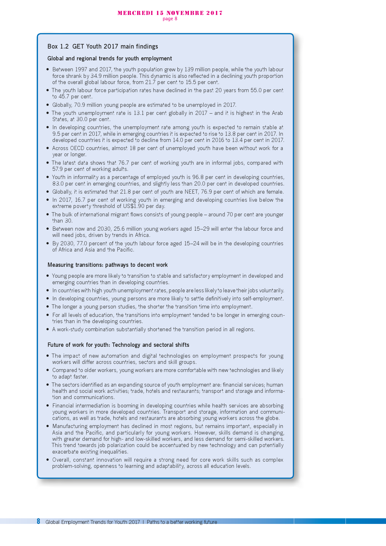 在全球范围内,北非、阿拉伯国家和拉丁美洲和加勒比地区在2010年至2016年期间青年失业率大幅增加。总体经济增长并未带来相应地就业增长,经济不稳定性有可能扭转青年就业方面表现出的增长。青年与成人失业人口的比率在过去十年几乎没有变化,说明了年轻人在劳动力市场上所处的劣势仍然存在。