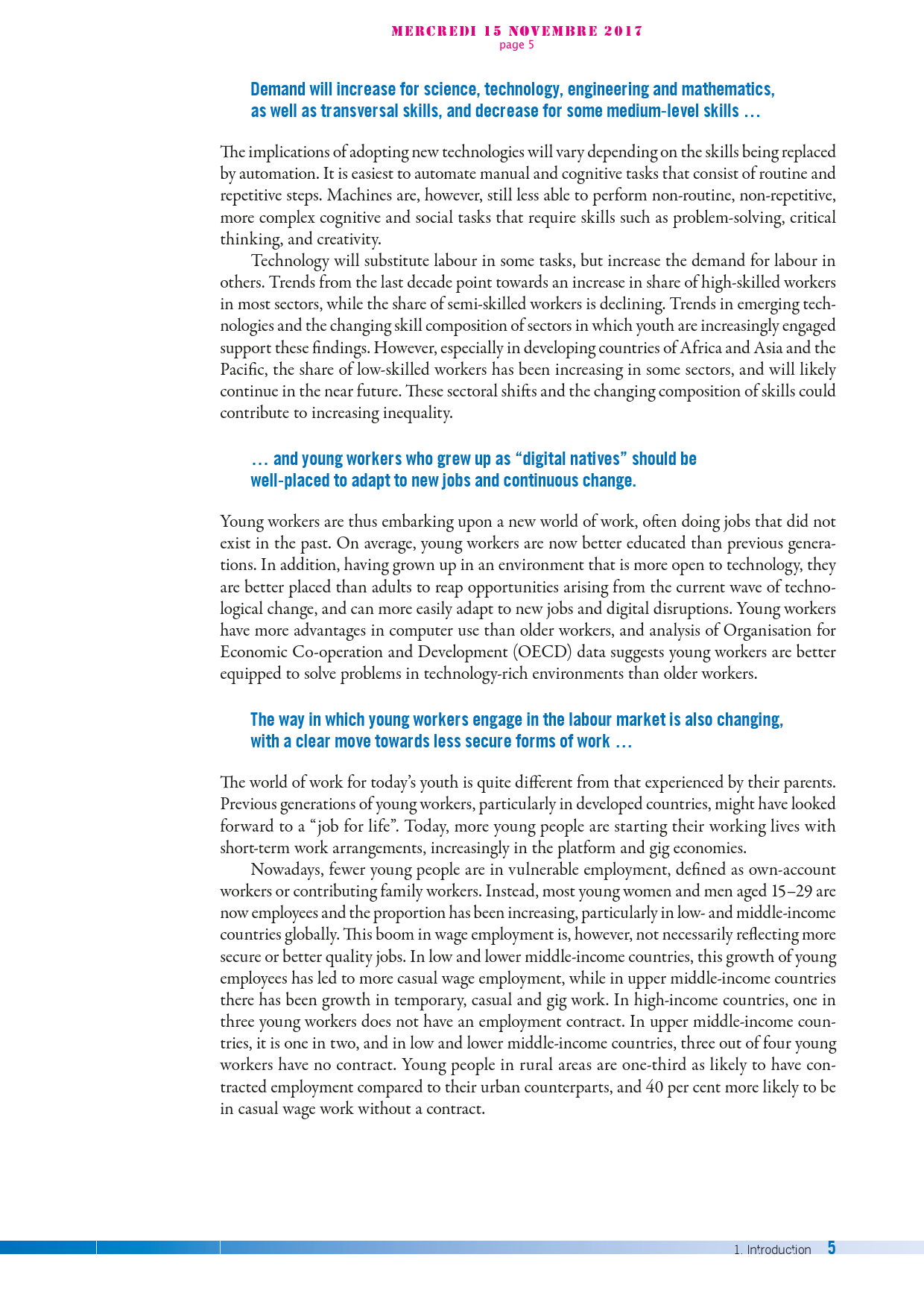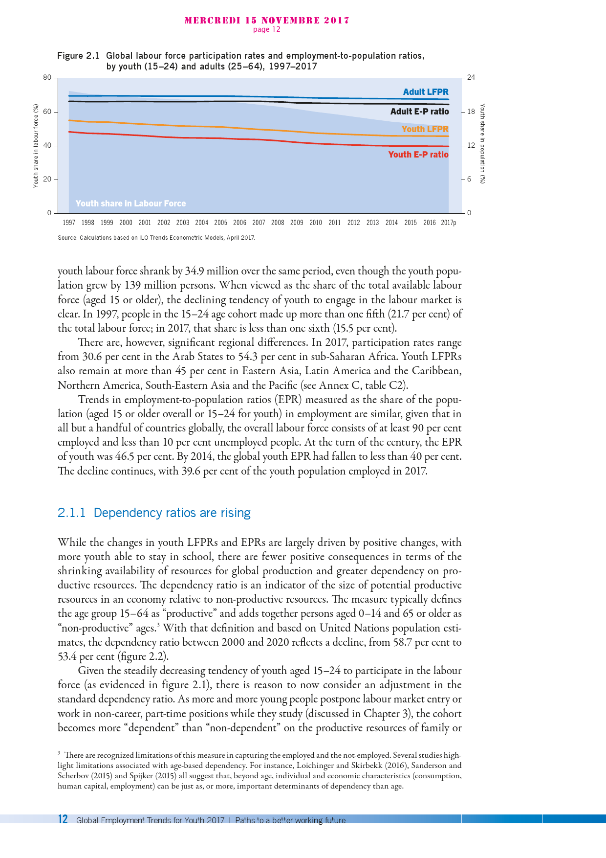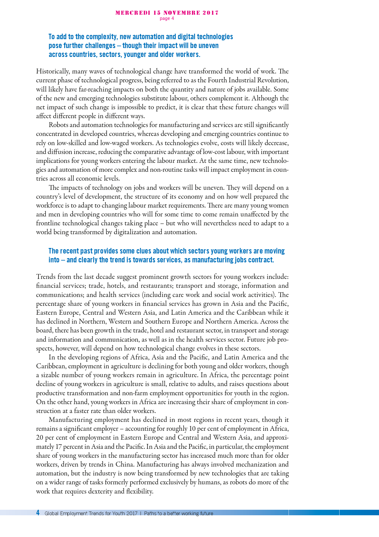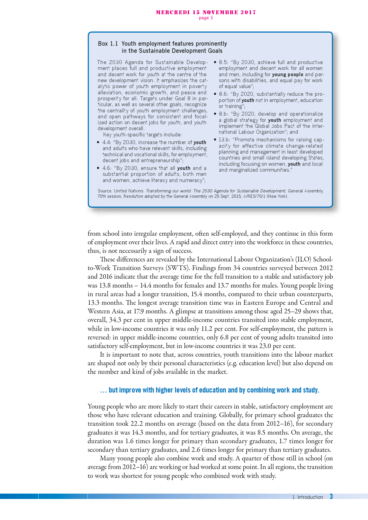 在全球范围内,北非、阿拉伯国家和拉丁美洲和加勒比地区在2010年至2016年期间青年失业率大幅增加。总体经济增长并未带来相应地就业增长,经济不稳定性有可能扭转青年就业方面表现出的增长。青年与成人失业人口的比率在过去十年几乎没有变化,说明了年轻人在劳动力市场上所处的劣势仍然存在。