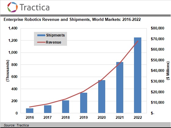 根据Tractica的最新预测,到2022年,全球企业机器人出货量将从2016年的83,000台增长至120万台,此期间复合年均增长率在57%左右。全球企业机器人市场收入将从2016年的59亿美元增加至679亿美元。