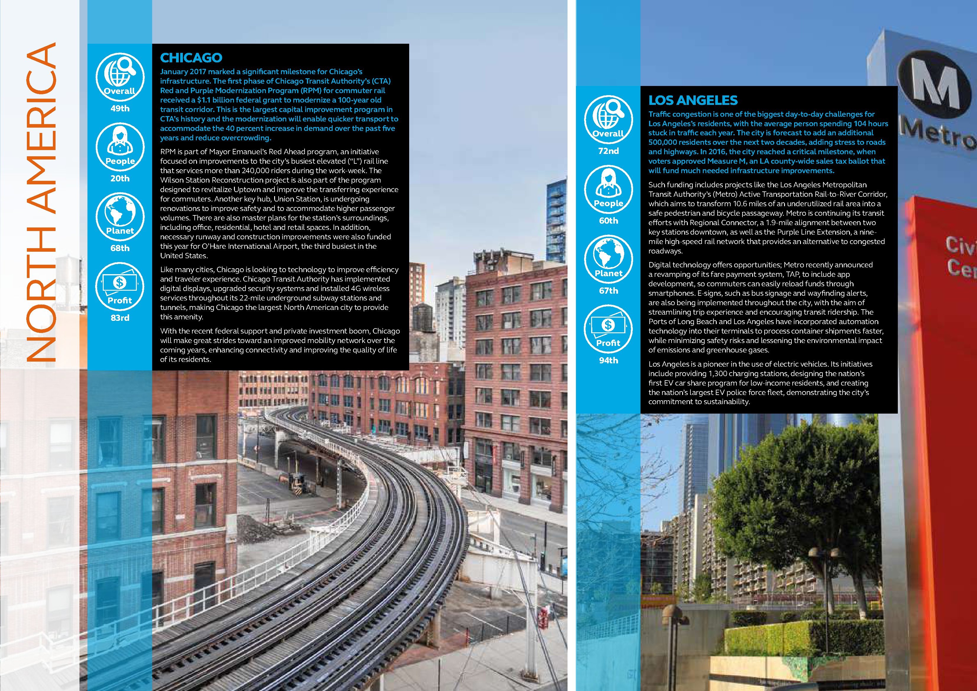 北美:美国和加拿大没有城市进入前二十名。纽约是该地区表现最好的城市,排在第23位,全天候运营的地铁系统广泛使用在纽约市区。