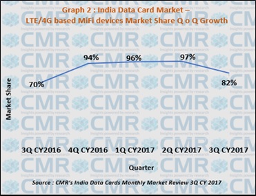 基于LTE / 4G的Mi-Fi设备占82%的市场份额,但是和前一个季度相比下降77%。USB设备占印度数据卡市场的19%。