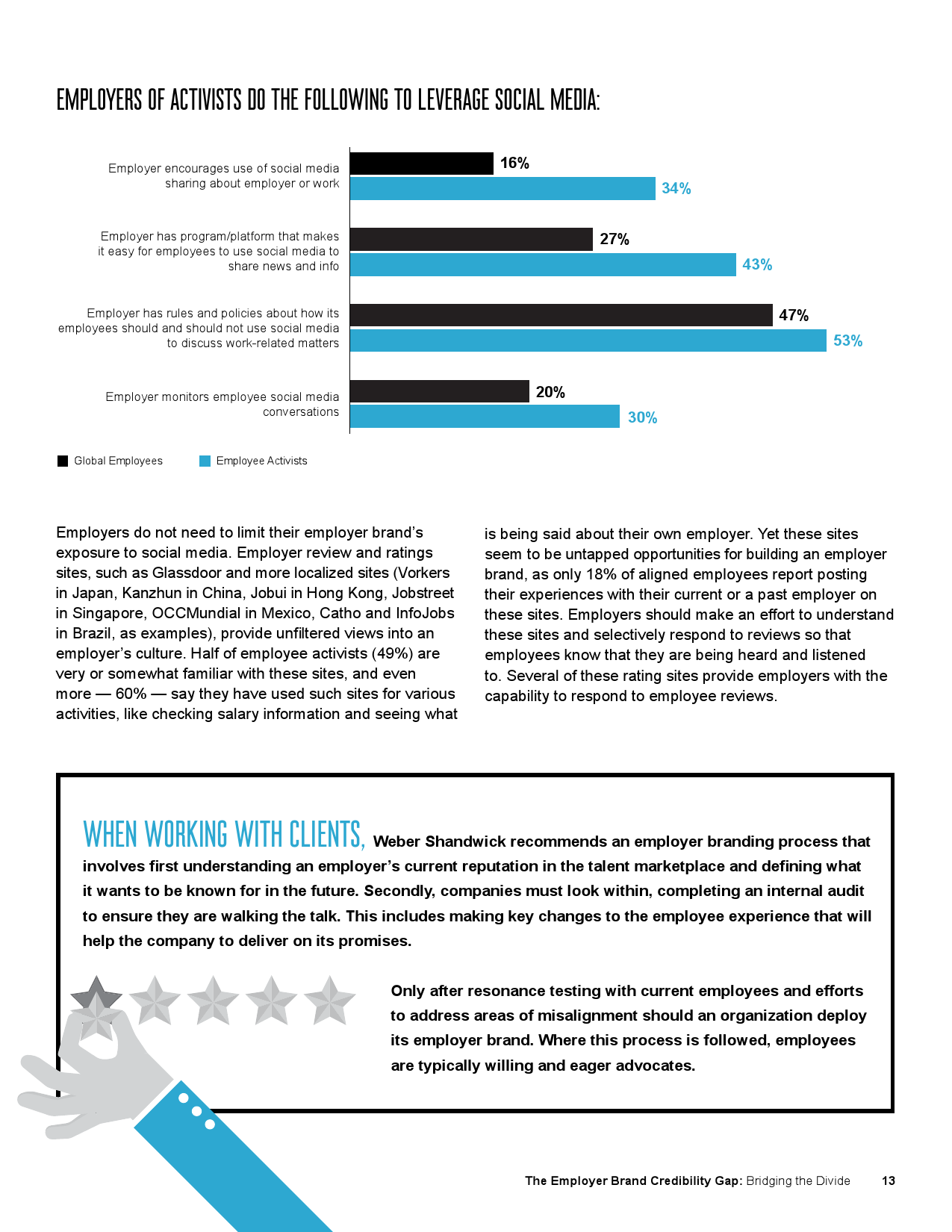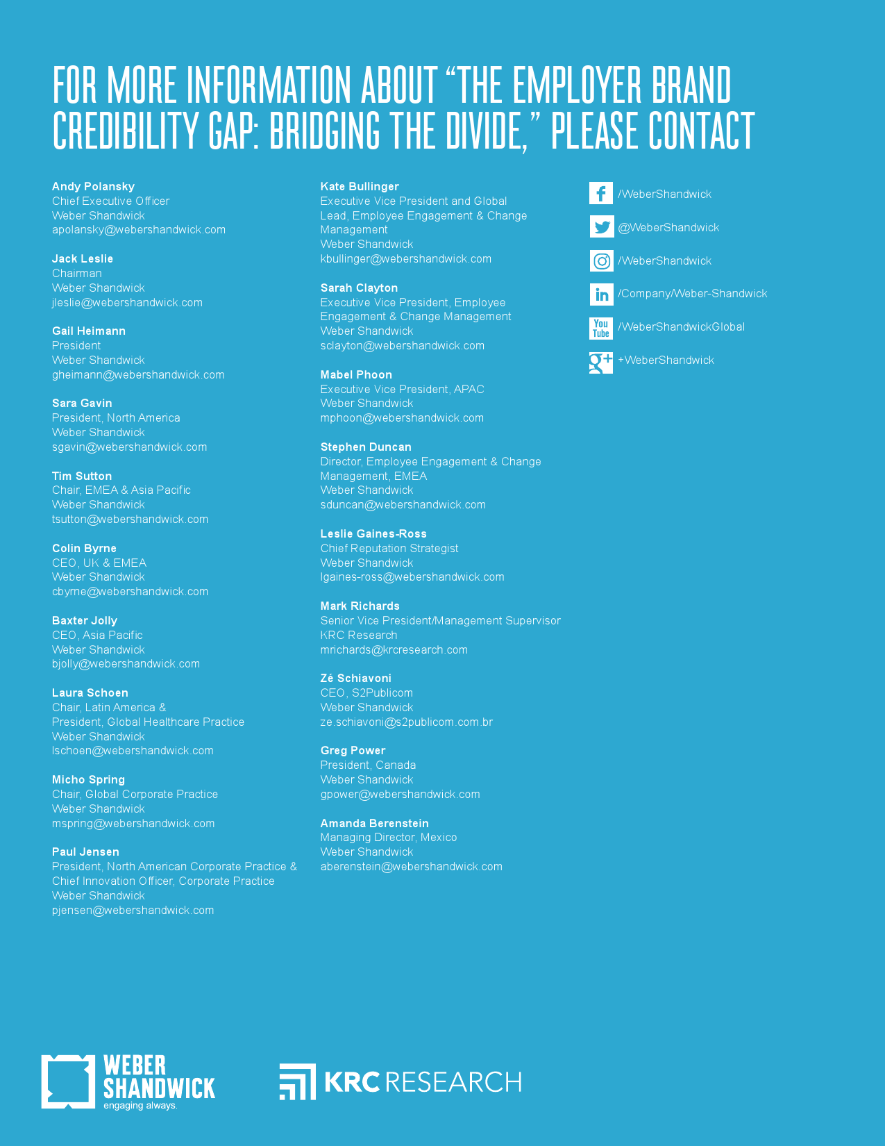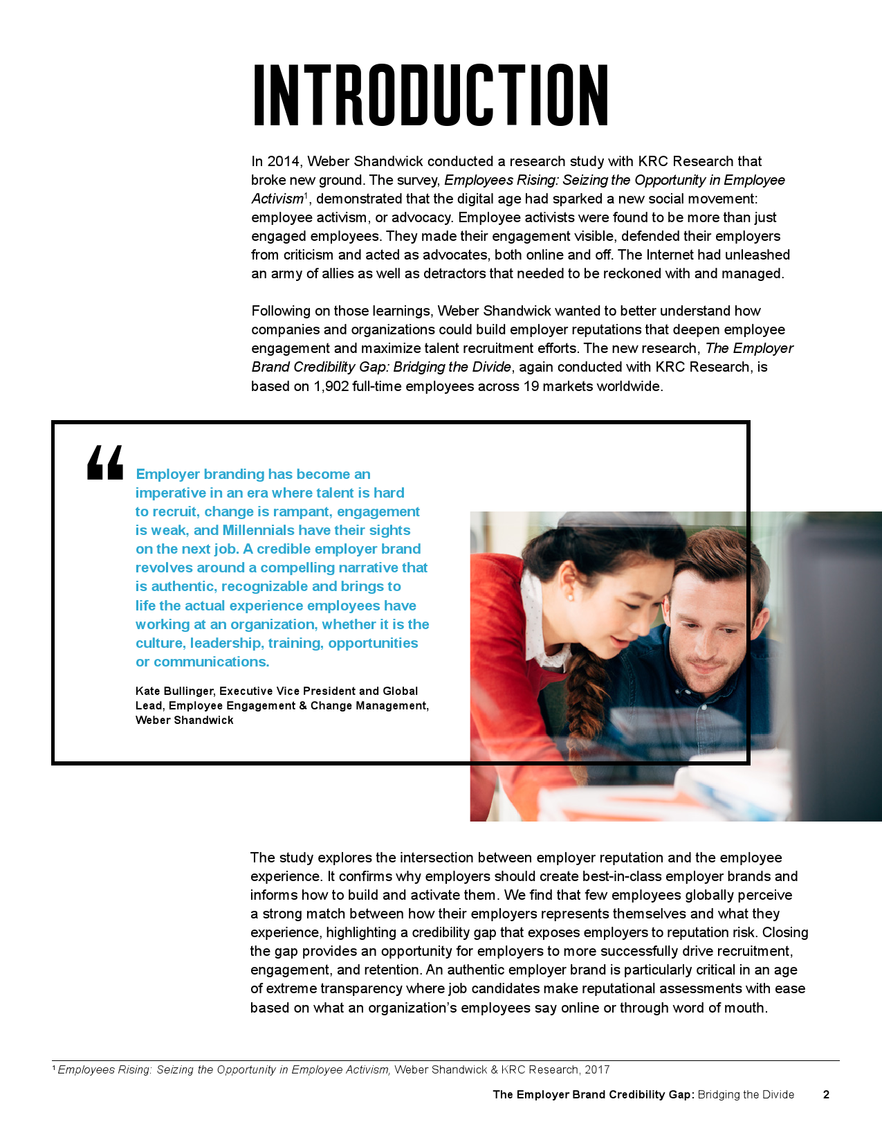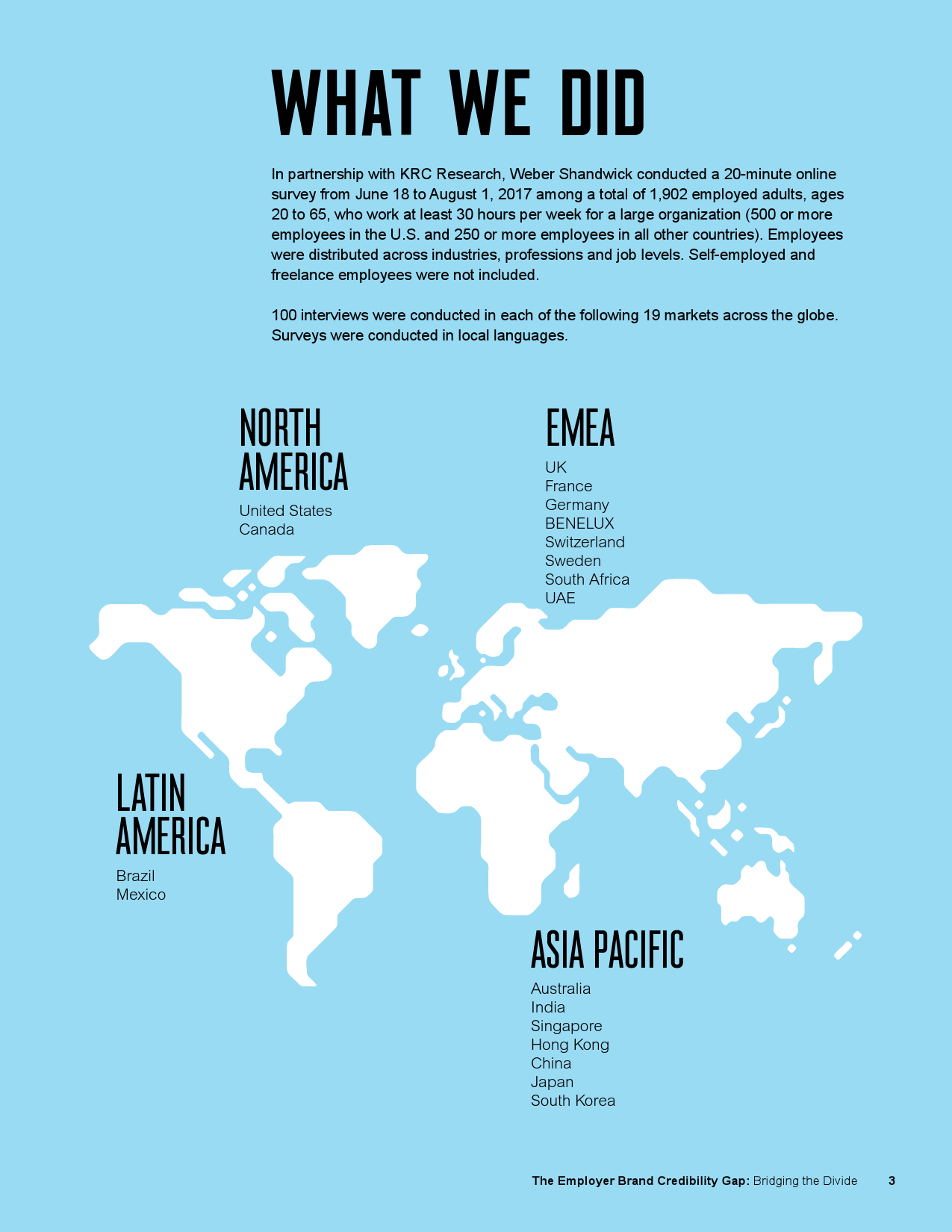 本次研究《雇主品牌信任危机:弥合鸿沟》由全球公关公司万博宣伟发起,并和KRC Research合作完成。该研究以全球19个市场1902名全职员工的在线问卷调查为基础,是《员工崛起:抓住员工积极运动中的机遇》之后续研究。《员工崛起:抓住员工积极运动中的机遇》是2014年发布的一项创新性研究,探讨了企业内部员工积极分子如何引爆数字时代社会化运动。