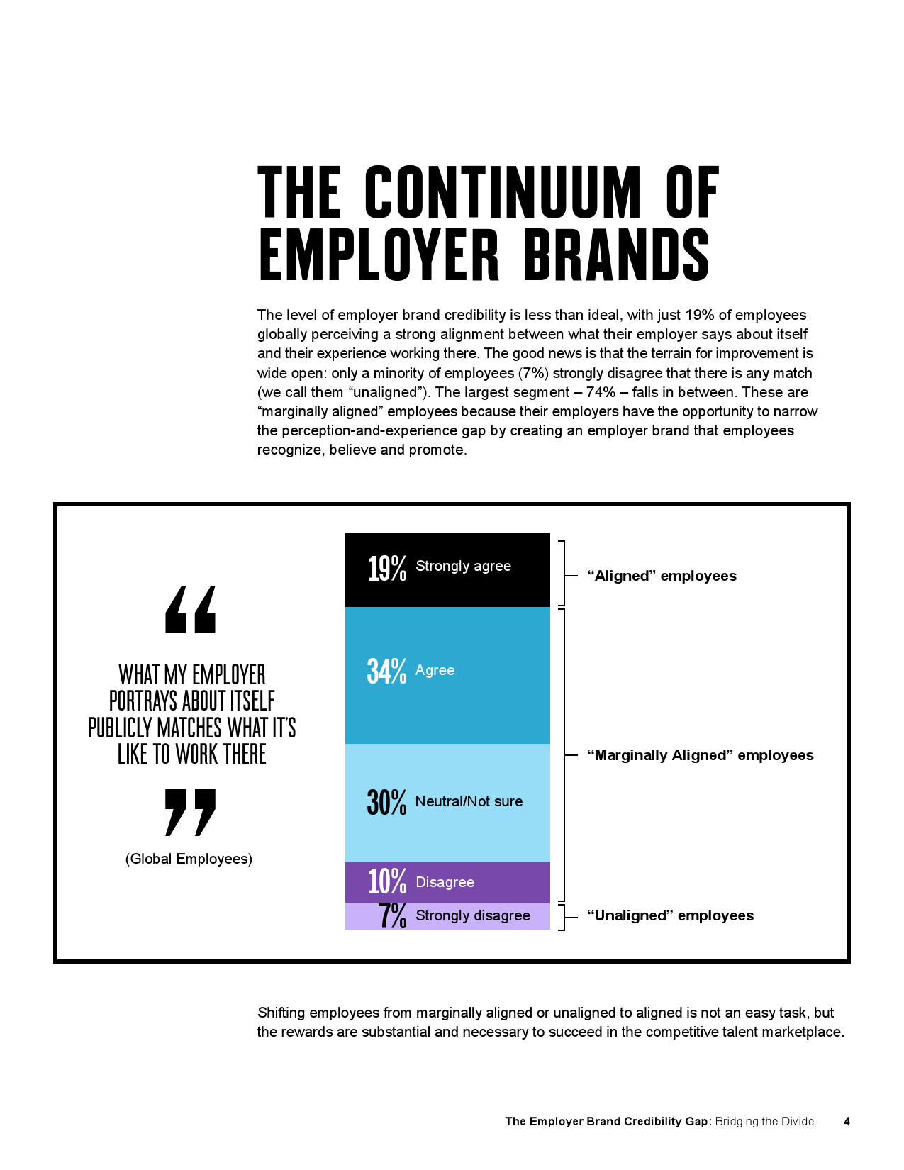 万博宣伟中国区总裁戴宏轩(Darren Burns)表示,“今天,员工不仅是在找工作,更是在寻找一家能让自己得到重视,其企业文化、理念和愿景与自己契合的公司。如果企业宣扬的品牌价值和实际表现存在脱节,雇主的信誉将会蒙受损失。一个可信的雇主品牌应该传播令人信服的、真实、可识别度高的,并能充分展现员工(包括文化、领导力、培训、职业发展机会以及沟通等多方面)在企业工作实际体验的品牌故事。”