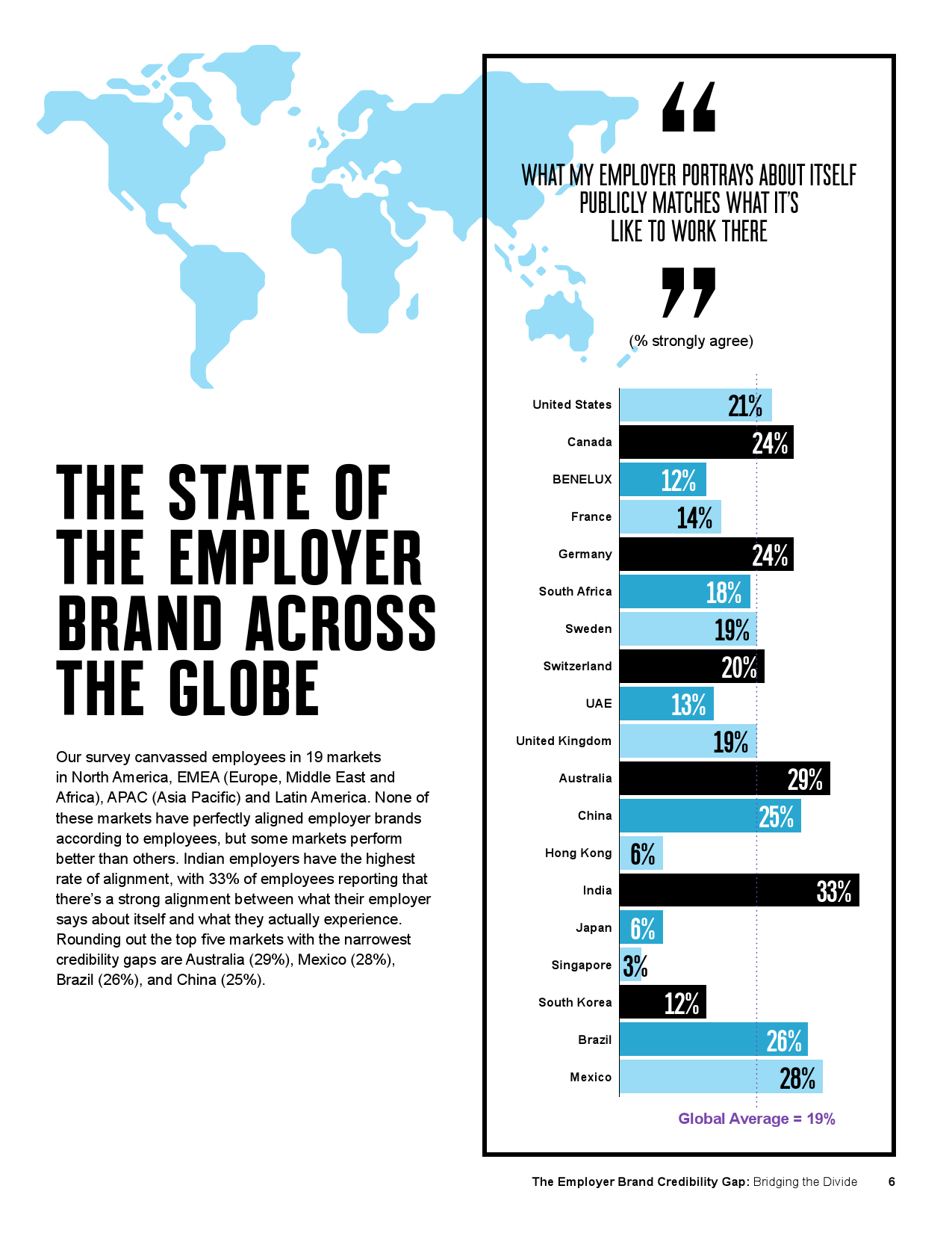万博宣伟发布的一项最新全球调查发现,全球仅19%的员工认为雇主传播宣扬的企业理念、愿景以及品牌价值匹配员工的实际工作体验。在亚太地区,印度员工是全球范围内认可比例最高的,33%的印度员工表示公司描述符合其实际体验。澳大利亚(29%)和中国(25%)也位居全球市场前五行列(另外两个是墨西哥:28%,巴西:26%)。但是,在新加坡,仅3%的员工表示雇主品牌匹配实际工作经历。