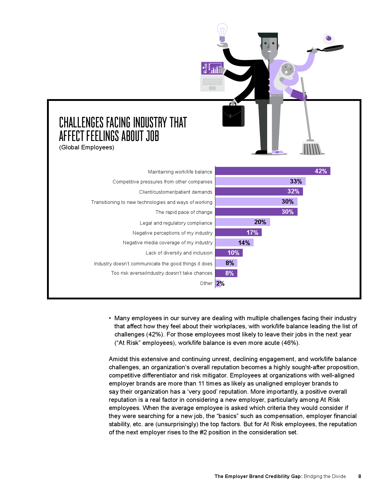 - 在我们的调查中,发现许多员工正在应对行业所面临的多重挑战,而这些挑战也影响到他们的职场感受,其中排在首位的是如何平衡工作和生活(42%)。