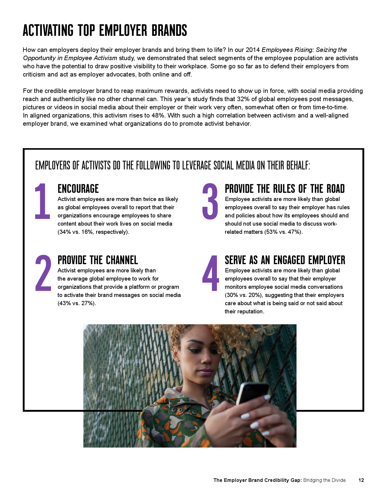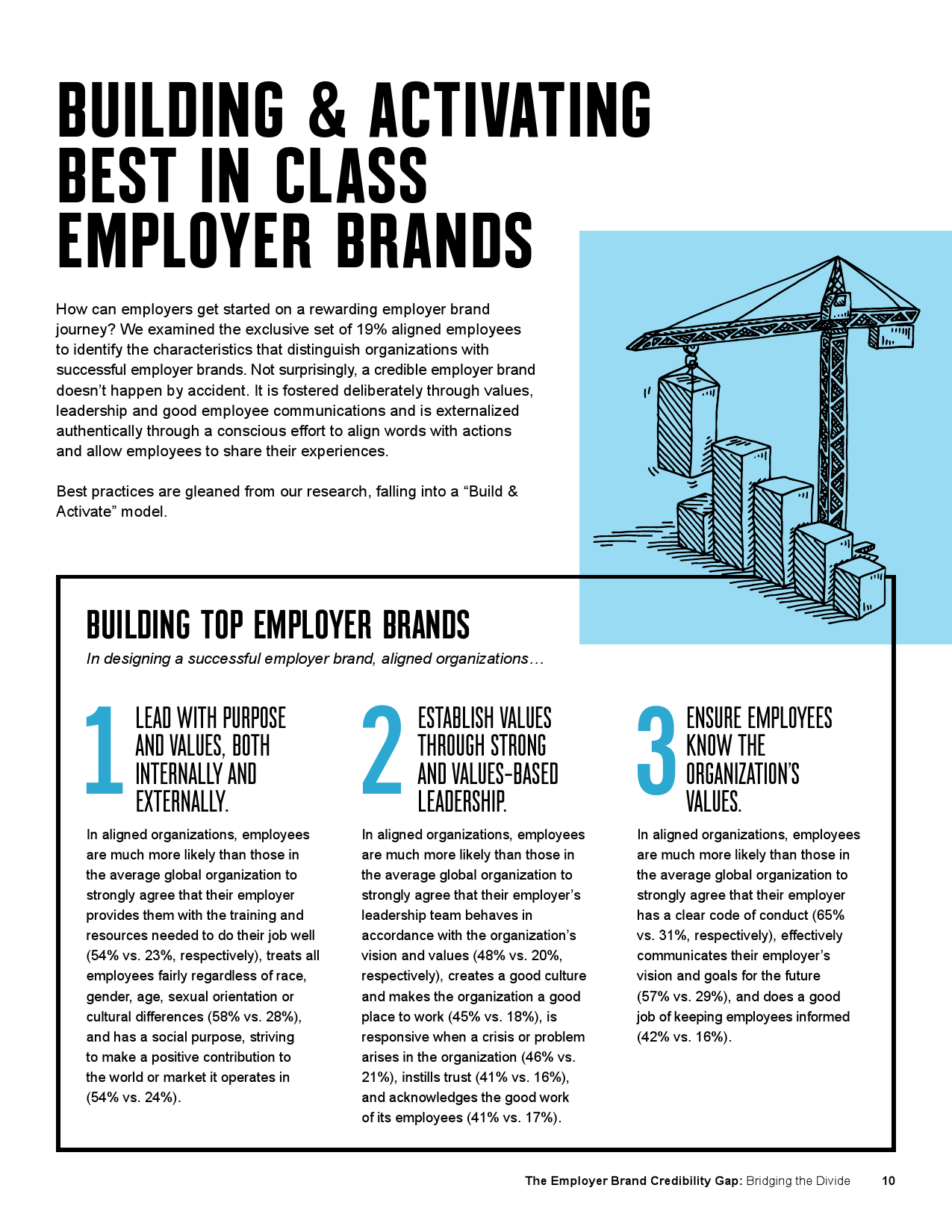 打造可信的雇主品牌不是一蹴而就的事,而是需要通过价值观和领导力的践行以及良好的员工沟通逐渐培养。企业要努力做到言行一致,允许员工分享实际工作经历,这样才能真正将其外化。以下列出了从我们的研究中获取的建设和激活雇主品牌的最佳实践总结。相关详细说明可以参见我们的报告。