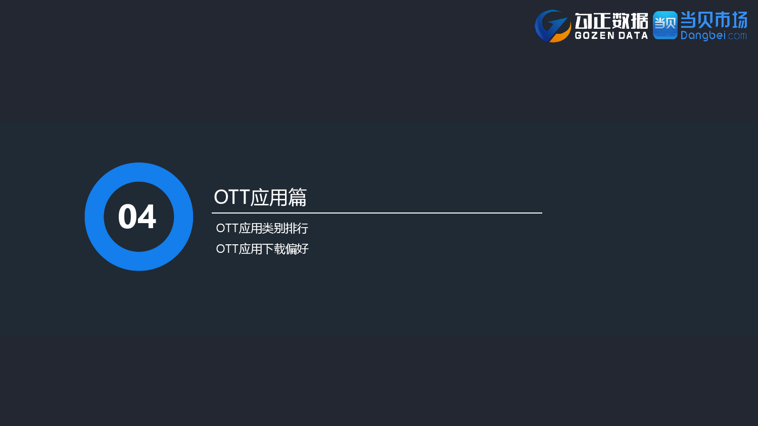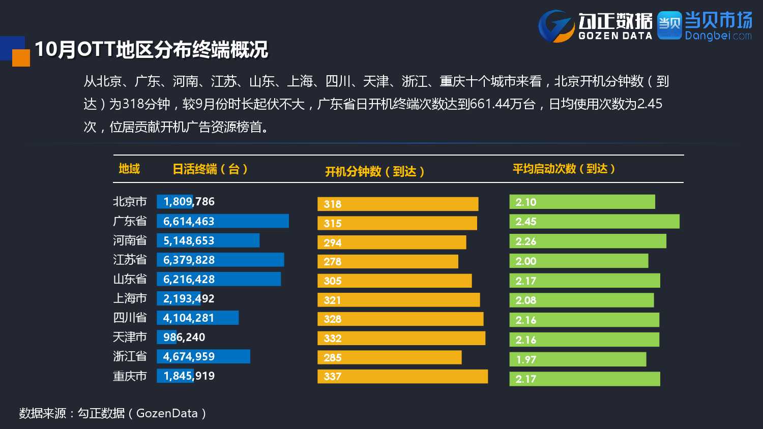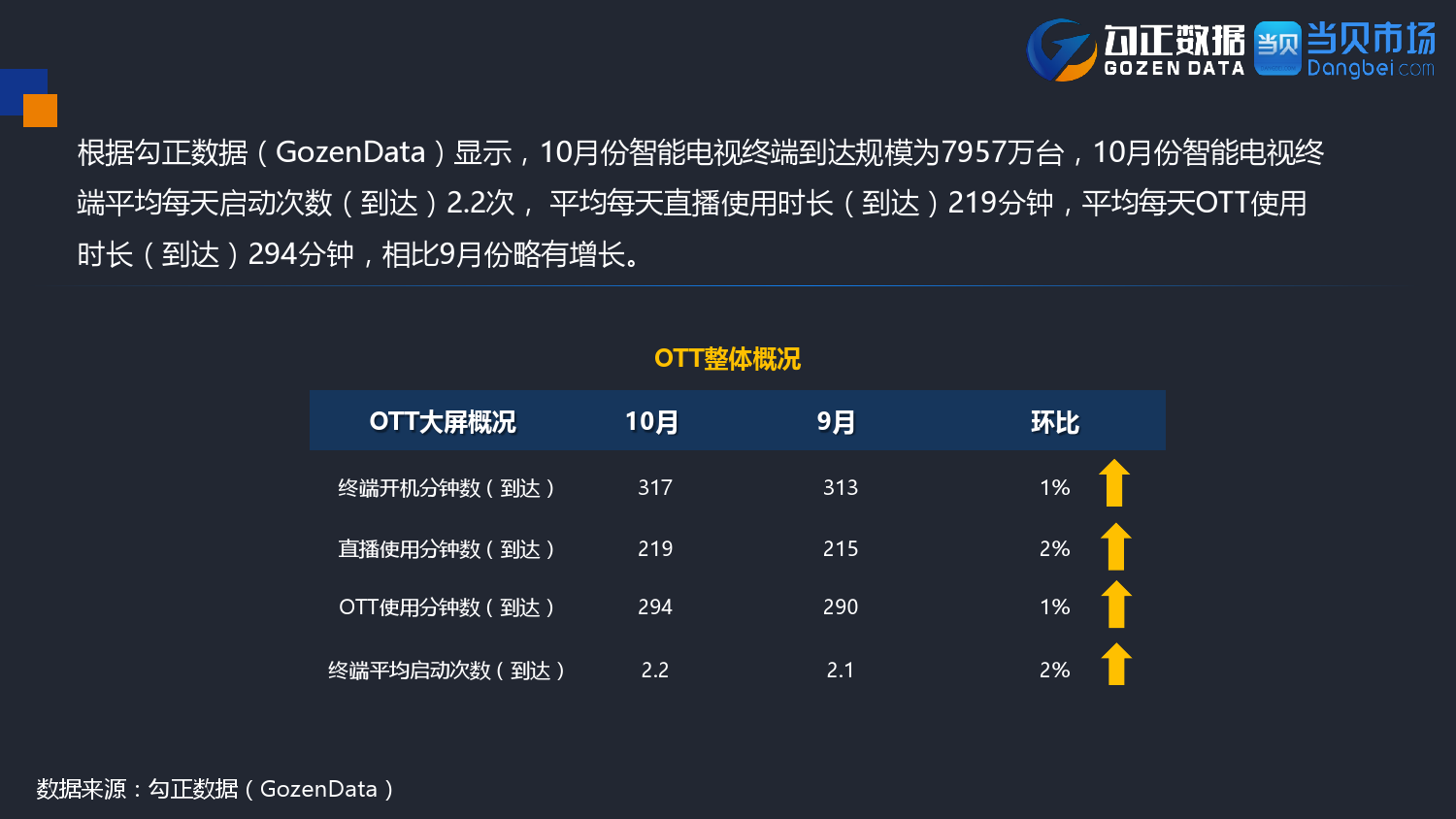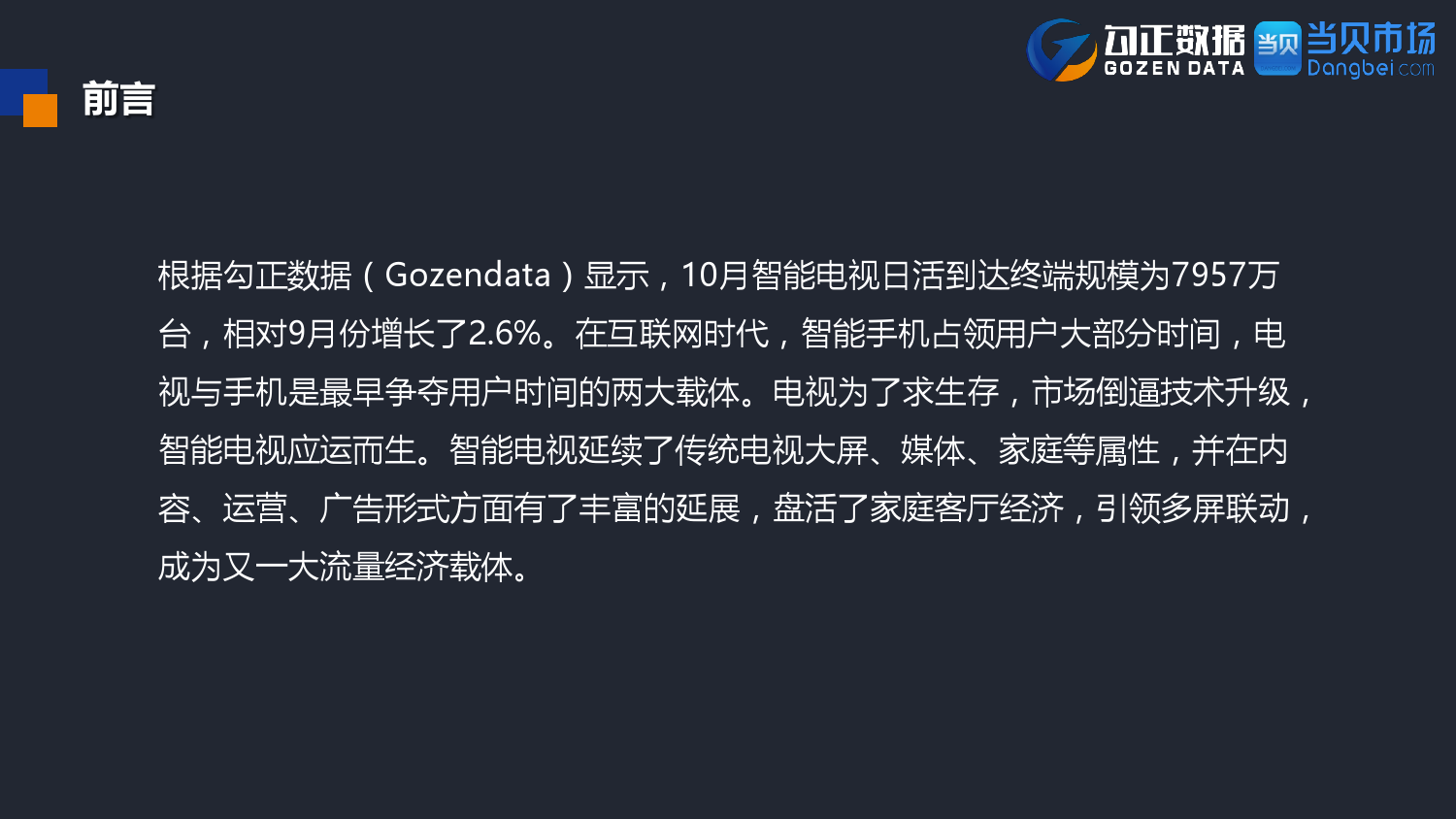 勾正数据&当贝网络:2017年10月OTT行业报告 PDF版本将同步到199IT交流群,199IT感谢您的支持! 更多阅读:勾正数据:2017年OTT行业发展报告勾正数据:2019年OTT大屏家庭春节营销报告勾正数据:2020智慧屏行业发展白皮书勾正数据:2020年8月智能电视大数据月度报告勾正数据:2020上半年智慧屏行业发展白皮书勾正数据:2020年7月智能电视大数据报告勾正数据:2019上半年家庭智能大屏产业生态报告勾正数据:2019年5月智能电视大数据报告勾正数据:2019年4月智能电视大数据报告勾正数据:2018年5月智能电视大数据报告勾正数据:2018年Q1大屏洞察报告勾正数据:2017年8月智能电视大数据报告勾正数据:2017年上半年智能电视大数据报告勾正数据:2019年8月5-11日智能电视大数据周报奥维互娱:2020年国庆假期OTT大屏用户行为报告