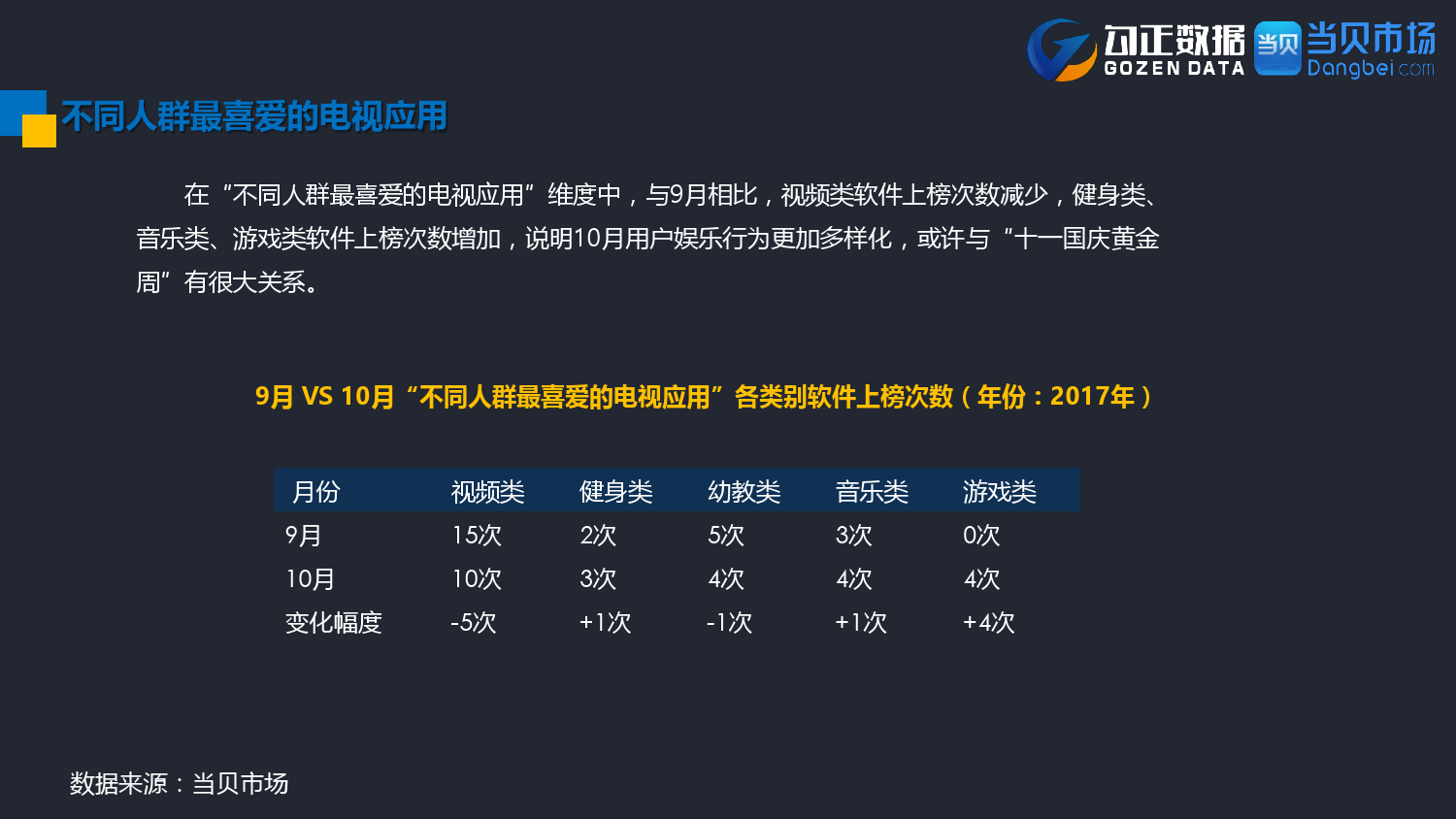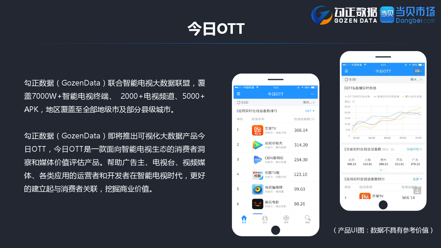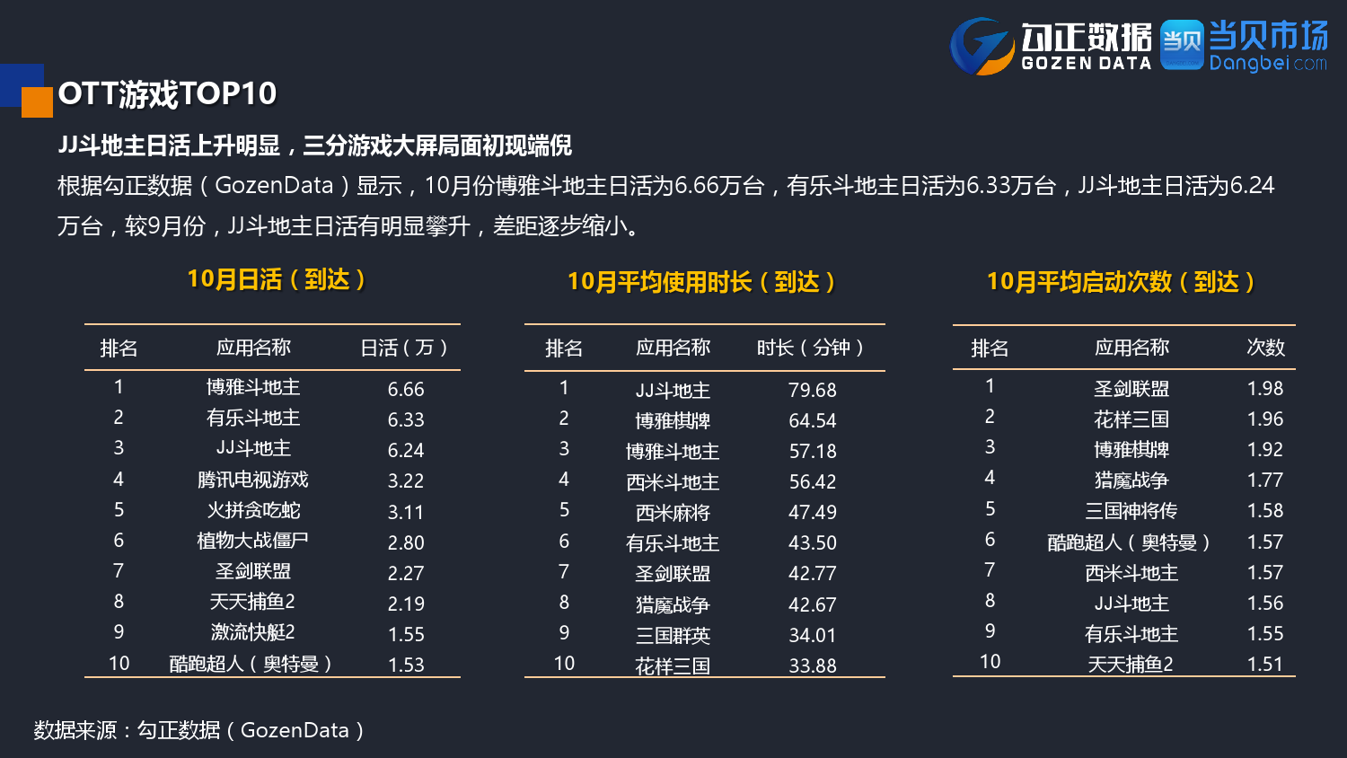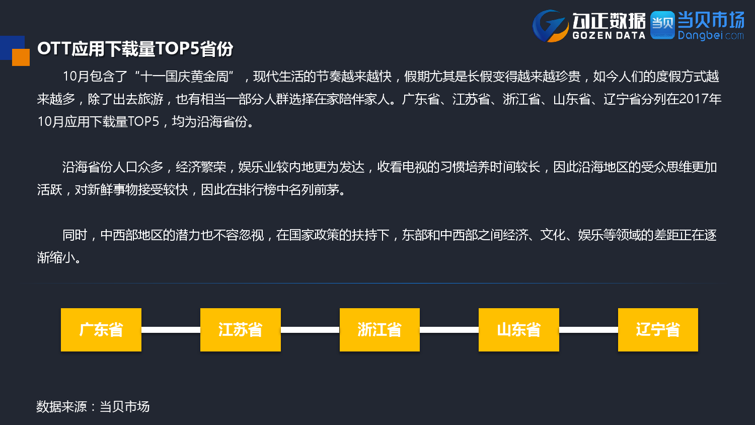 勾正数据&当贝网络:2017年10月OTT行业报告 PDF版本将同步到199IT交流群,199IT感谢您的支持! 更多阅读:勾正数据:2017年OTT行业发展报告勾正数据:2019年OTT大屏家庭春节营销报告勾正数据:2020智慧屏行业发展白皮书勾正数据:2020年8月智能电视大数据月度报告勾正数据:2020上半年智慧屏行业发展白皮书勾正数据:2020年7月智能电视大数据报告勾正数据:2019上半年家庭智能大屏产业生态报告勾正数据:2019年5月智能电视大数据报告勾正数据:2019年4月智能电视大数据报告勾正数据:2018年5月智能电视大数据报告勾正数据:2018年Q1大屏洞察报告勾正数据:2017年8月智能电视大数据报告勾正数据:2017年上半年智能电视大数据报告勾正数据:2019年8月5-11日智能电视大数据周报奥维互娱:2020年国庆假期OTT大屏用户行为报告