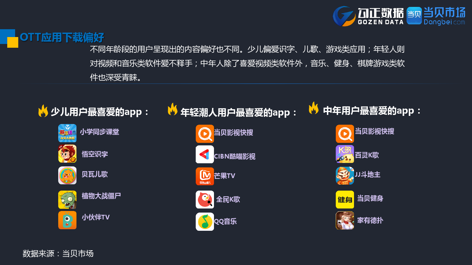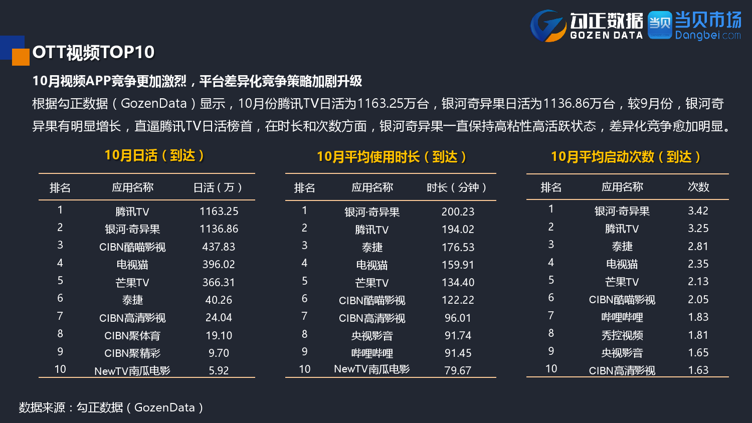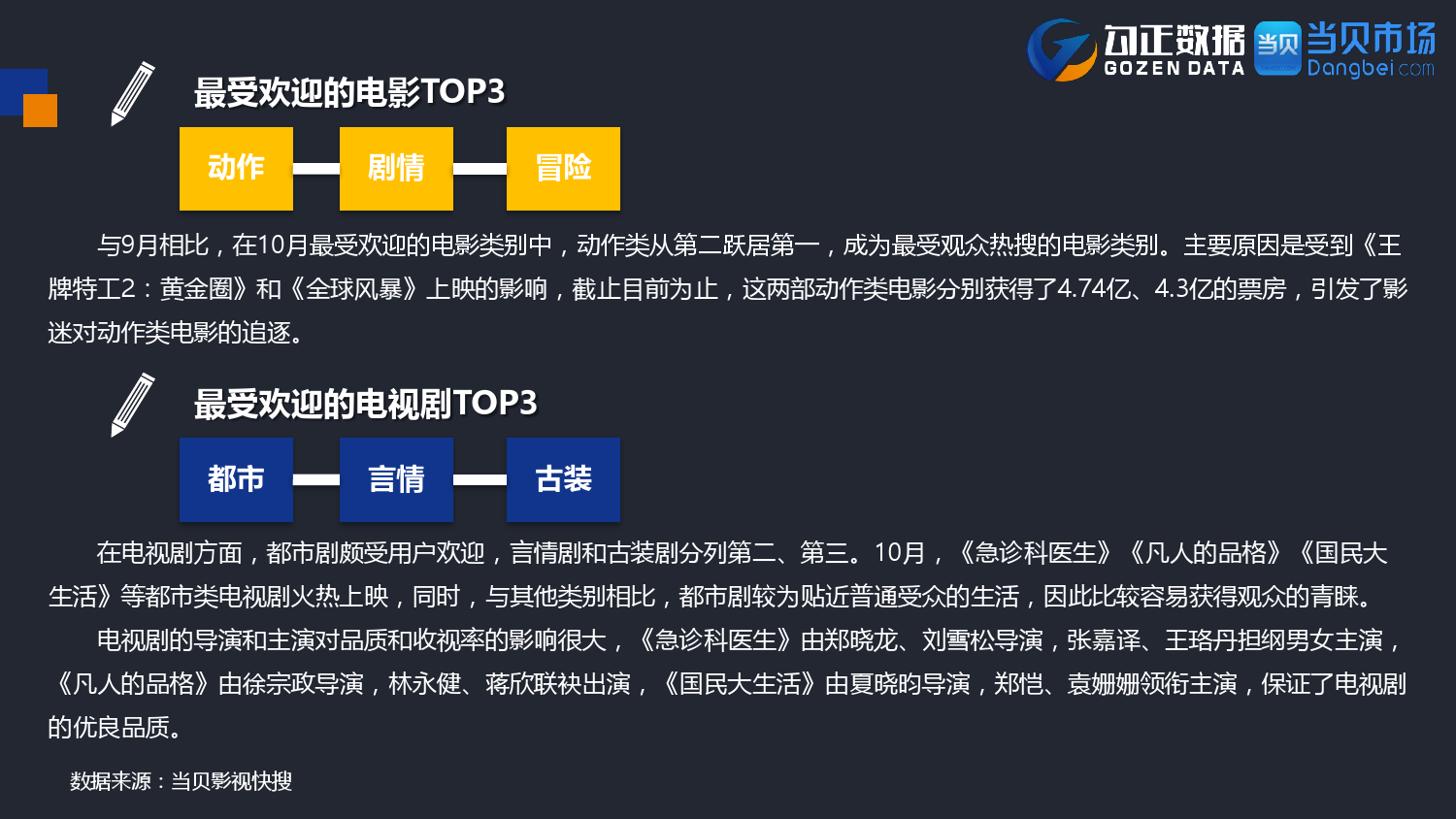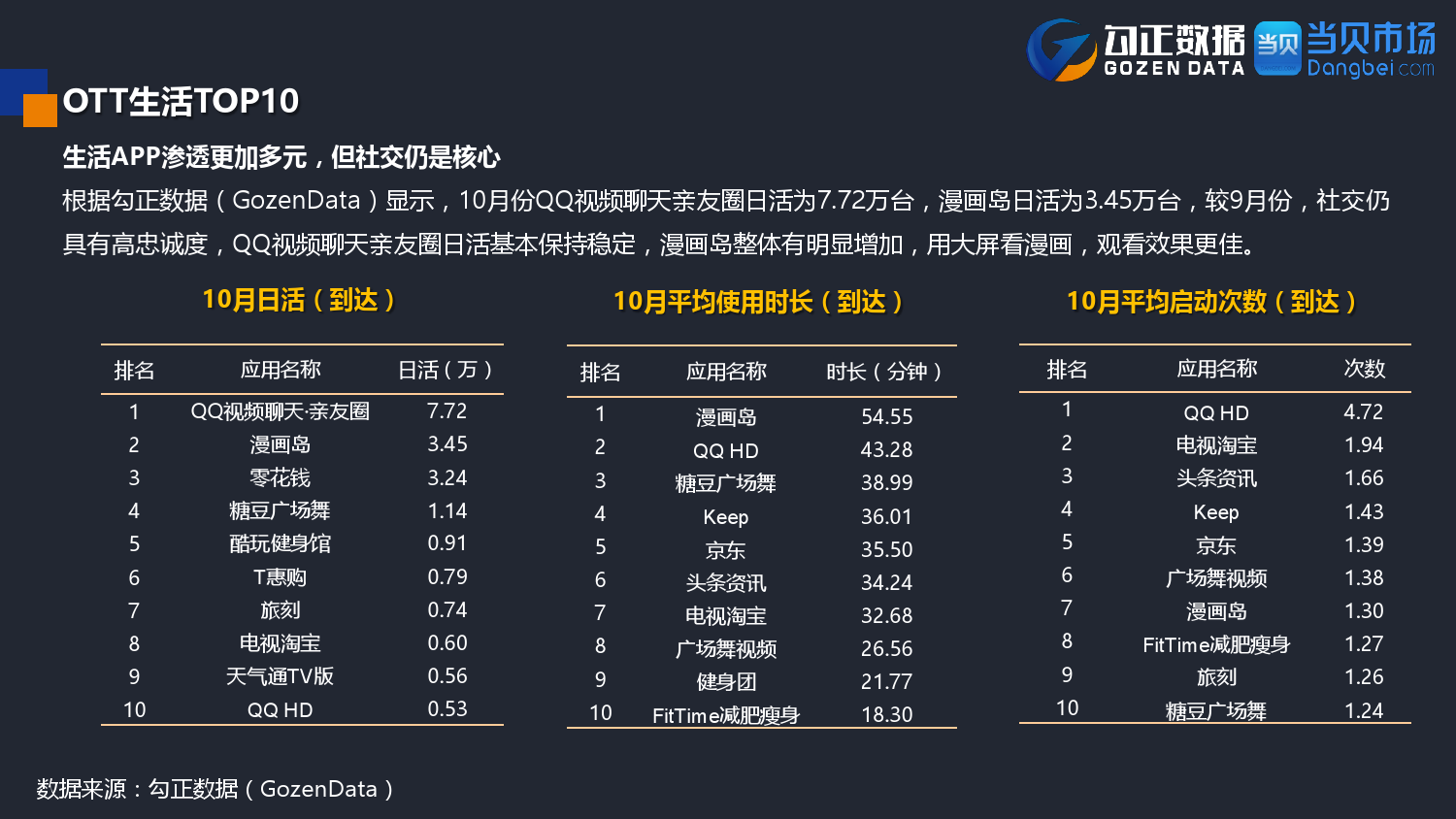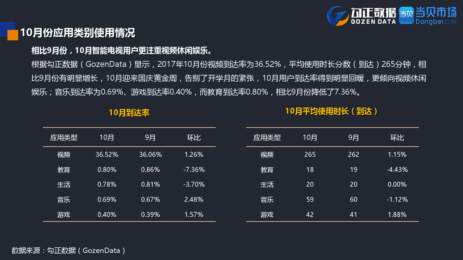 勾正数据&当贝网络:2017年10月OTT行业报告 PDF版本将同步到199IT交流群,199IT感谢您的支持! 更多阅读:勾正数据:2017年OTT行业发展报告勾正数据:2019年OTT大屏家庭春节营销报告勾正数据:2020智慧屏行业发展白皮书勾正数据:2020年8月智能电视大数据月度报告勾正数据:2020上半年智慧屏行业发展白皮书勾正数据:2020年7月智能电视大数据报告勾正数据:2019上半年家庭智能大屏产业生态报告勾正数据:2019年5月智能电视大数据报告勾正数据:2019年4月智能电视大数据报告勾正数据:2018年5月智能电视大数据报告勾正数据:2018年Q1大屏洞察报告勾正数据:2017年8月智能电视大数据报告勾正数据:2017年上半年智能电视大数据报告勾正数据:2019年8月5-11日智能电视大数据周报奥维互娱:2020年国庆假期OTT大屏用户行为报告