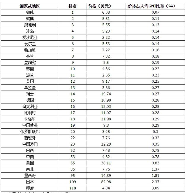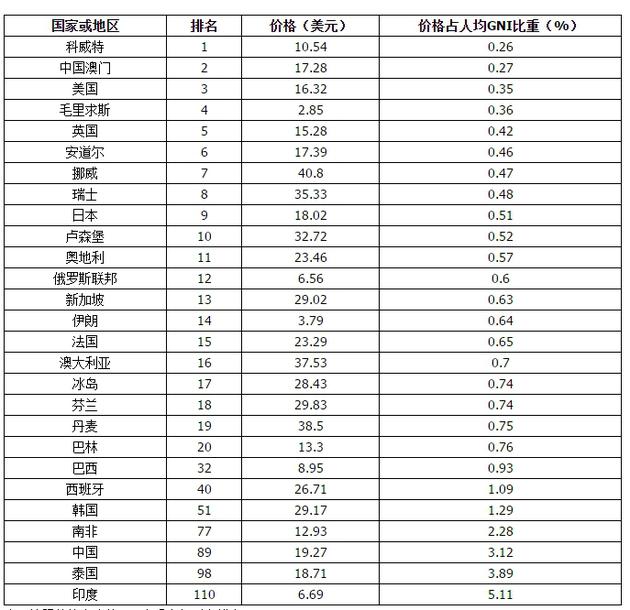 ITU首先调查并计算出各个国家和地区的各指标情况,换算成美元得到绝对价格;然后根据该绝对价格占居民月人均国民总收入(GNI)的比重,计算得到相对价格;最后按相对价格由低到高的顺序进行全球排名。