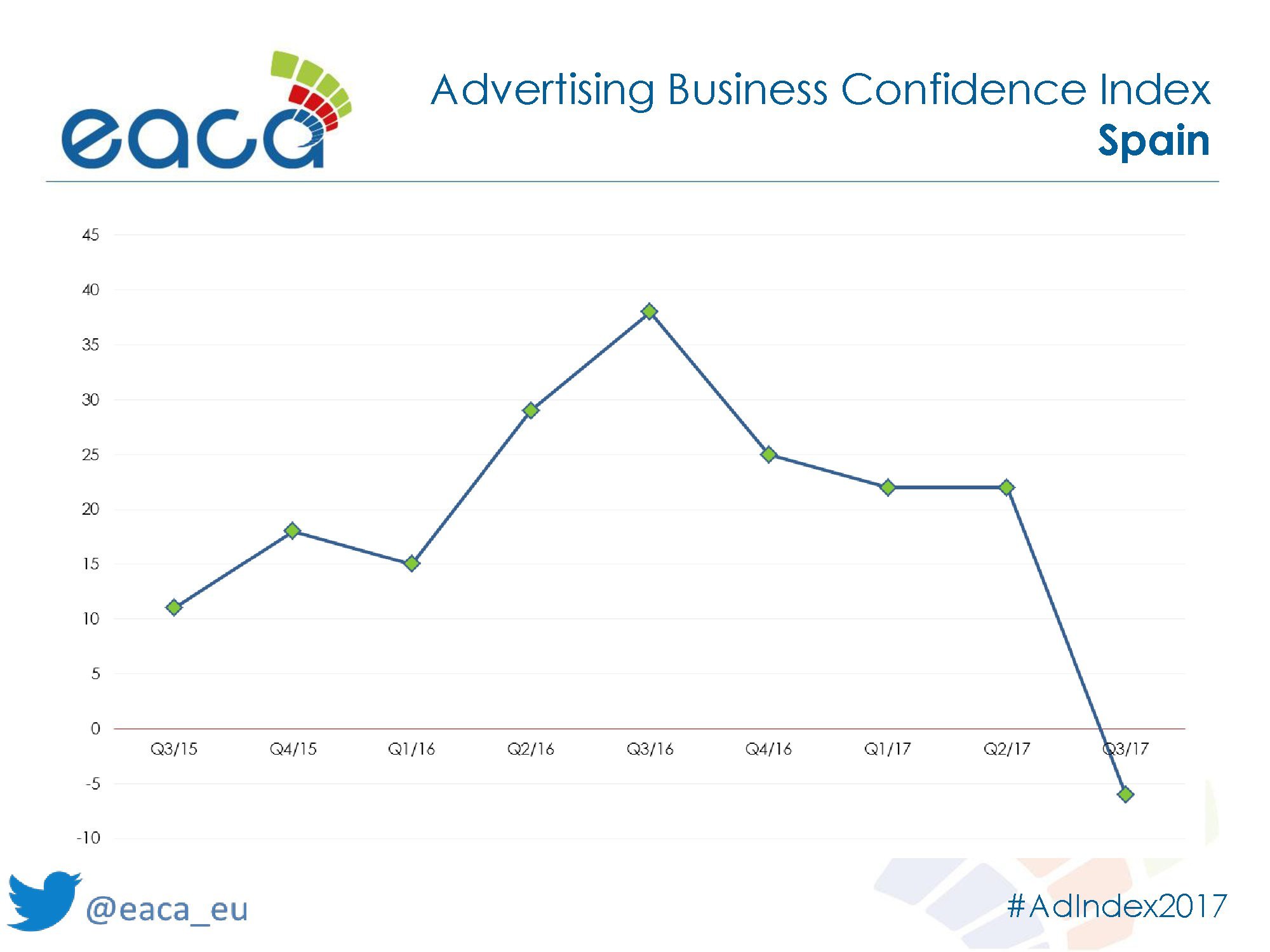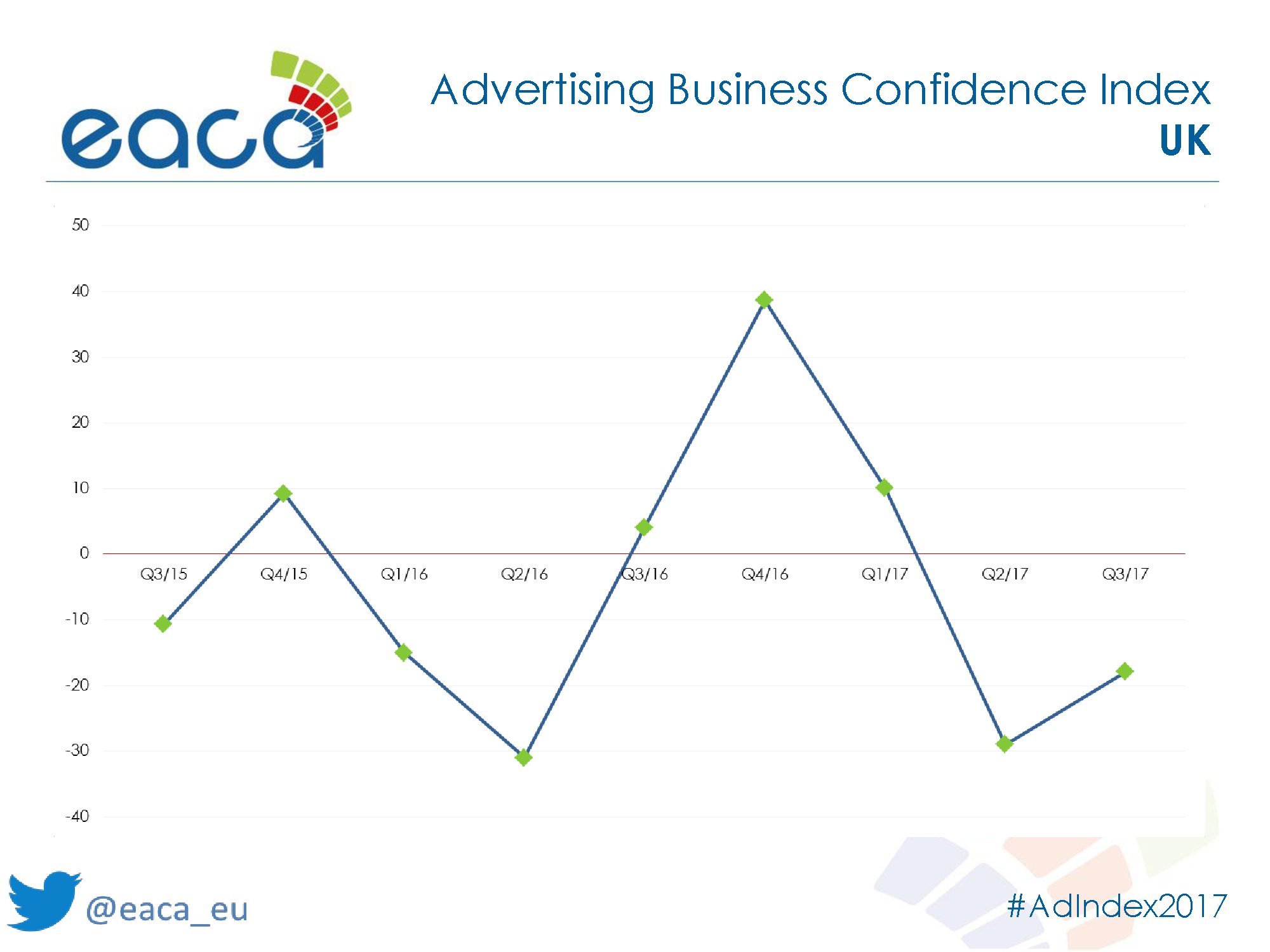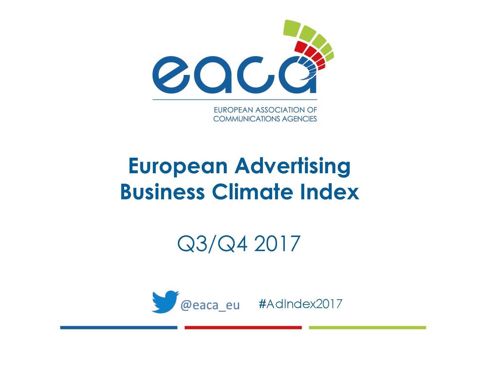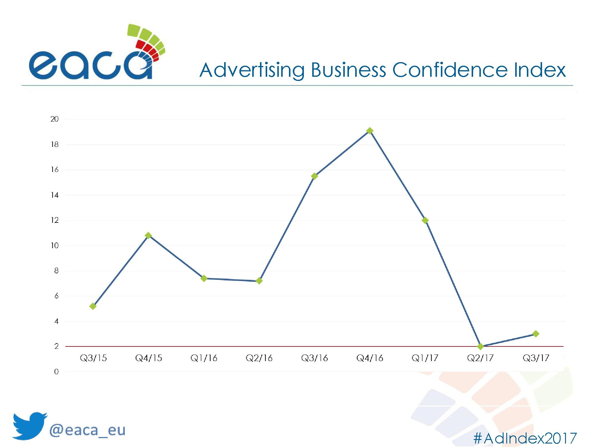欧洲传播代理协会(EACA)发布了“2017年第三季度欧洲广告业指数”。由于第三季度欧洲业务信心指数略有增长,上半年广告和营销部门信心指数快速下滑趋势停止。广告业务信心指数从2017年7月的+2增长至+3。而上半年广告业信心指数则下降了16个点。