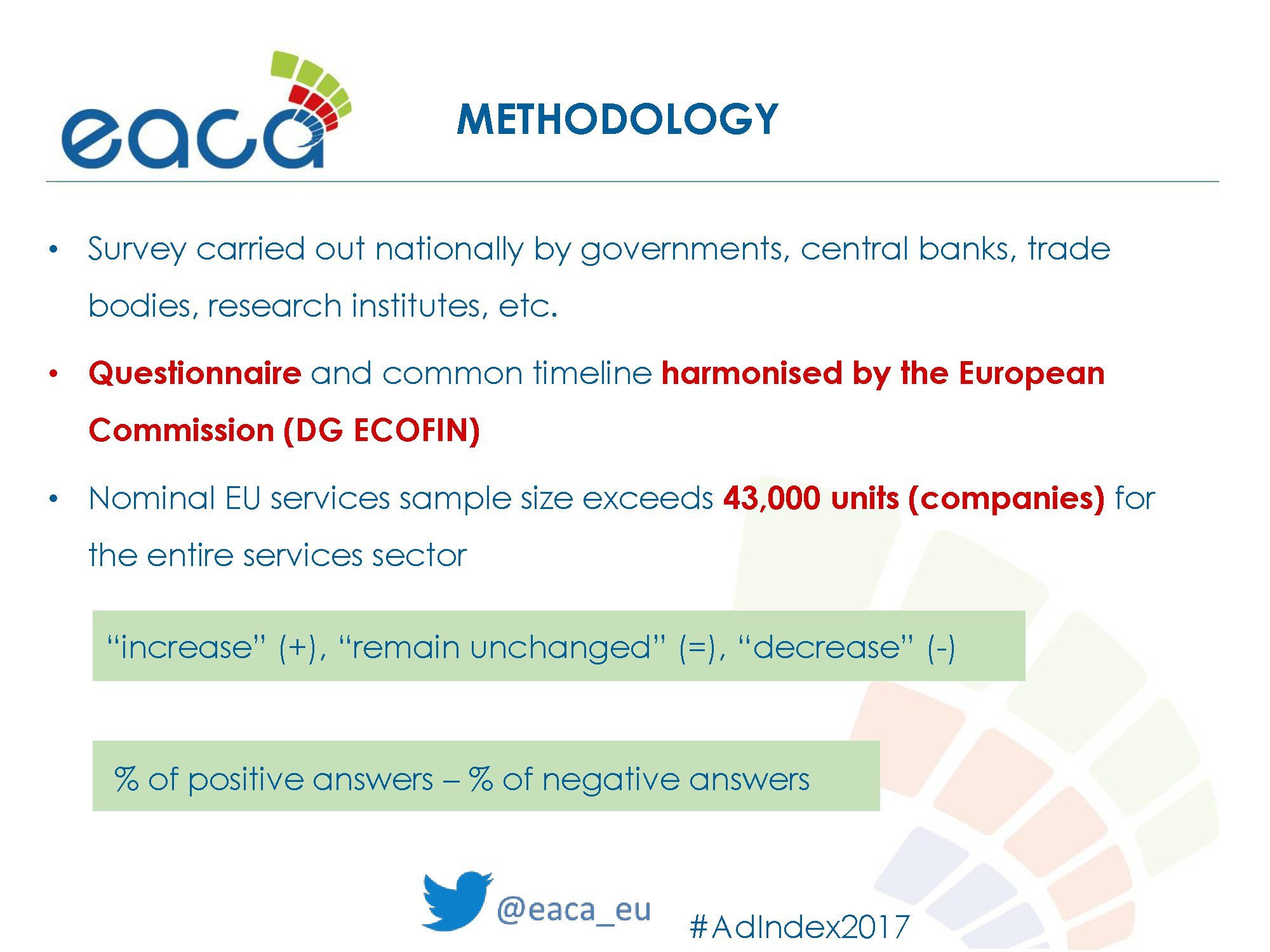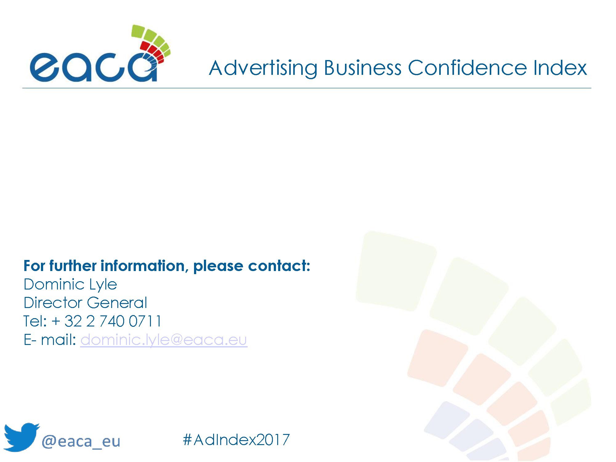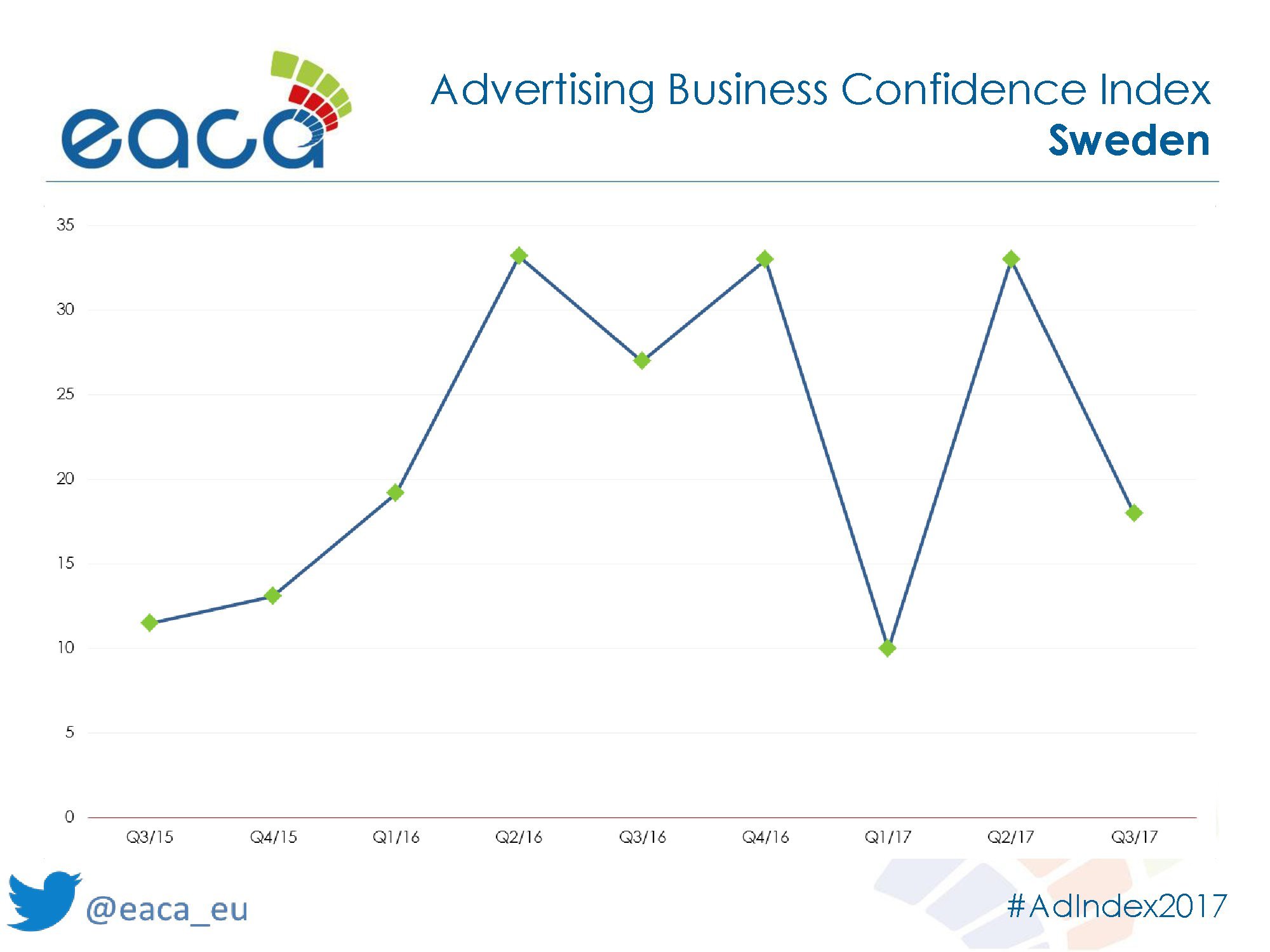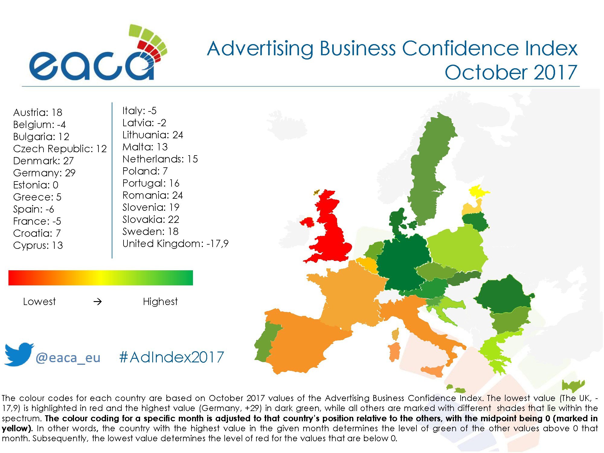 欧洲传播代理协会(EACA)发布了“2017年第三季度欧洲广告业指数”。由于第三季度欧洲业务信心指数略有增长,上半年广告和营销部门信心指数快速下滑趋势停止。广告业务信心指数从2017年7月的+2增长至+3。而上半年广告业信心指数则下降了16个点。