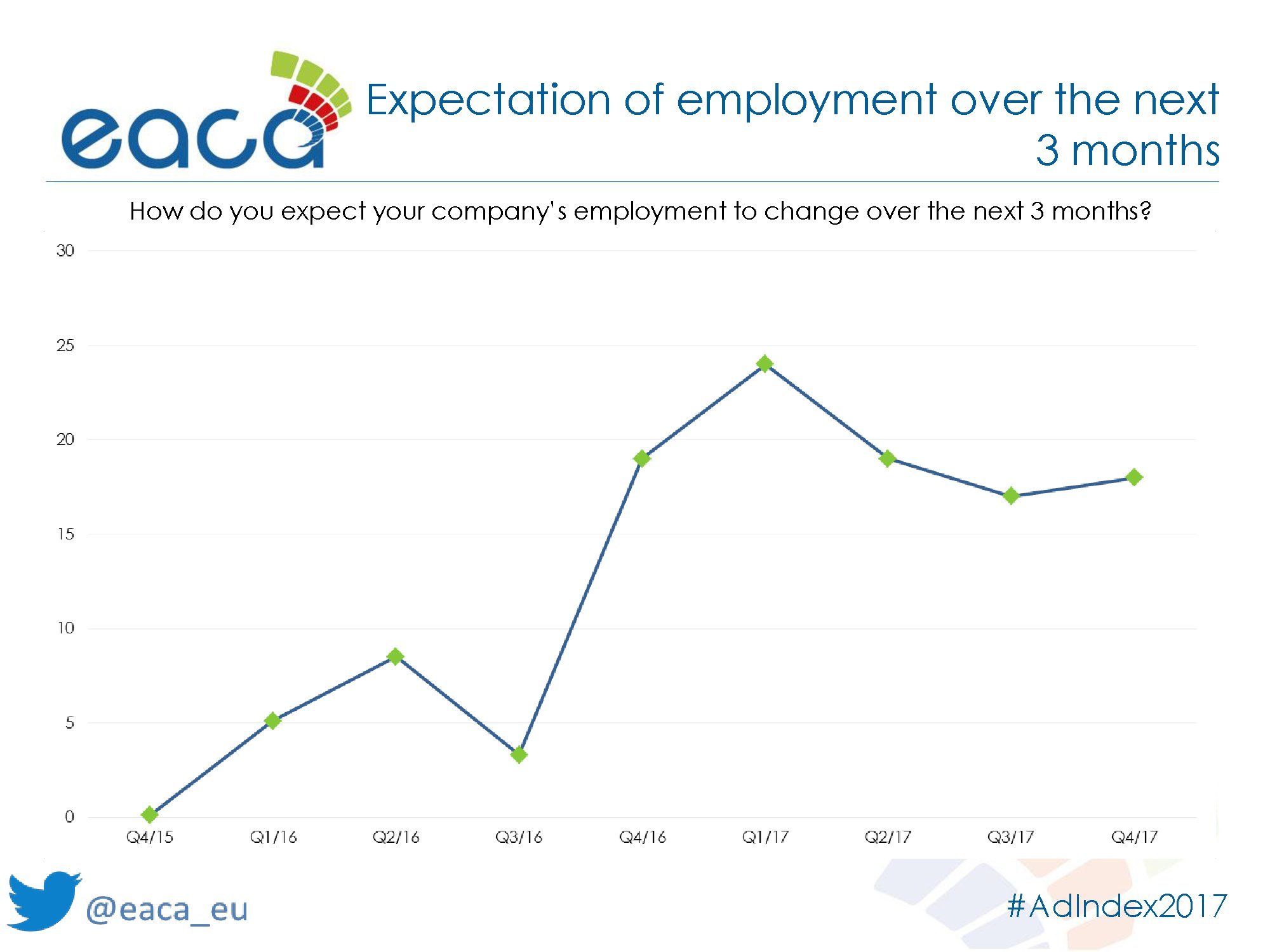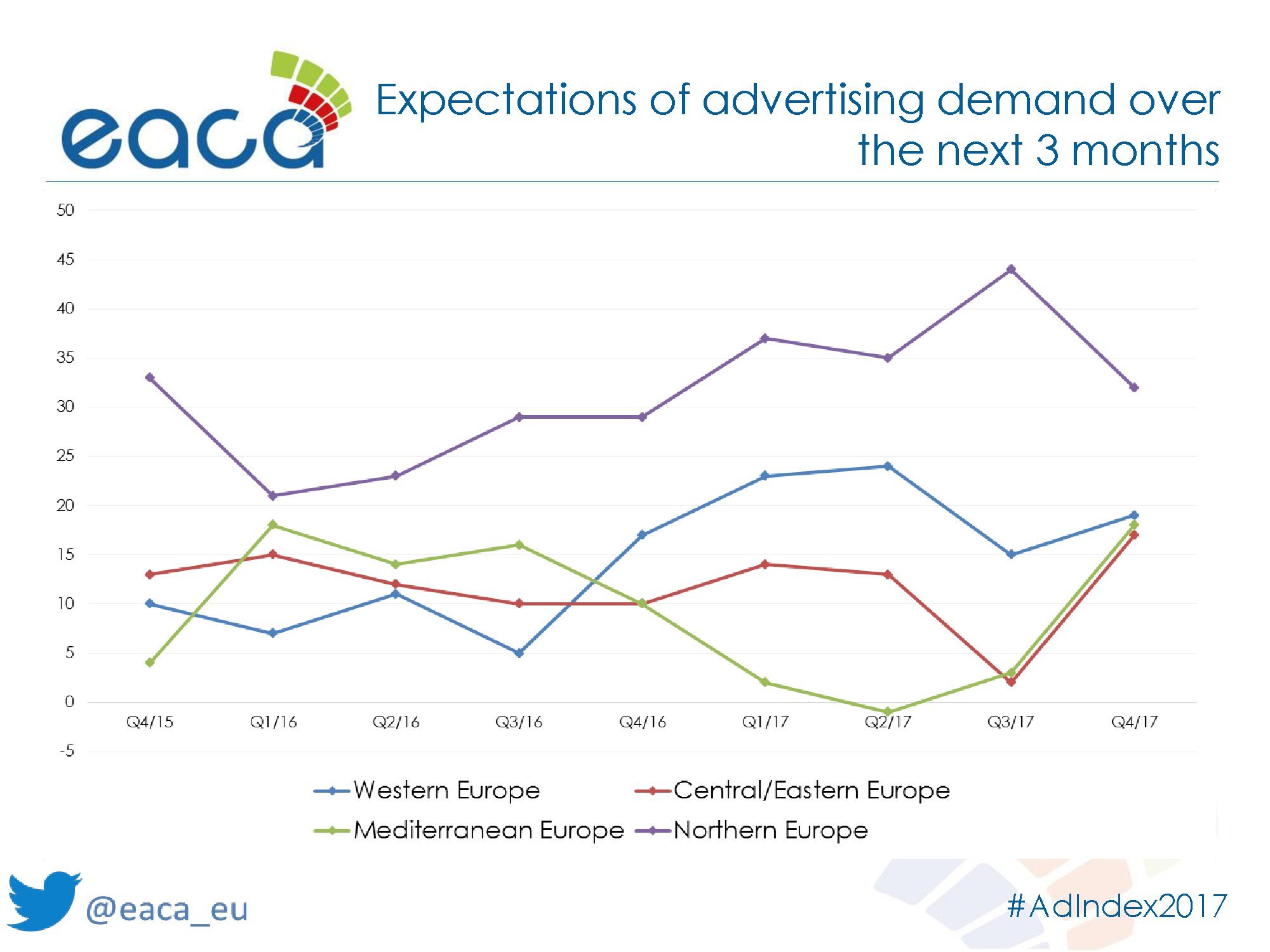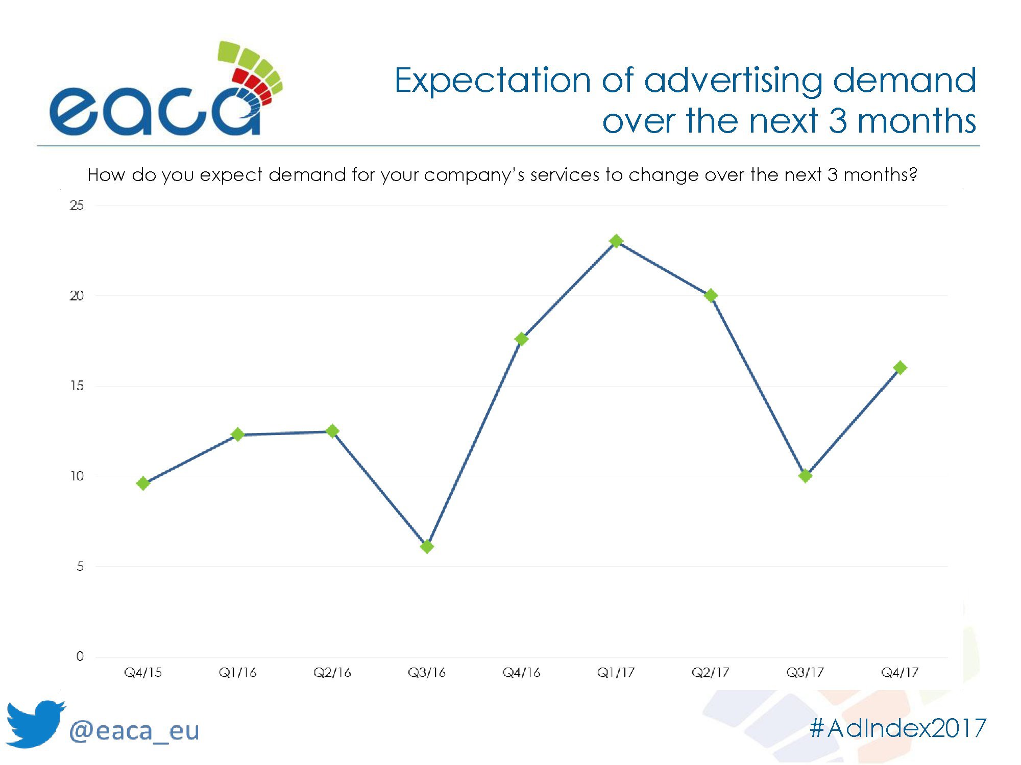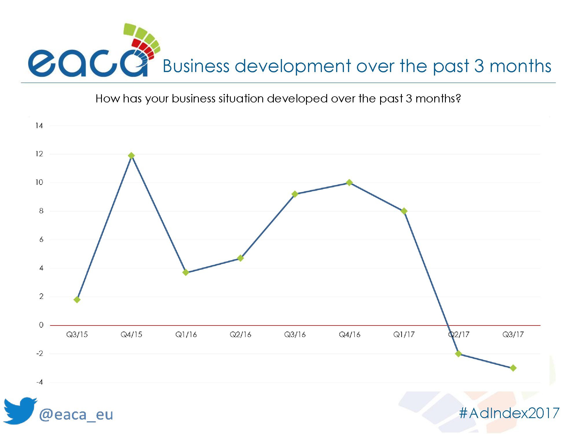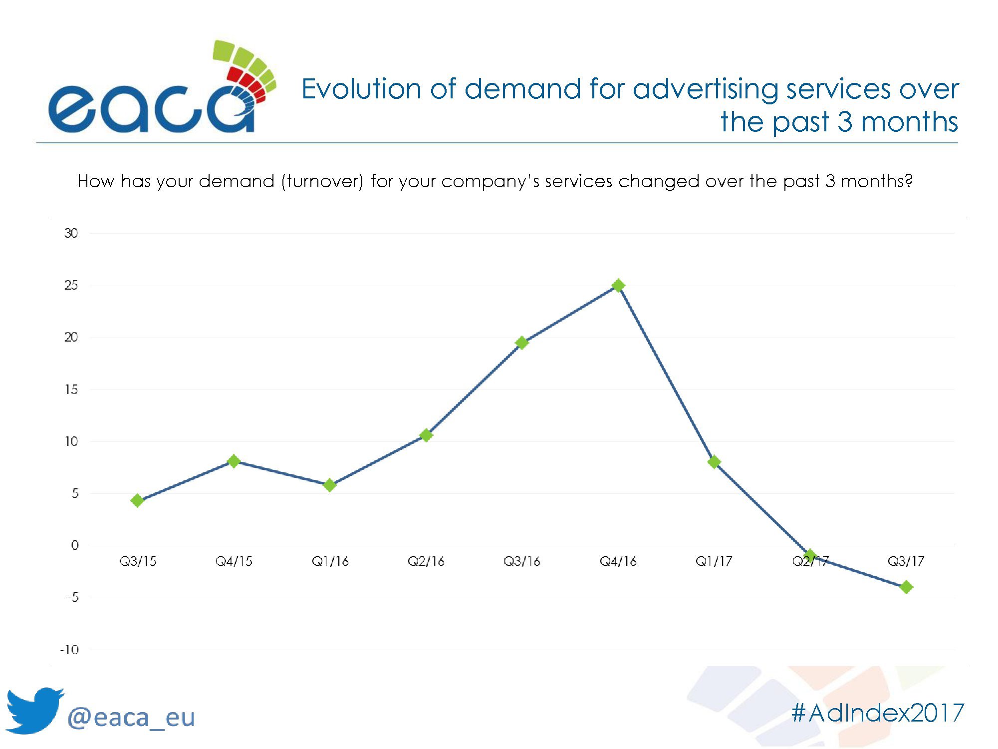 广告业务指数显示了过去三个月广告业务发展(-3)和广告需求(-4)的变化情况。这两个指标和之前的数值(-2和-1)比进一步下降。另一方面,预计未来三个月,欧洲广告需求和销售价格将明显上涨。