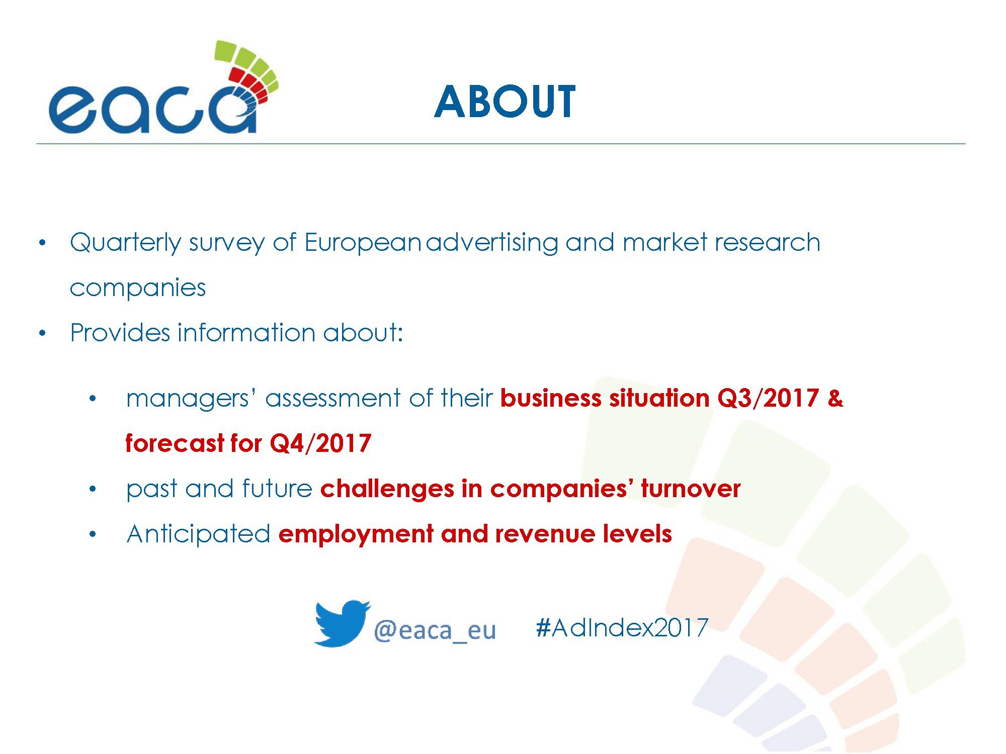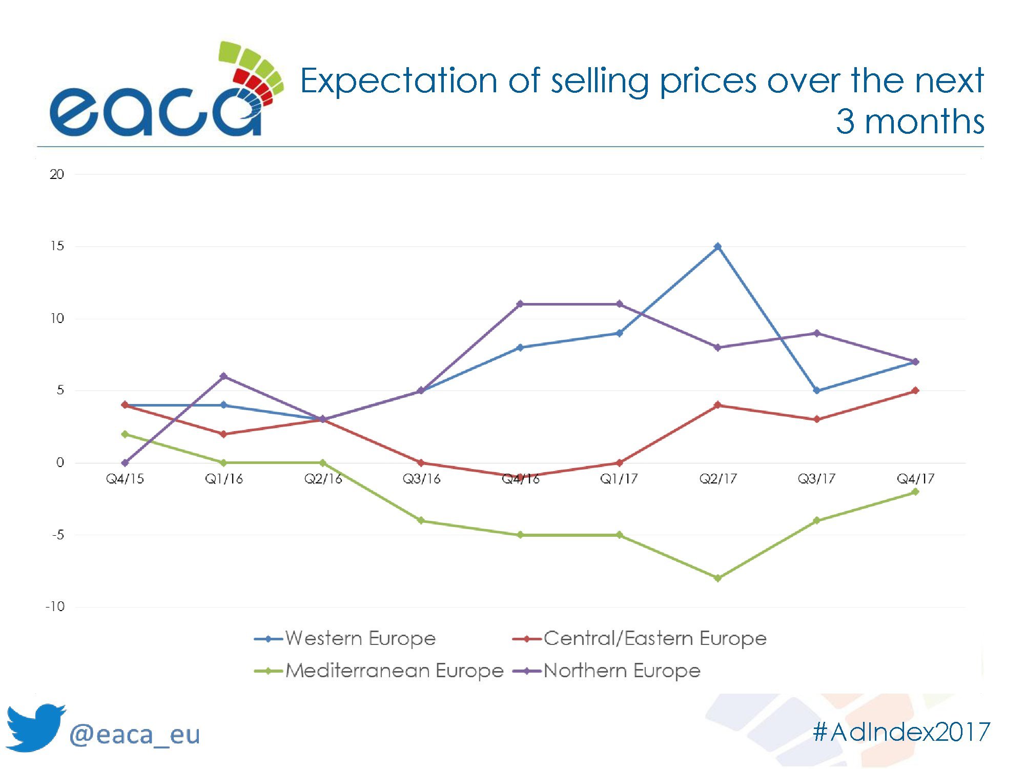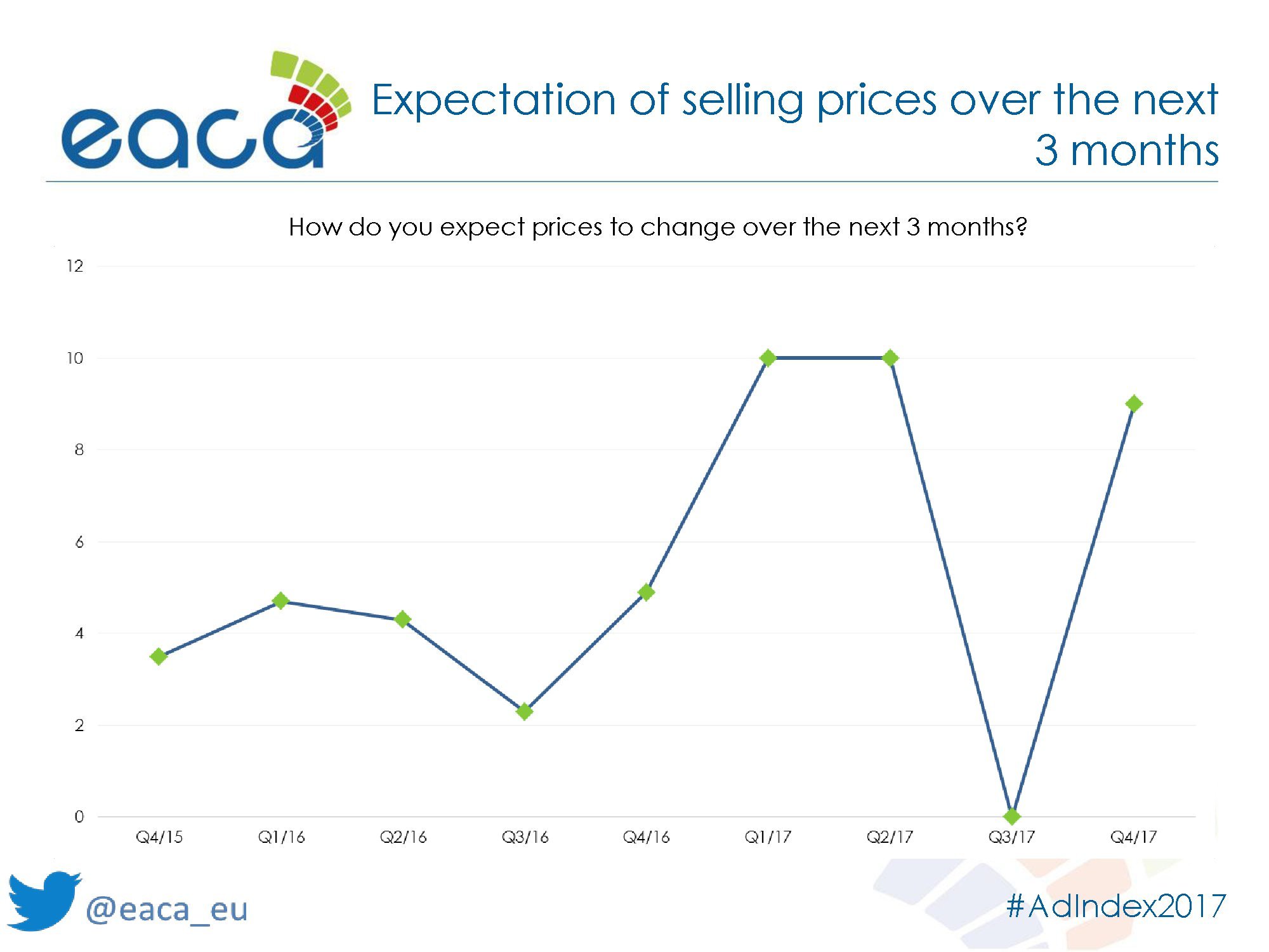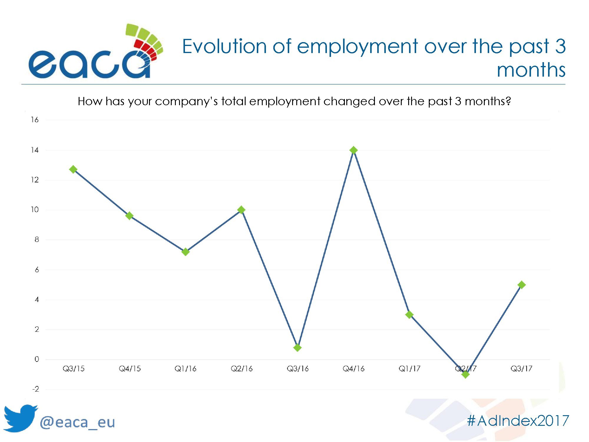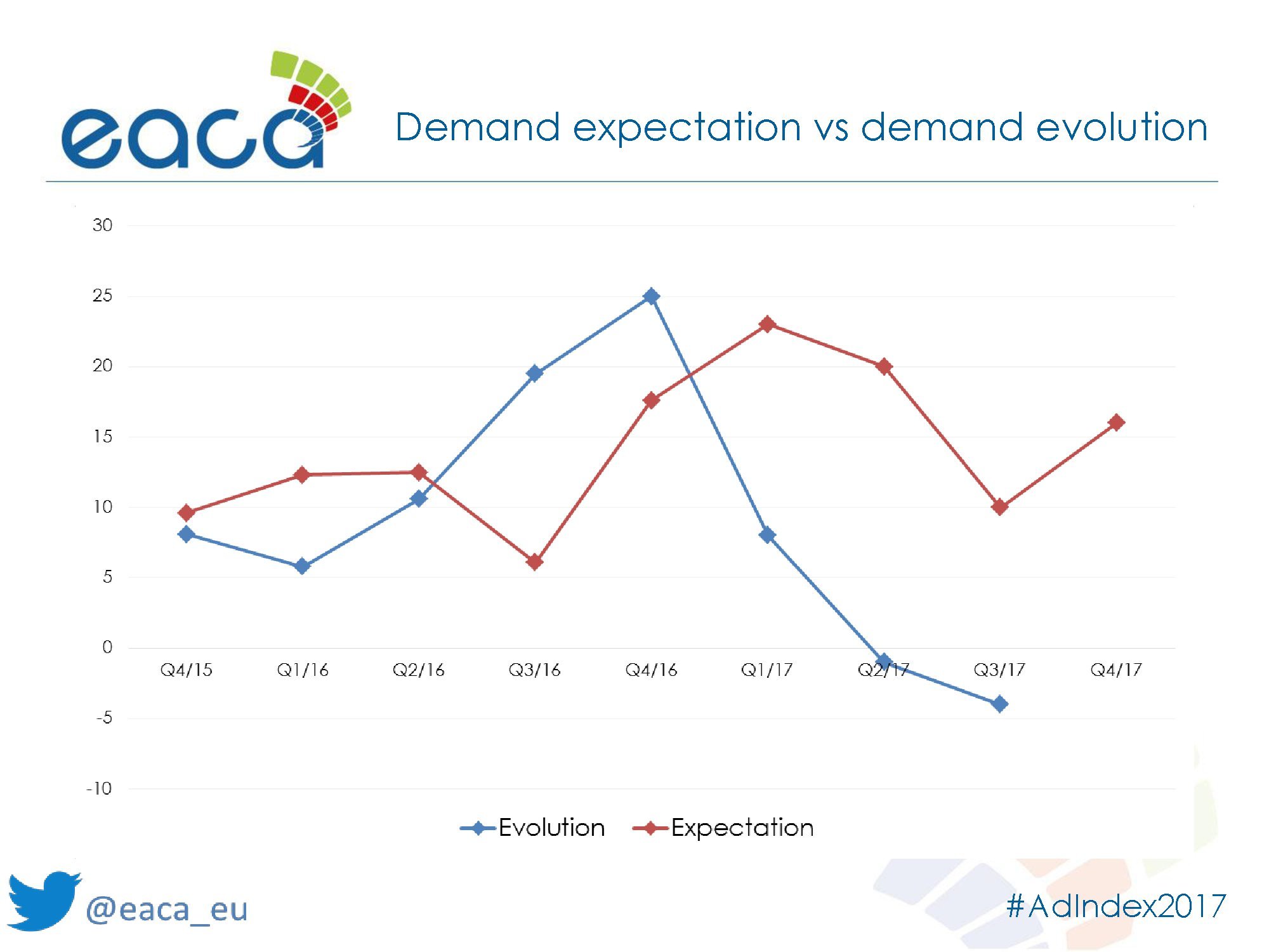 广告业务指数显示了过去三个月广告业务发展(-3)和广告需求(-4)的变化情况。这两个指标和之前的数值(-2和-1)比进一步下降。另一方面,预计未来三个月,欧洲广告需求和销售价格将明显上涨。