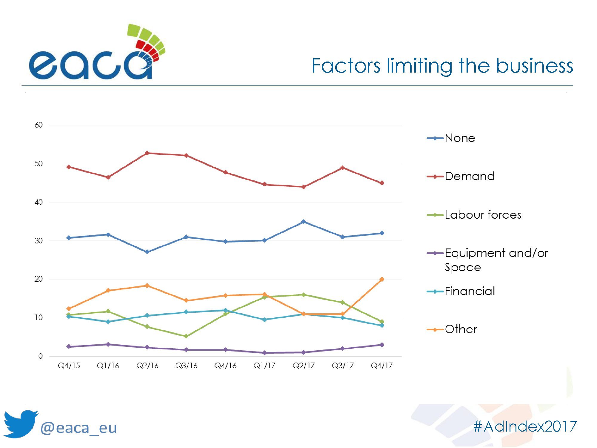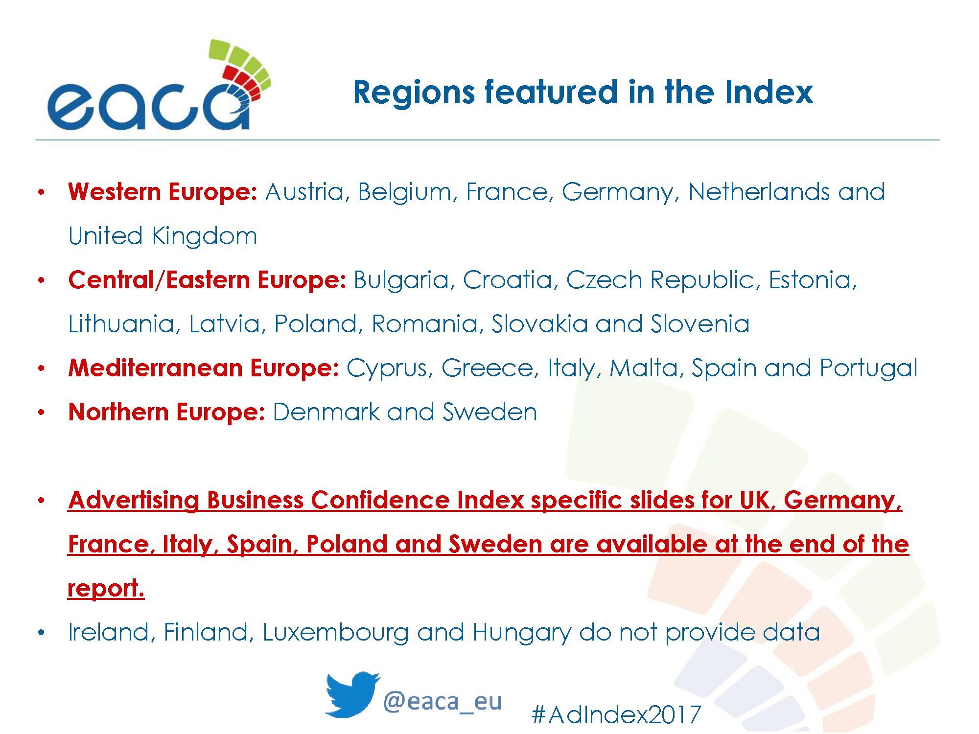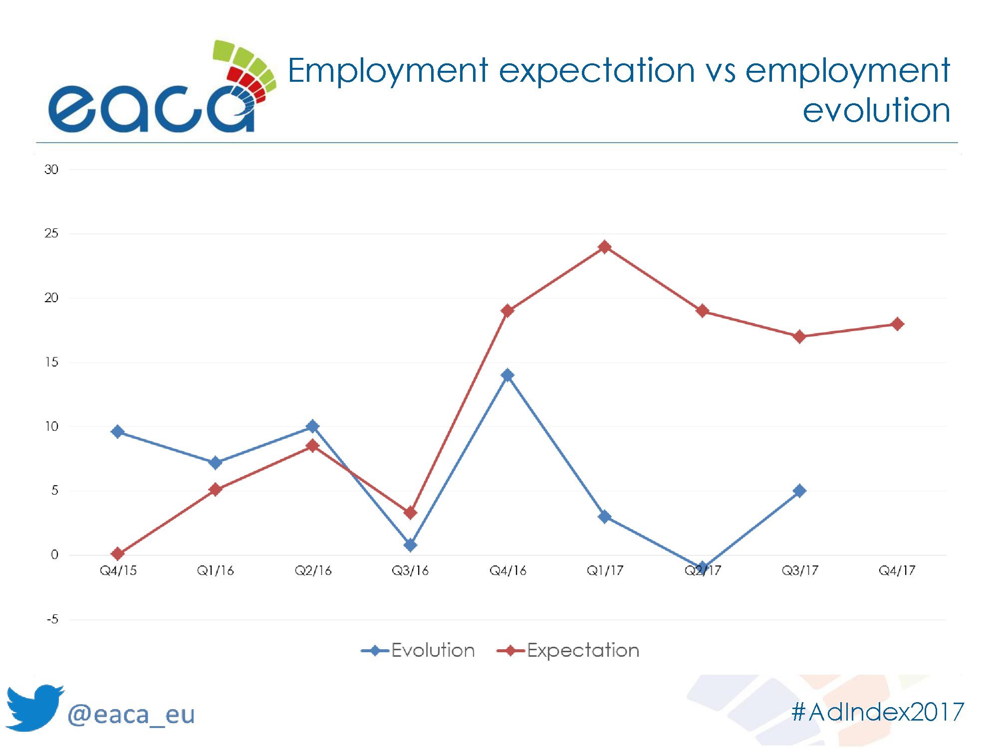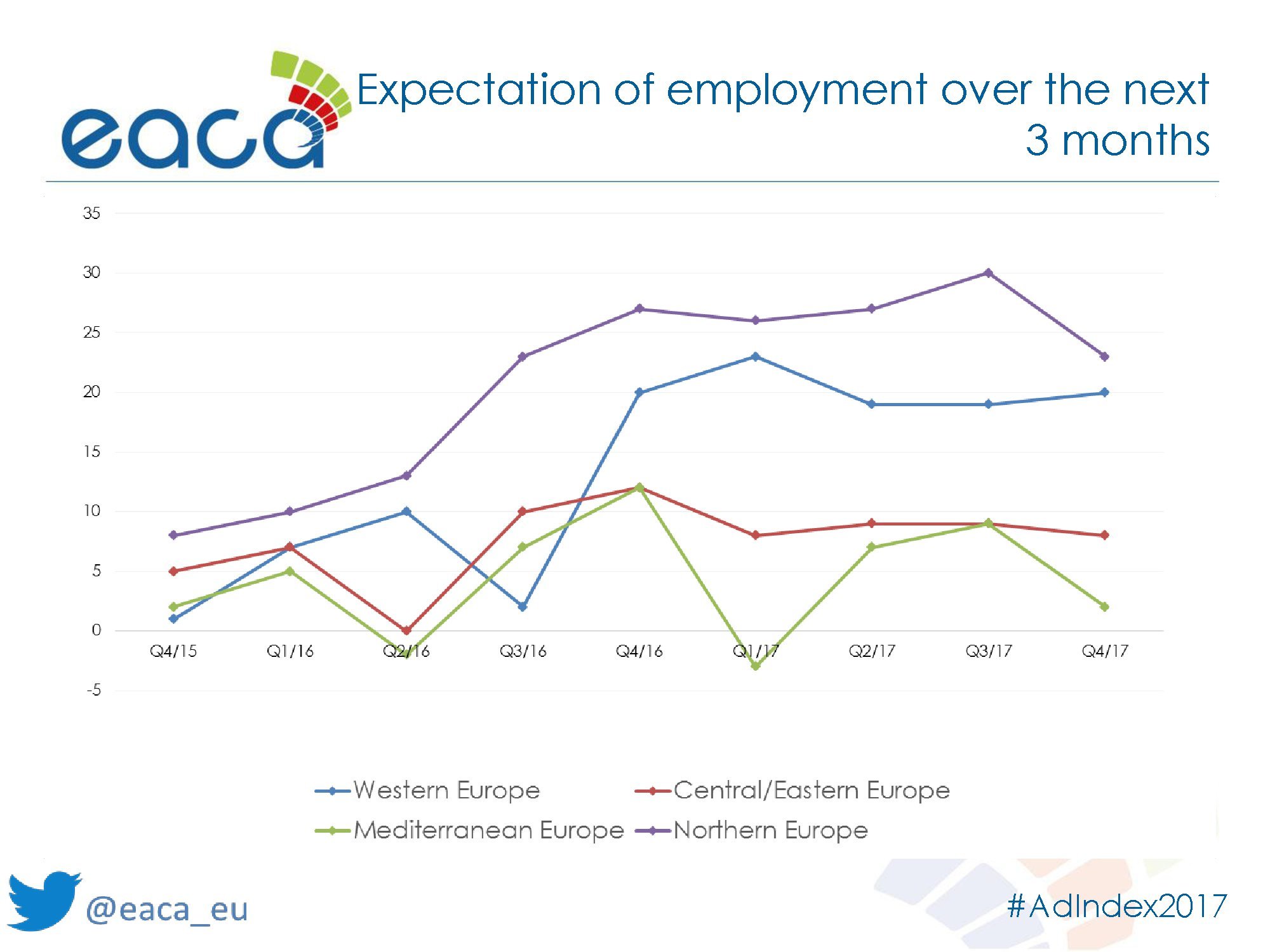 另外,广告行业的就业形势也有所改善。就业指数从第二季度的-1上升到+5。就业人数增长改善了整个广告业务格局。目前,劳动力不足仅占广告业务增长制约因素的9%,和第二季度(14%)比明显下降。但是,北欧国家和地中海国家广告就业形势将继续恶化。