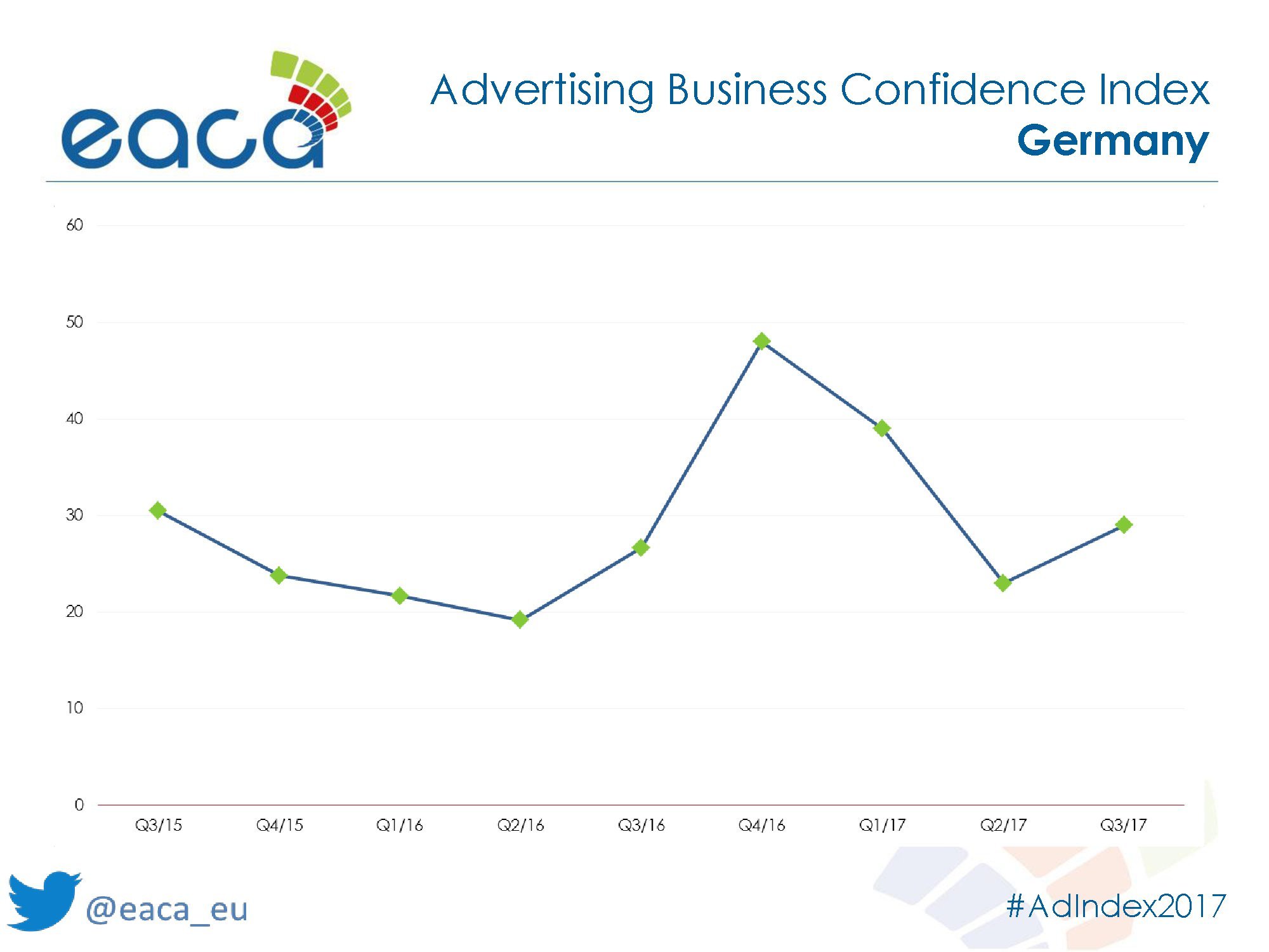 欧洲广告市场份额最大的四个国家中,每个国家的信心水平都所有改善,但是,英国、意大利和法国仍然是负值。英国广告业信心指数从前一个季度的-29上升至第三季度的-17.9;意大利广告业信心指数从-21上升至-5;而法国则保持在-5。德国的信心指数则从+23上升到+29。尽管,英国第三季度的指数更为乐观,仍然是欧洲最低指数。另一方面,德国则是欧洲广告信心的最高指数。