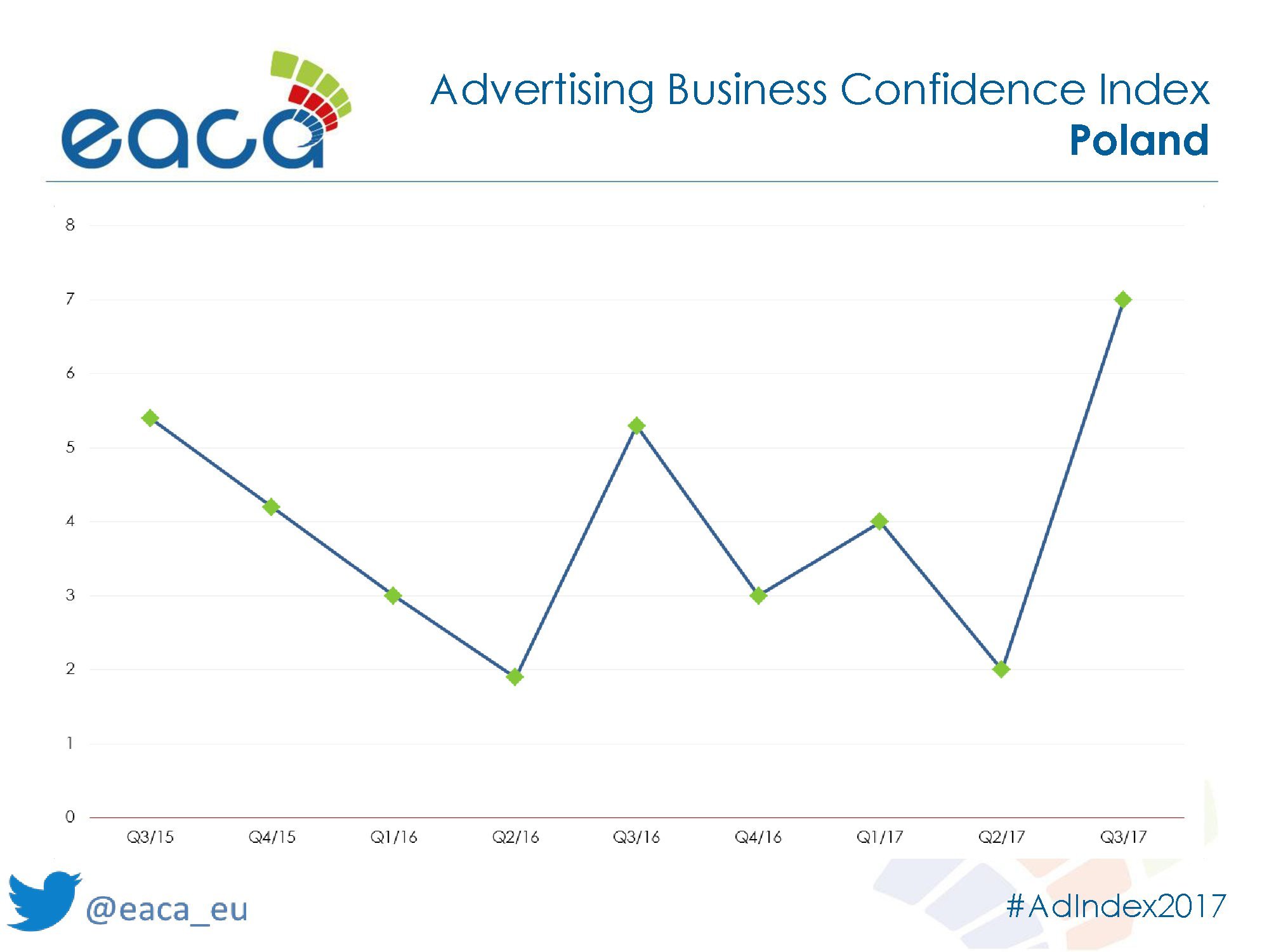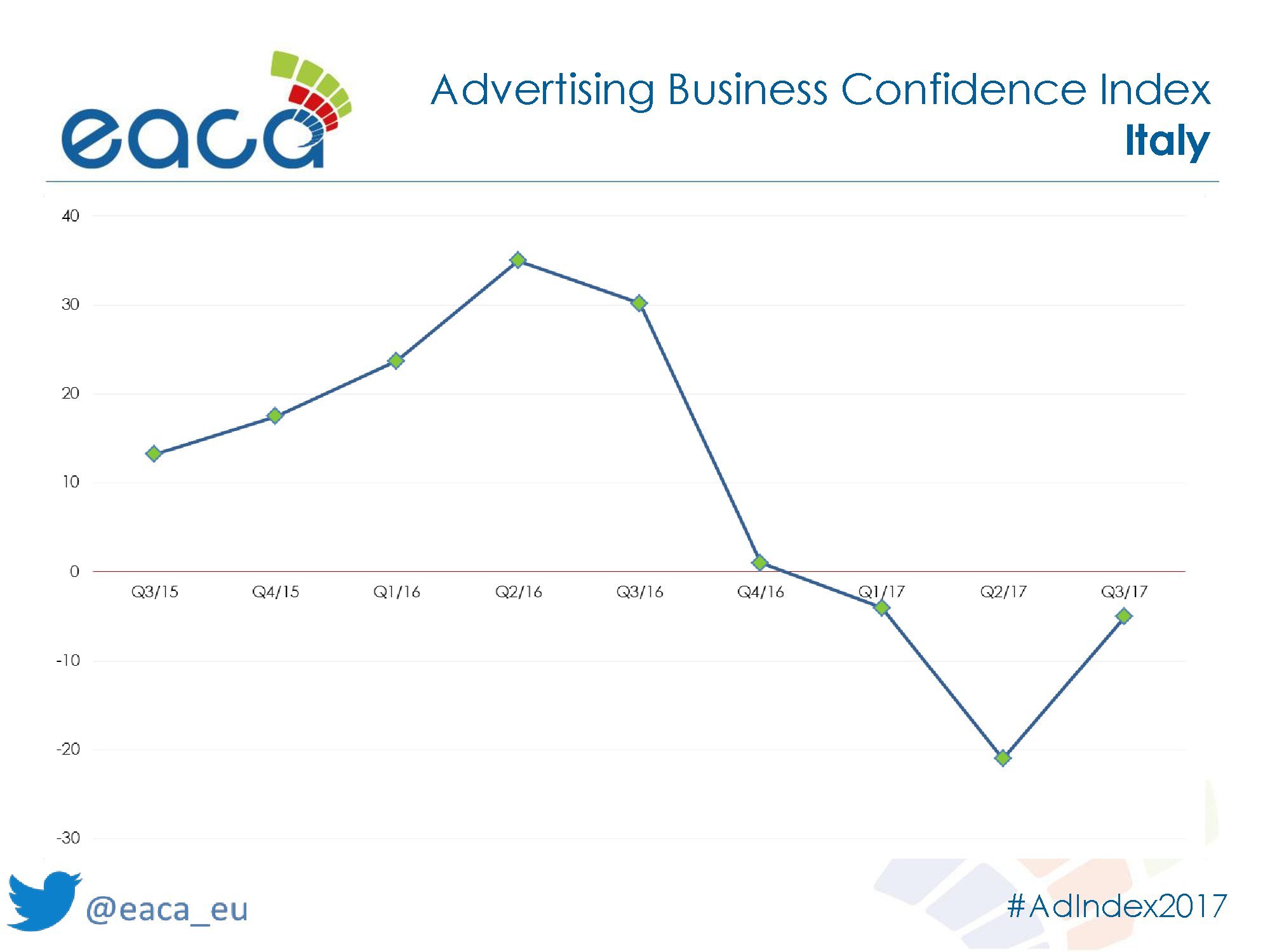 第四季度,广告业整体信心指数有所改善的两个国家是意大利(从-21上升到-5)和塞浦路斯(从-22上升到+13)。
