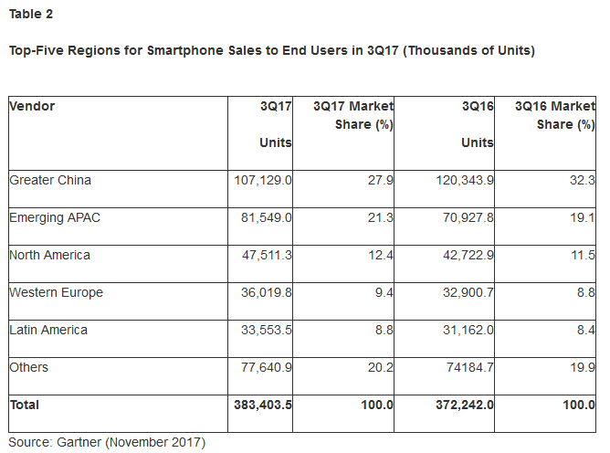 Gartner研究总监Anshul Gupta表示:“尽管中国市场疲软,智能手机的销量在2017年第三季度仍有所增长。亚太新兴地区(15%)和北美(11.2%)推动了智能手机在这一季度的增长。”