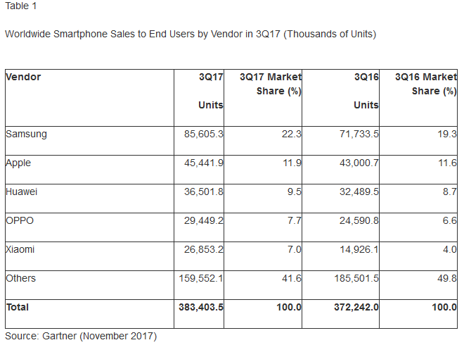 根据Gartner公司的数据,2017年第三季度智能手机全球总销量为3.83亿部,较2016年同期增长3%。除苹果(5.7%)以外,所有五大智能手机厂商均实现了两位数的增长。