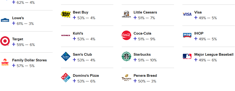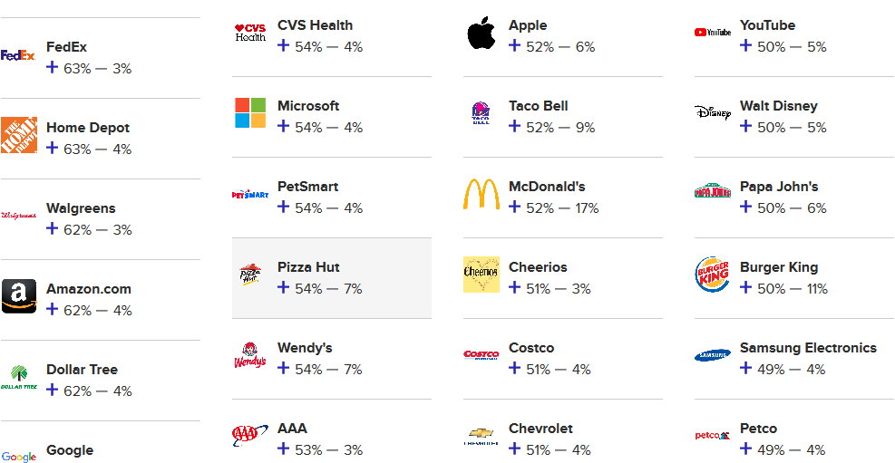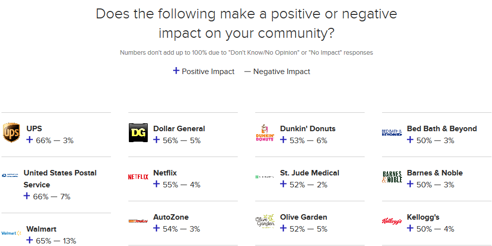 虽然亚马逊(#7)没有进入前五名,仍然是美国人认为对社区最有积极影响的网络科技品牌,与谷歌获得相同分数。在前十名中,我们看到还有像沃尔玛、Walgreens和Lowe’s这样的零售品牌。这也符合分析结果。