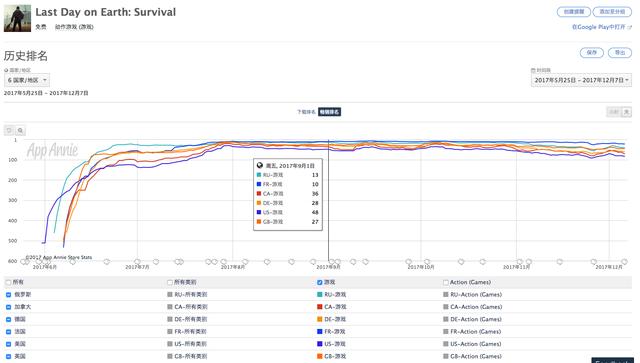下图:《Last Day on Earth: Survival》进入多个欧美市场的游戏收入榜前 100 名