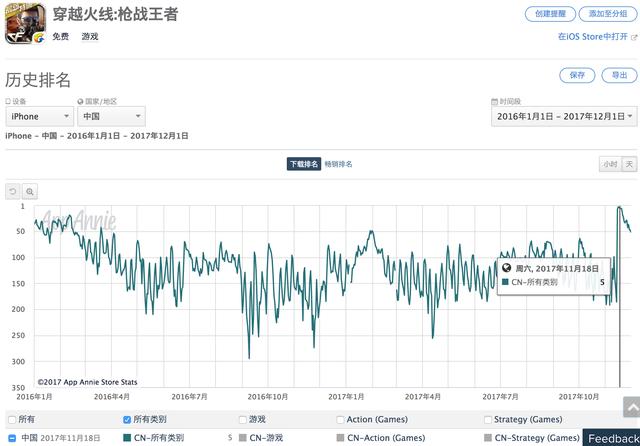 下图:腾讯已经上线两年余的《穿越火线》在 11 月 15 日加入类似 PUBG 玩法的荒野行动模式后,重回 iOS 中国区下载总榜前 5 名
