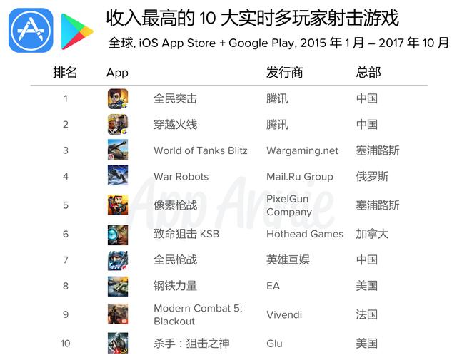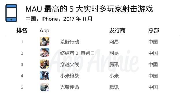 11 月,中国 iOS 商店五大实时多玩家射击游戏的 MAU 总和已经超过一千万。