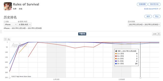 各大手游厂商在年中开始研发移动端的同样玩法的游戏,并且在 10 月起陆续推向应用商店。11 月的全球榜单中,射击+生存类游戏已经独占鳌头,挤下了排行榜上霸榜已久的《王者荣耀》。