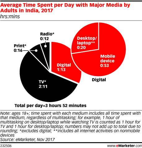 eMarketer预计,2017年,印度人平均每天花3小时52分访问主流媒体。网络将推动未来几年印度媒体访问量的增长,尤其是手机。