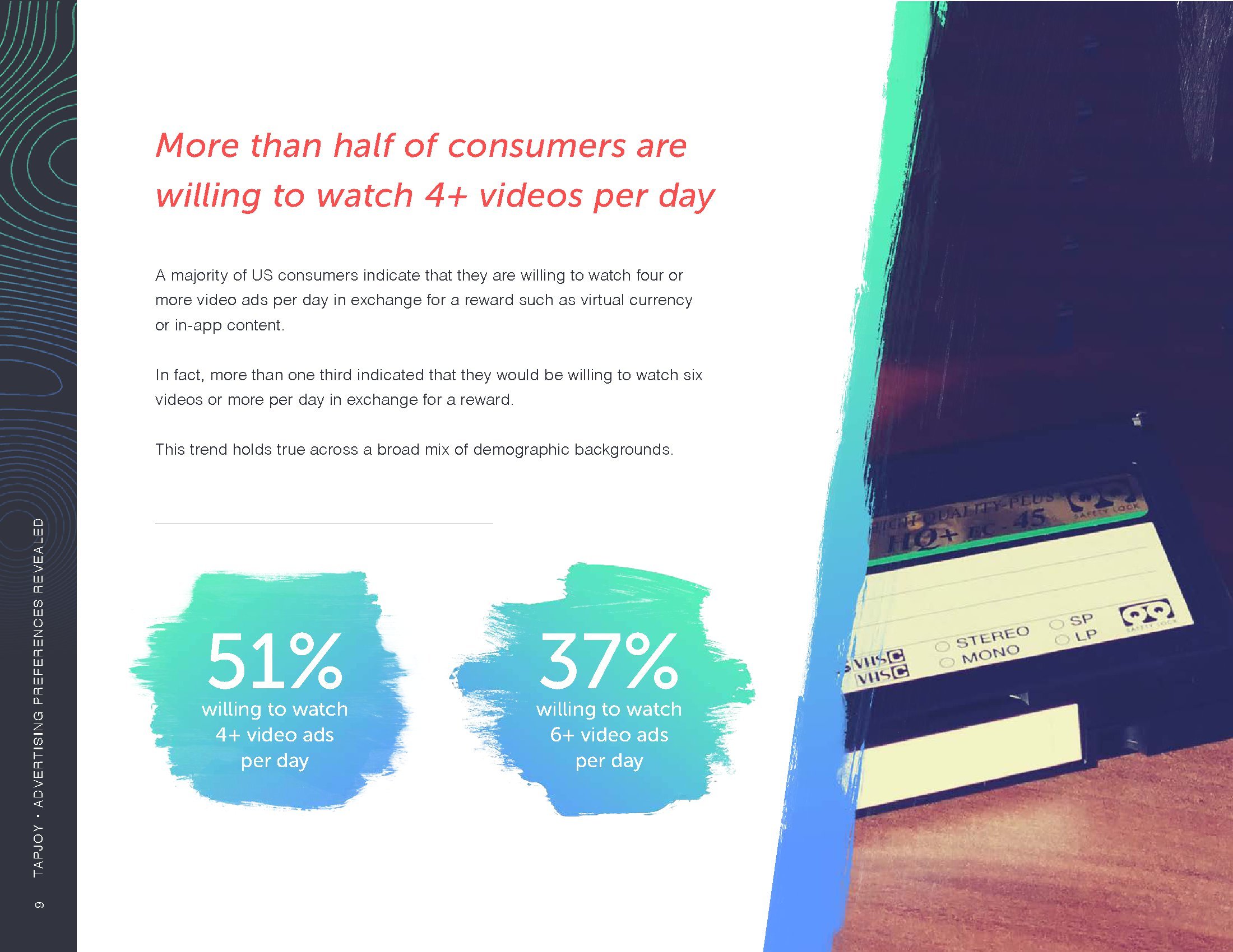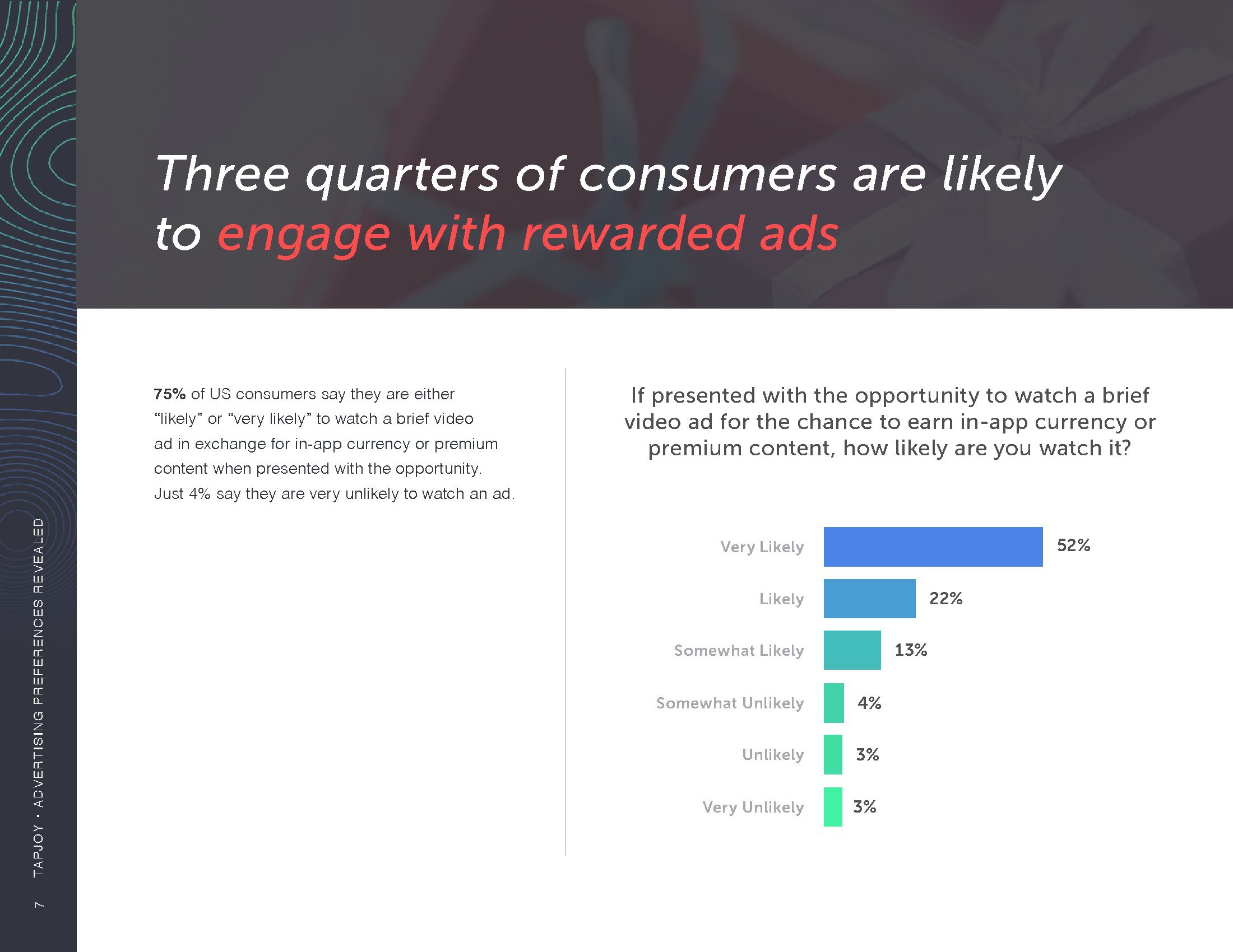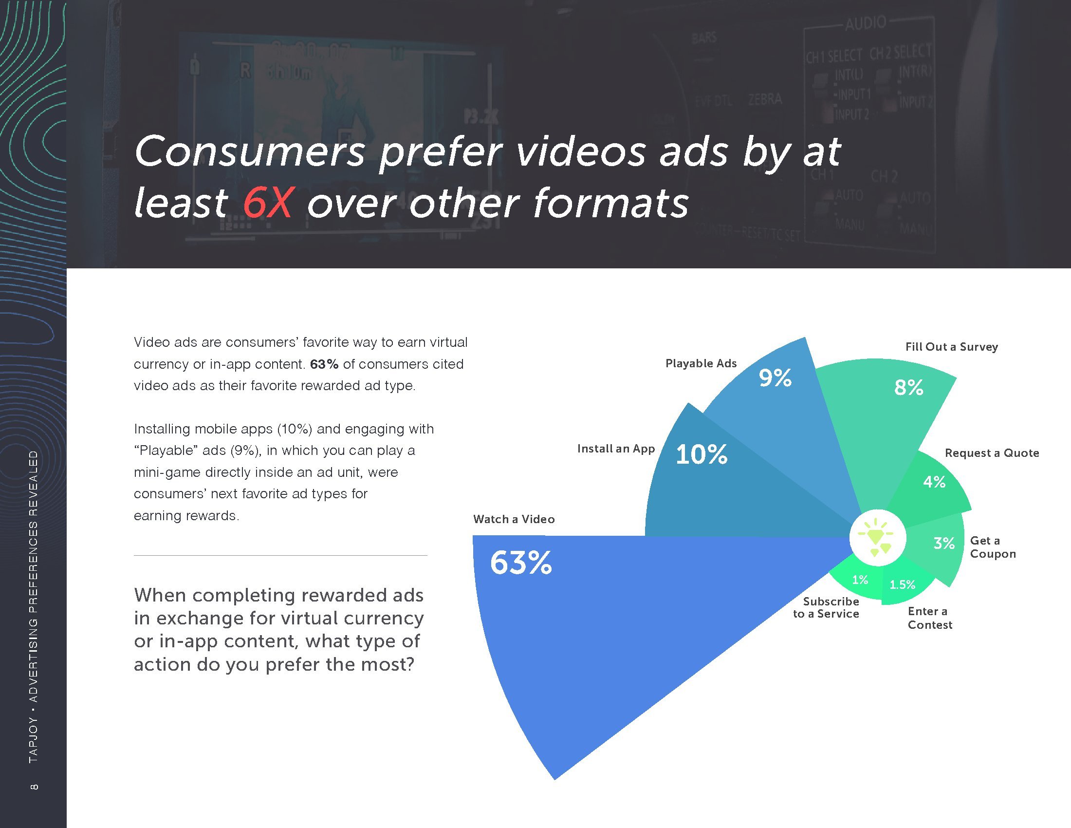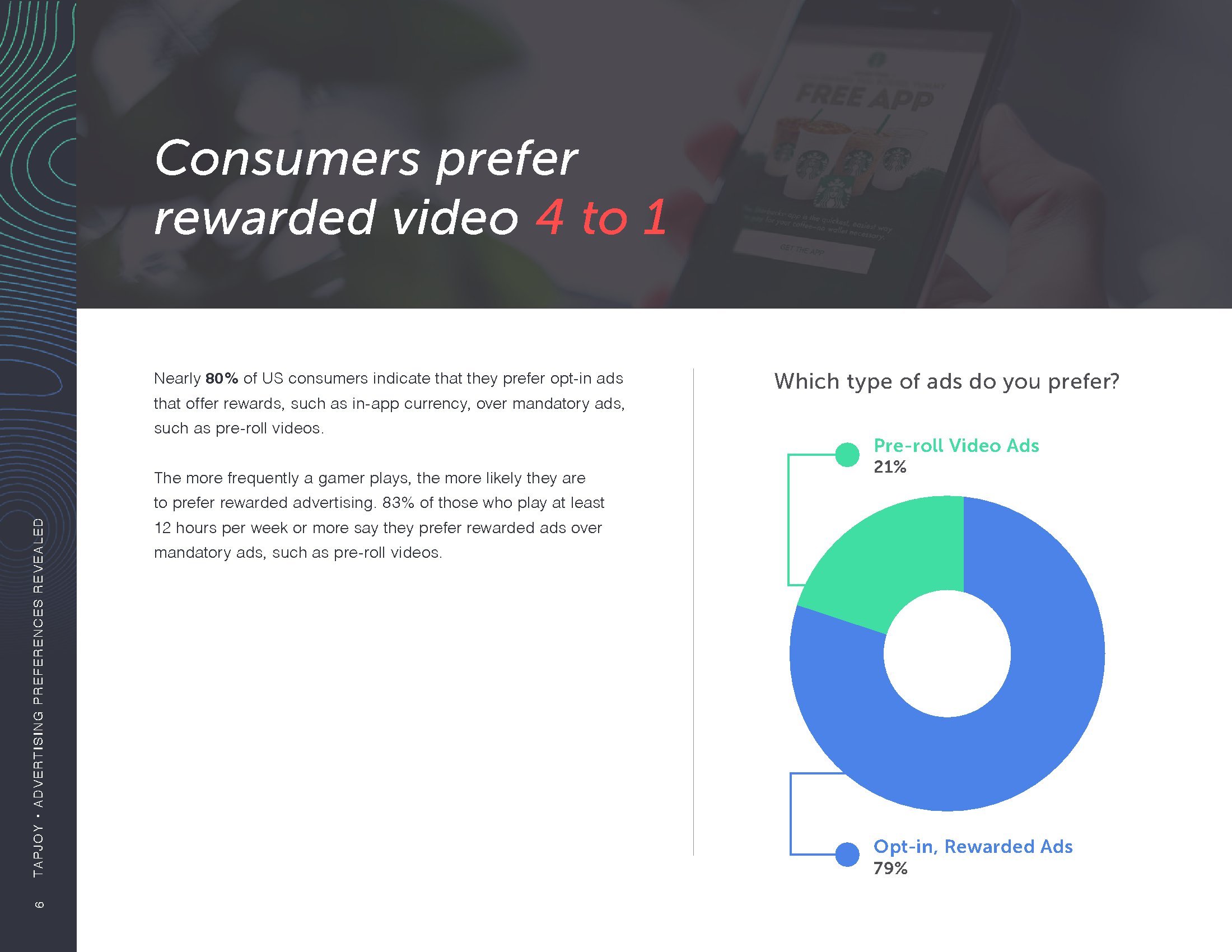 奖励性视频广告和调查最吸引游戏玩家。Tapjoy调查了假期手游玩家最可能参加什么类型的奖励性广告,视频广告是最受欢迎的,其次是调查,安装新的游戏或应用。