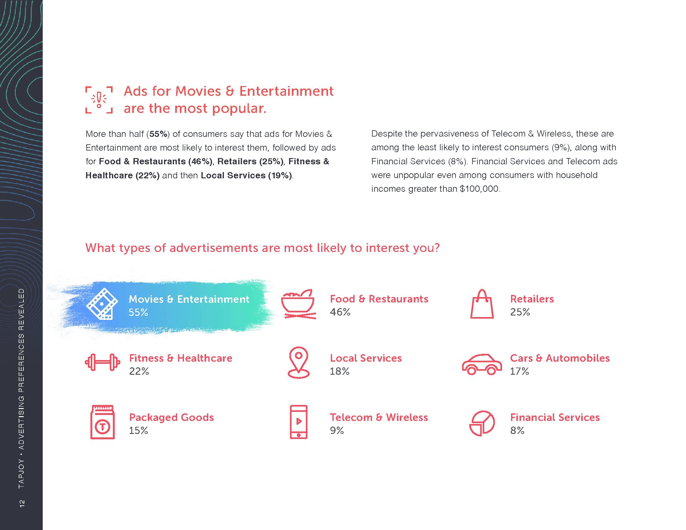 假日期间,游戏玩家可能对电影预告片和娱乐广告最感兴趣。当被问及节日期间人们最感兴趣的广告类型时,手机游戏玩家表示最有可能点击来自娱乐品牌的预告片或广告,其次是其他手机游戏或应用的广告。