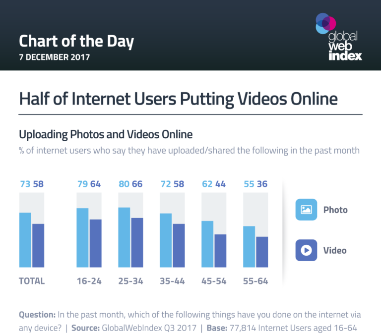 根据GWI的调查,近3/4的网民上个月在社交媒体上分享过照片,但是,视频也差不多。6/10的网民上个月在社交网络上分享过视频。和分享照片一样,上传视频在25-34岁(66%)的受访者中达到顶峰,只有36%的55-64岁网民上个月分享过视频。